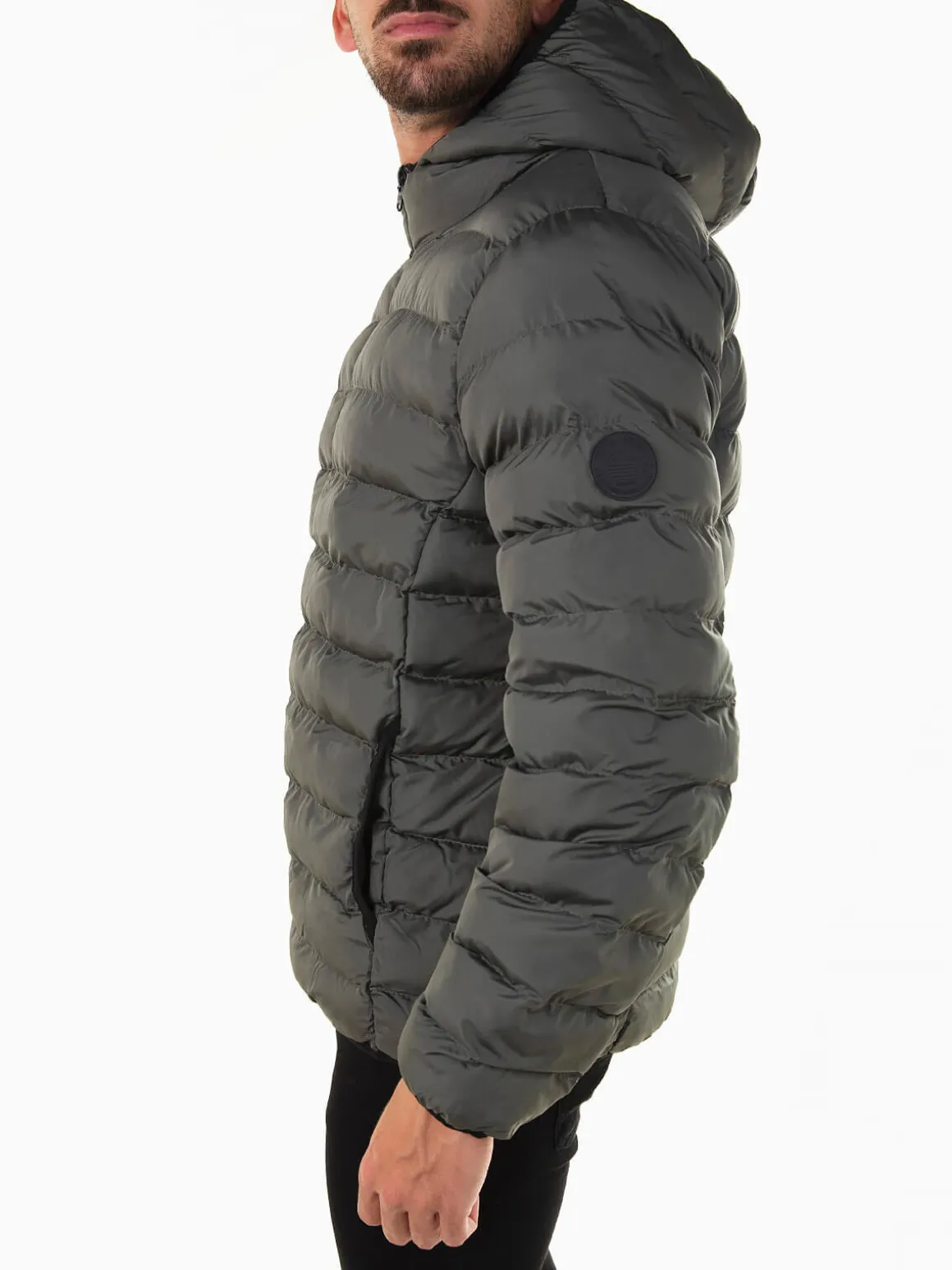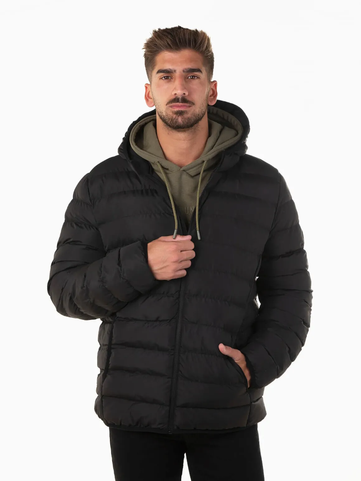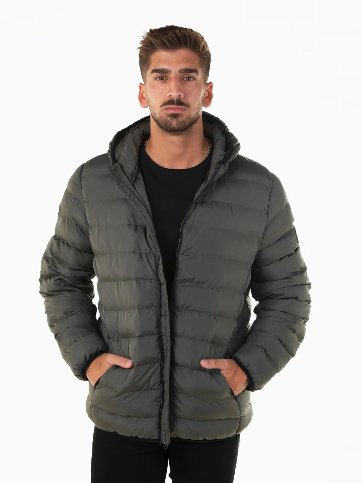 Blusão acolchoado para homem com capuz e fecho de zíper. Modelo prático com dois bolsos exteriores e um bolso interior. Leve e confortável, ideal para os dias frios — garante proteção e estilo em qualquer look casual.Altura do Modelo: 182 cm | Tamanho: L