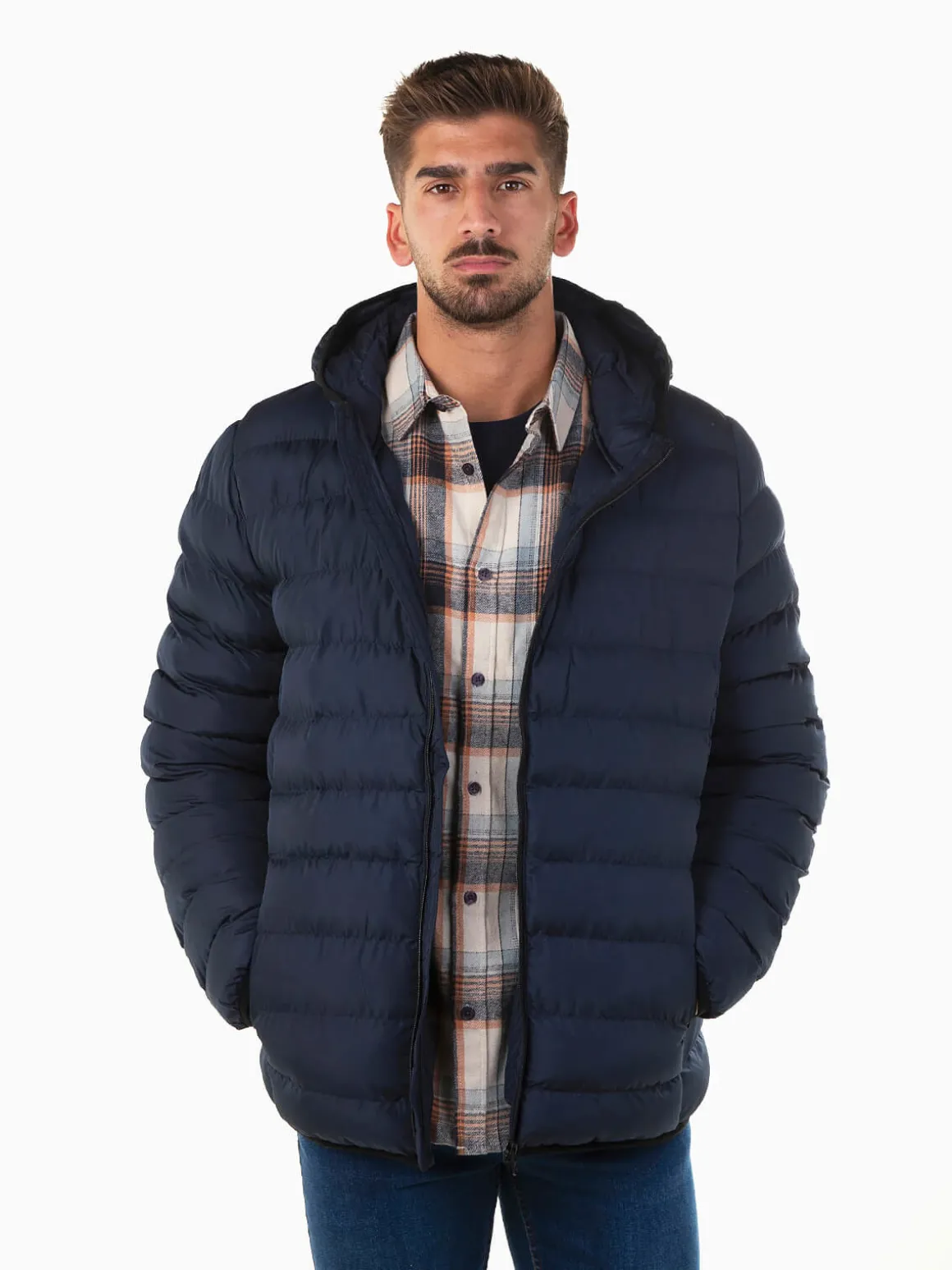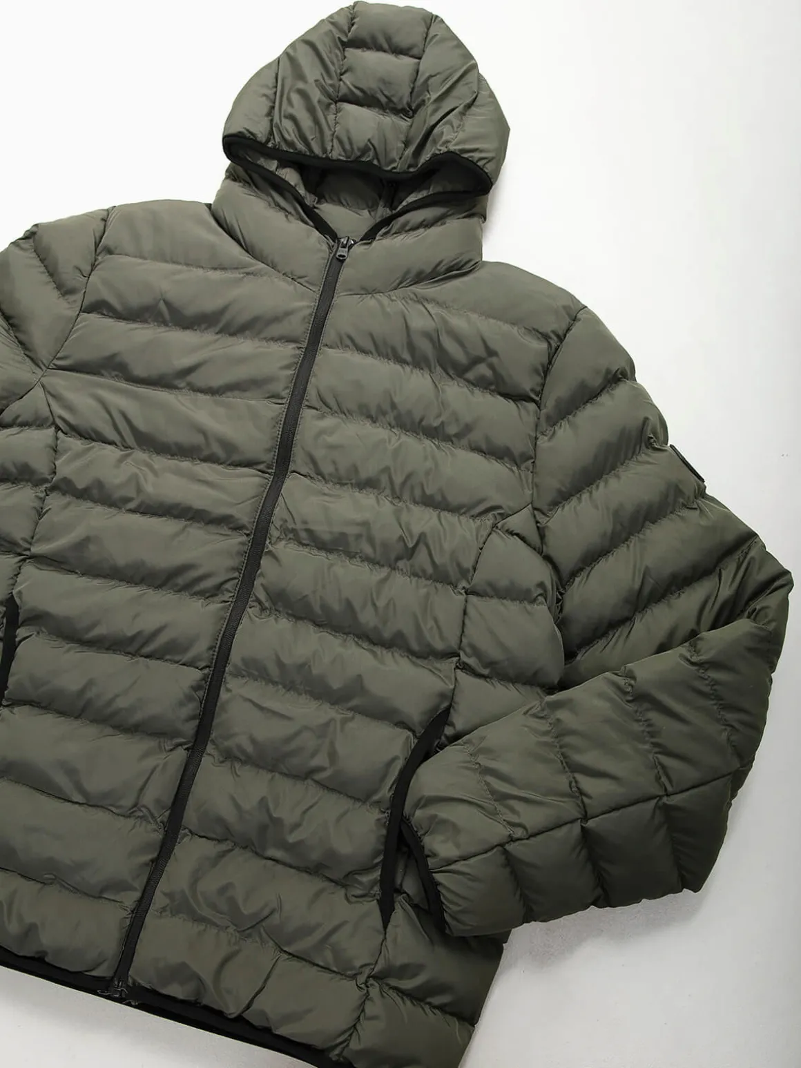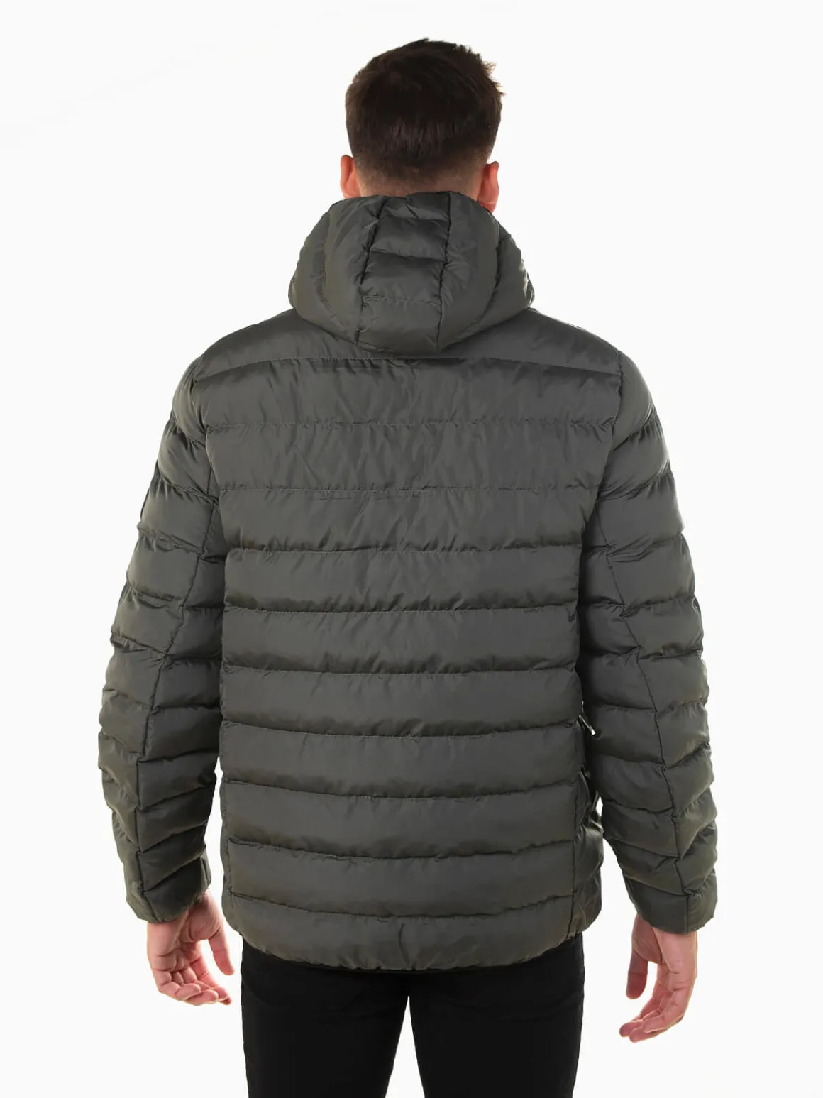Blusão acolchoado para homem com capuz e fecho de zíper. Modelo prático com dois bolsos exteriores e um bolso interior. Leve e confortável, ideal para os dias frios — garante proteção e estilo em qualquer look casual.Altura do Modelo: 182 cm | Tamanho: L
