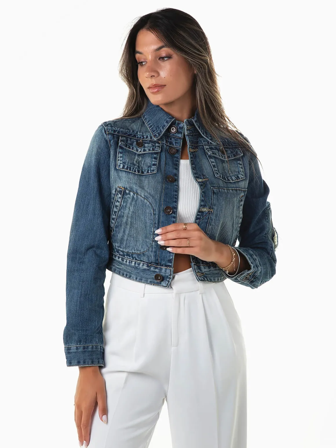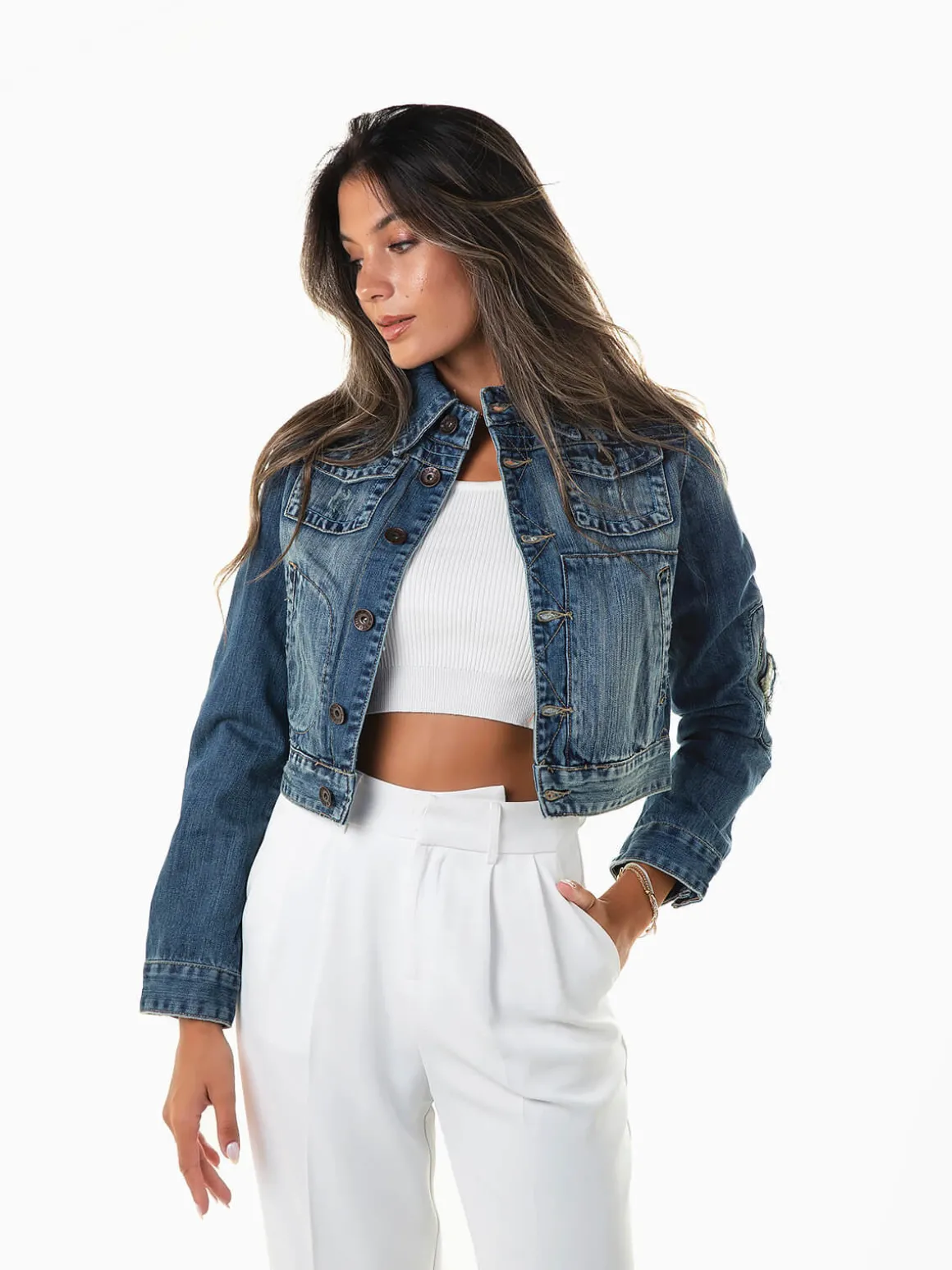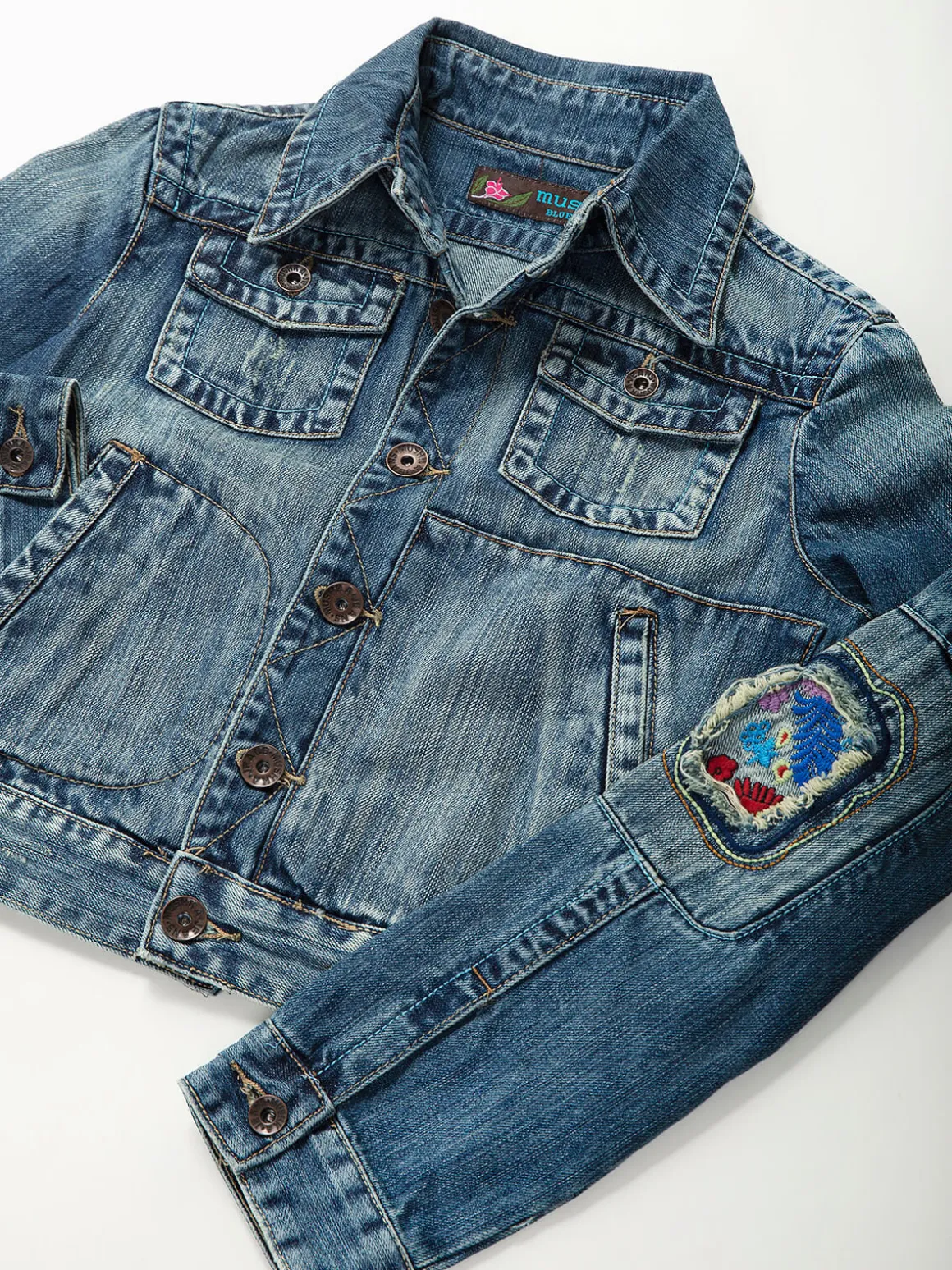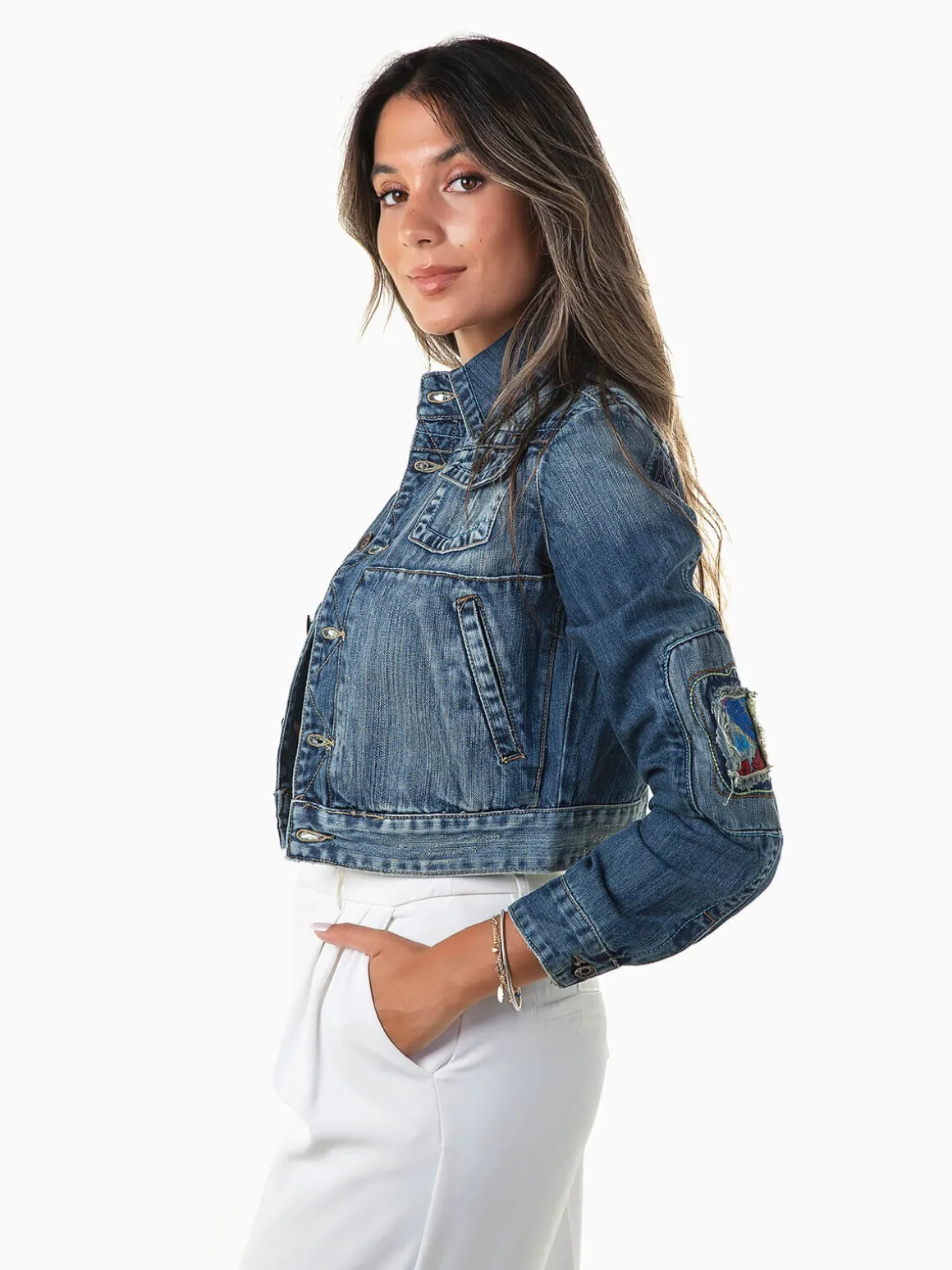 Blusão de ganga curto com bordados coloridos na manga. Casaco denim manga comprida com punhos abotoados. Lavagem azul escuro. 4 bolsos e dois na parte posterior. Gola abas. Aperto de botões. Altura da Modelo: 175 cm | Tamanho: S