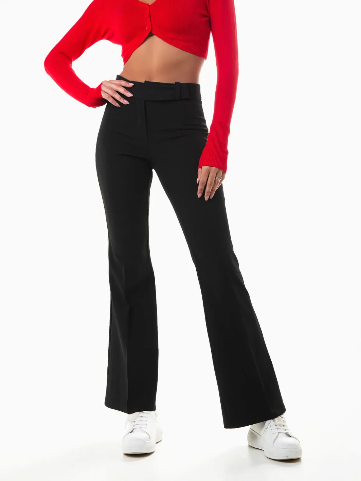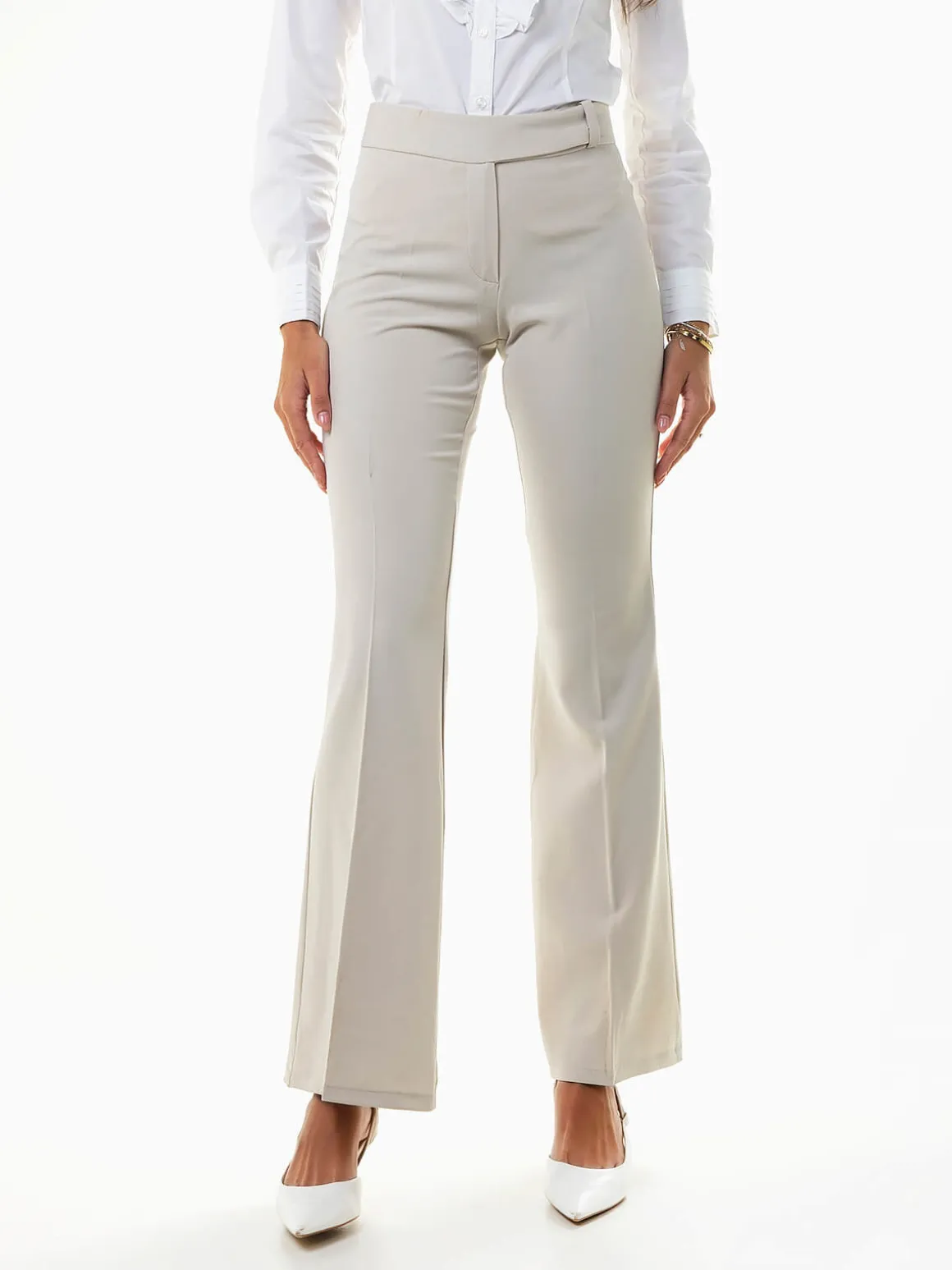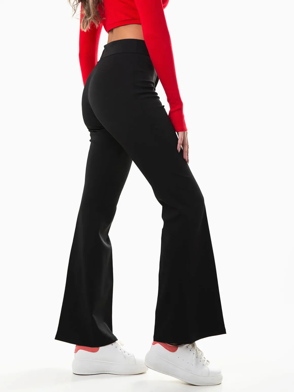 Calças à boca de sino com pormenor de pinças à frente. Calças elásticas de cintura alta com aperto de fecho éclair e 3 botões. Altura da Modelo: 175 cm | Tamanho: S