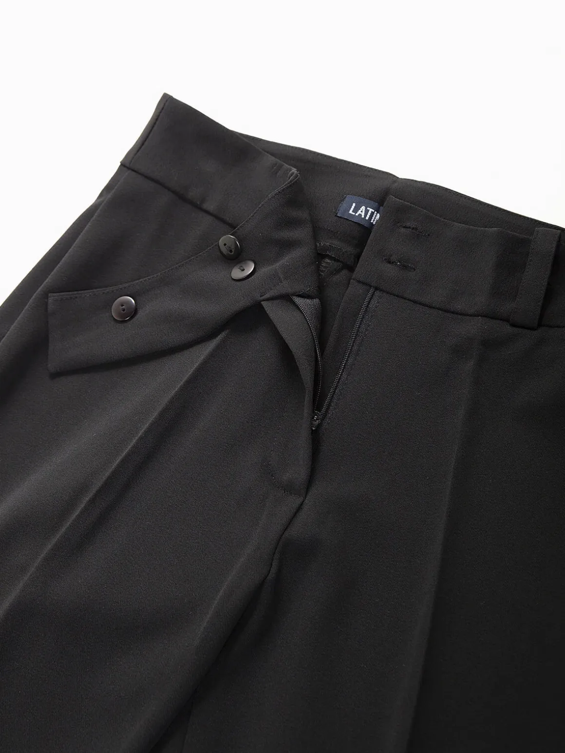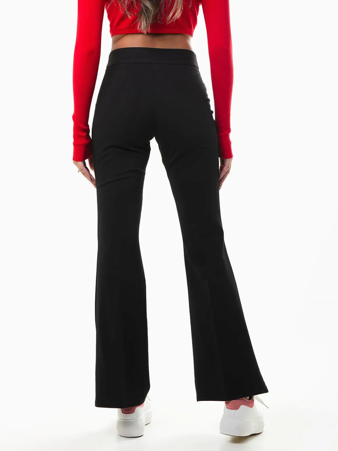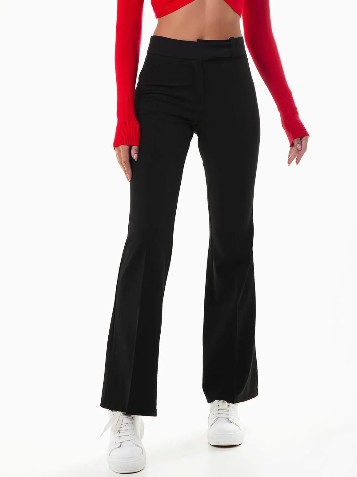 Calças à boca de sino com pormenor de pinças à frente. Calças elásticas de cintura alta com aperto de fecho éclair e 3 botões. Altura da Modelo: 175 cm | Tamanho: S