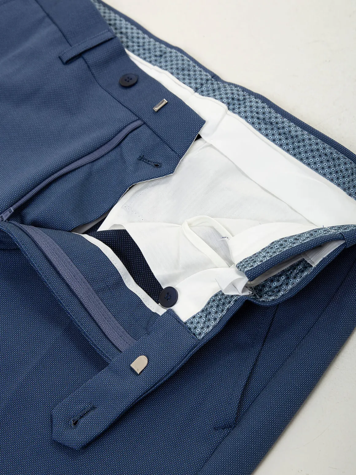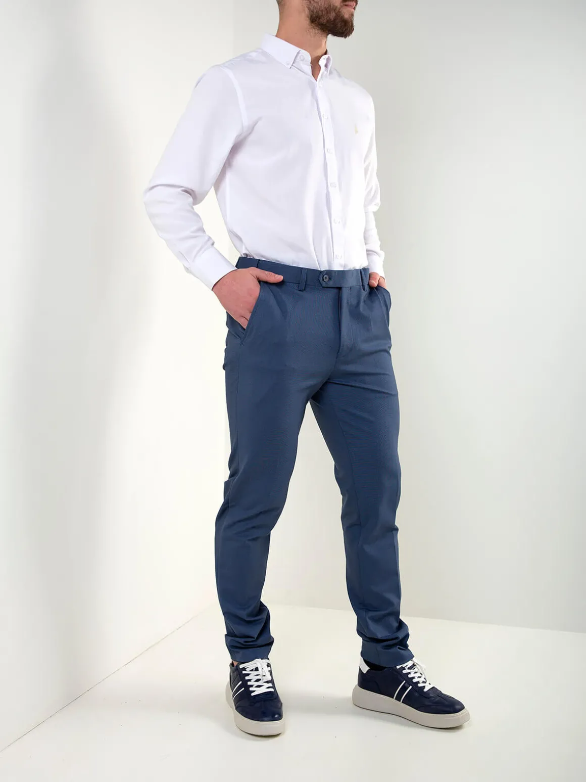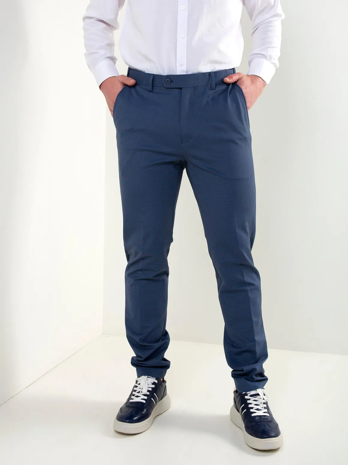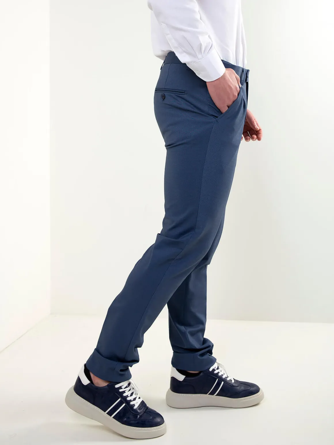 Calças chino azuis com micro padrão discreto. Modelo confortável e versátil, com bolsos laterais, bolsos posteriores com botão e elástico interior na cintura para melhor ajuste.Altura do Modelo: 182 cm | Tamanho: 44