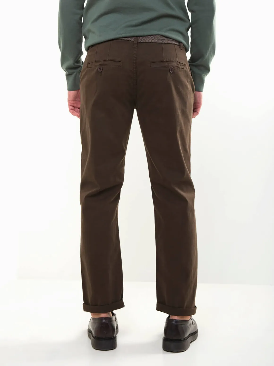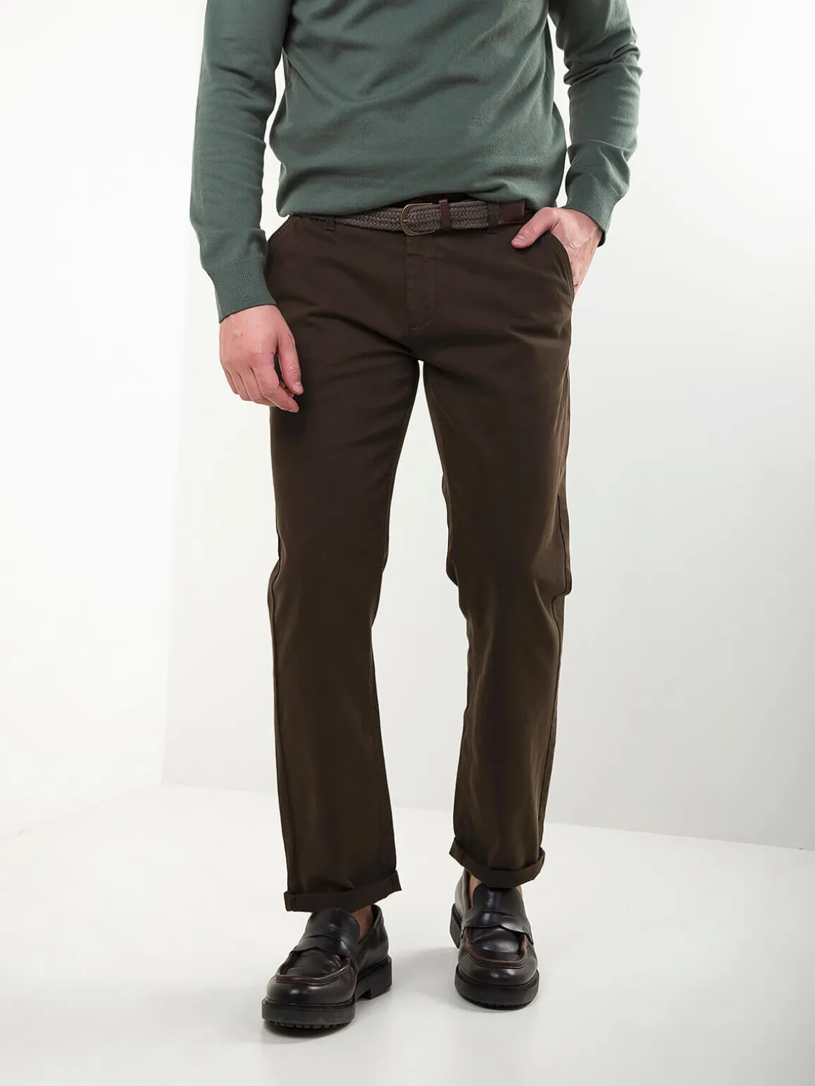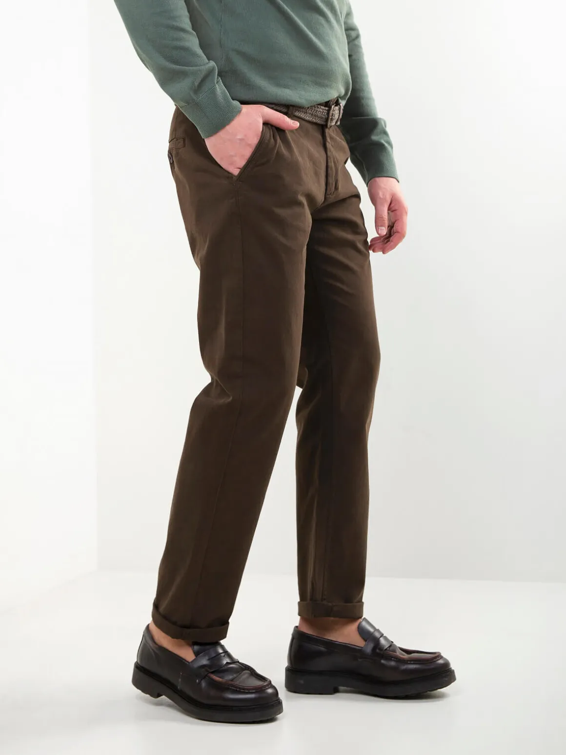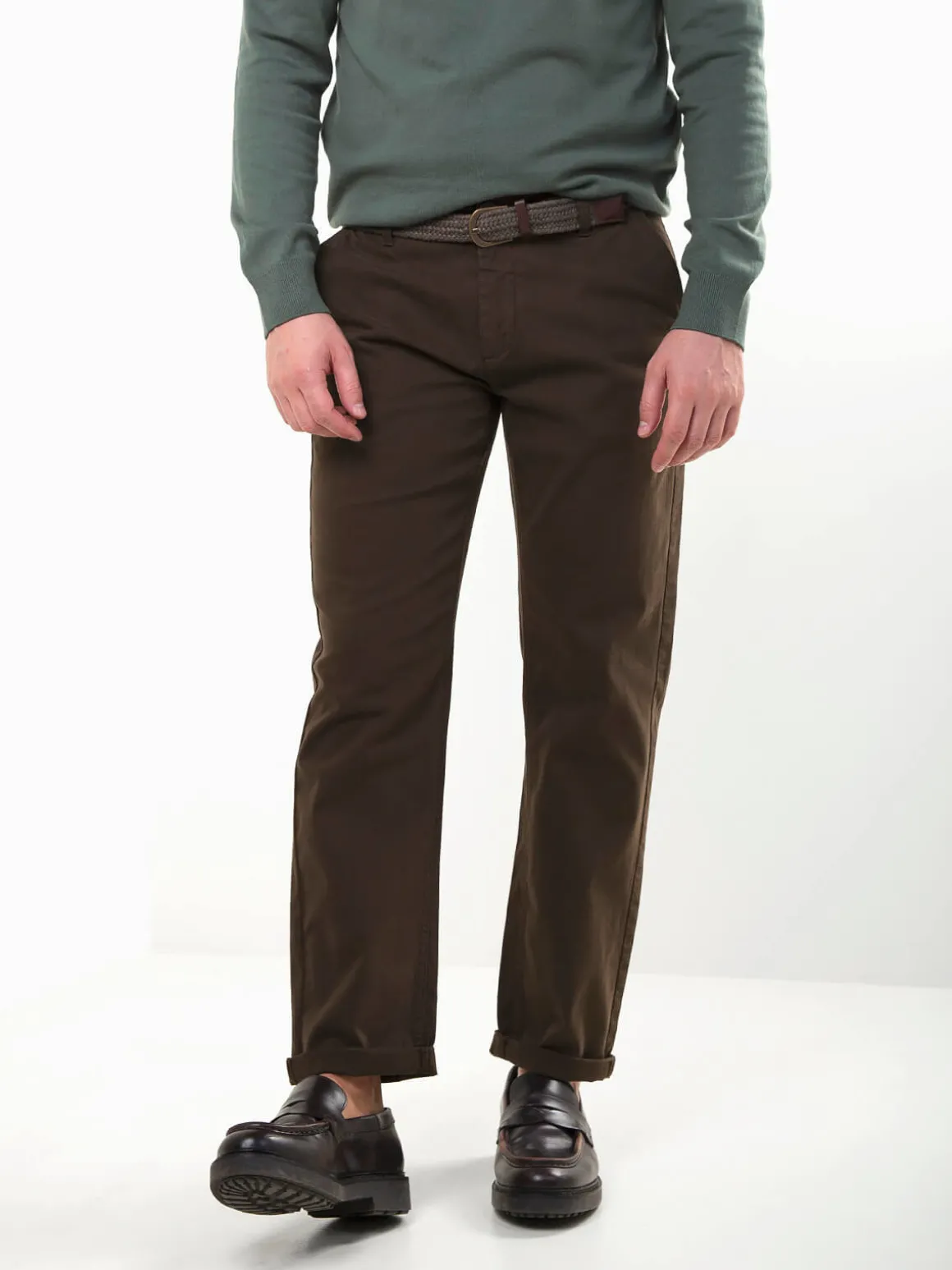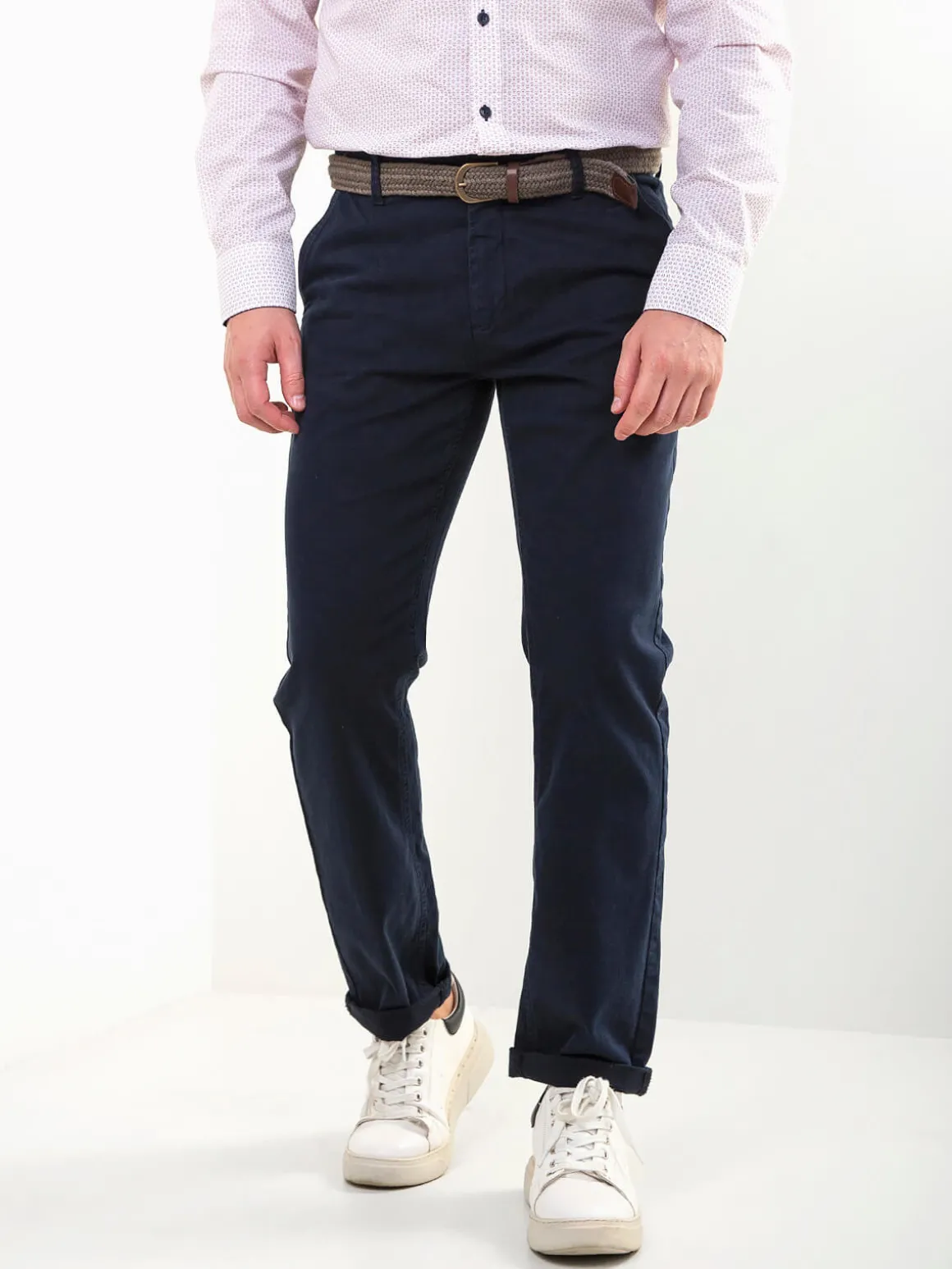 Calças chino em sarja de algodãoo, com cinto entrançado. Modelo clássico e confortável com 4 bolsos. Um básico versátil para o dia a dia, fácil de combinar com camisolas, polos ou camisas.Altura do Modelo: 180 cm | Tamanho: 42