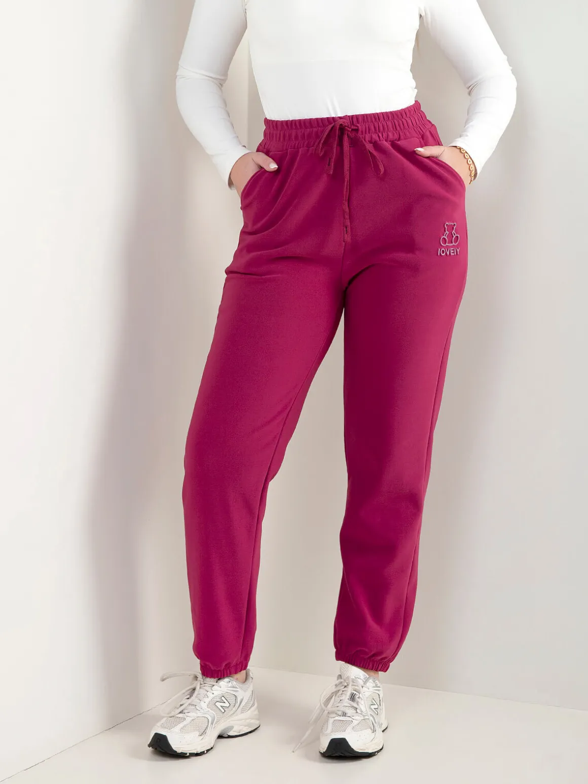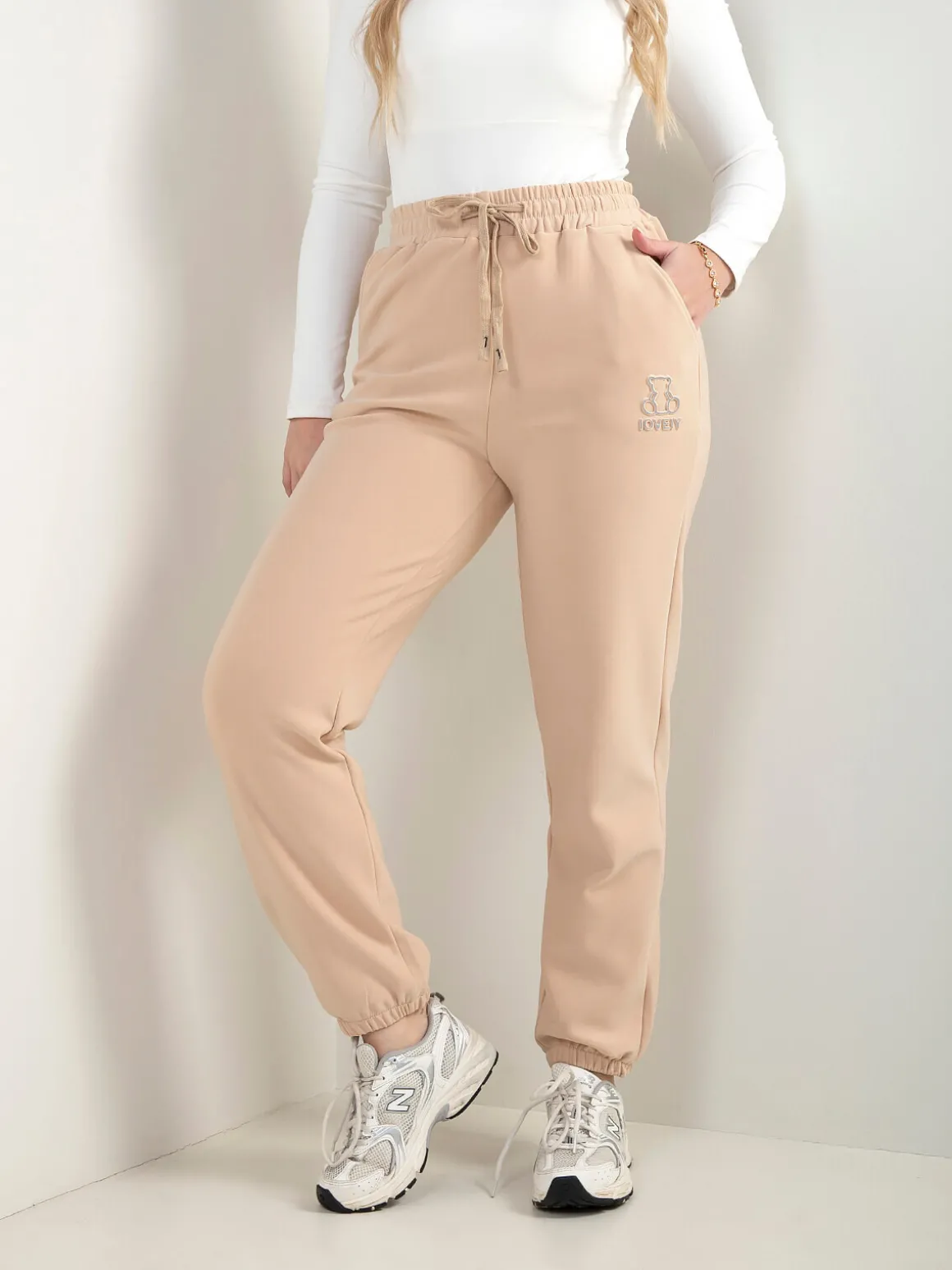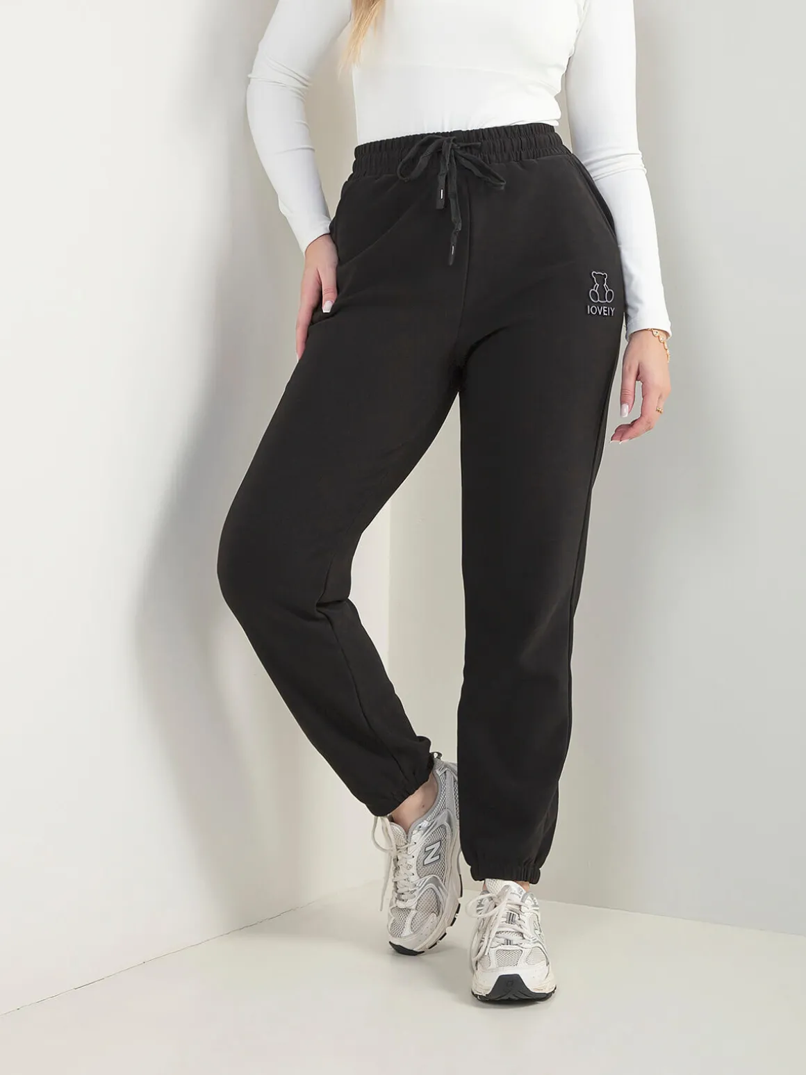 Calças comfy com cintura elástica e cordão ajustável. Têm 2 bolsos laterais e bordado de urso na perna. Interior cardado. Perfeitas para looks descontraídos do dia a dia.Altura da Modelo: 166 cm | Tamanho: M/L