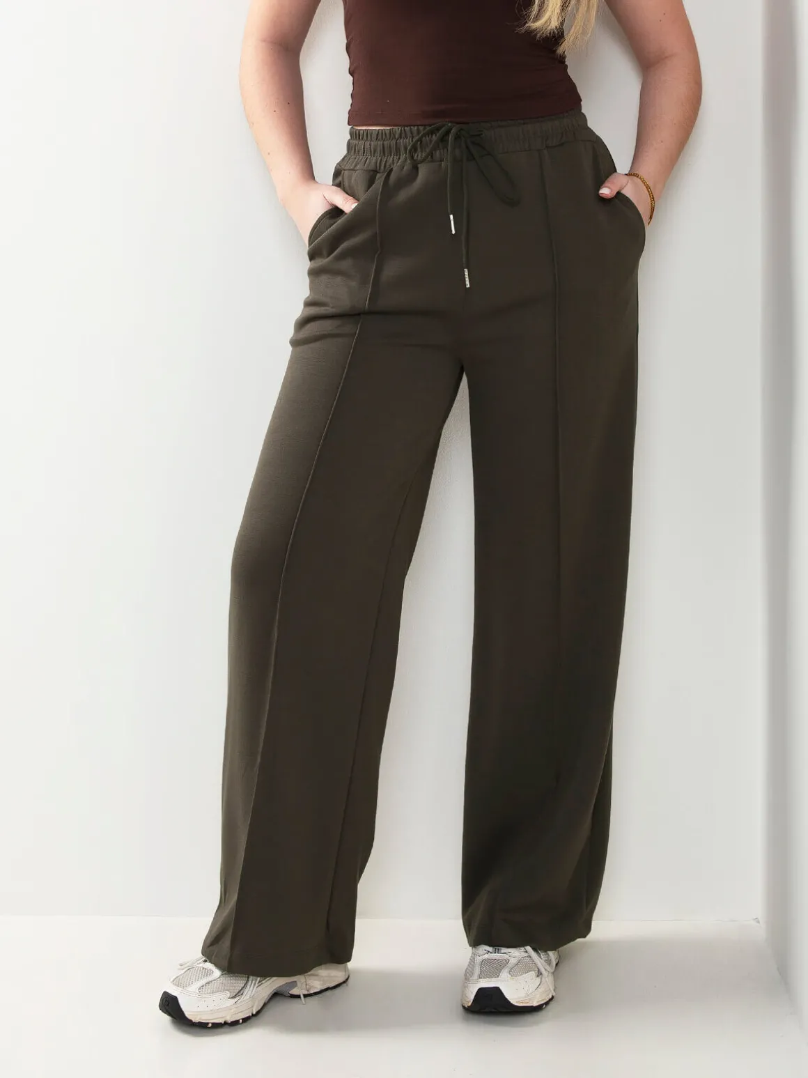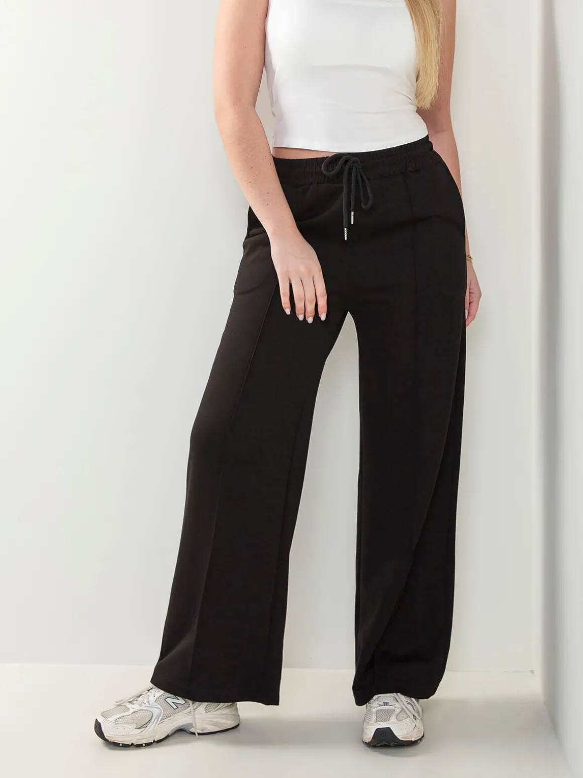 Calças de fato de treino com costura frontal marcada e cintura elástica com cordão ajustável. Modelo confortável com 2 bolsos, corte atual, perfeitas para combinar com sweatshirts ou blazers para um visual mais urbano.Altura da Modelo: 166 cm | Tamanho: M/L