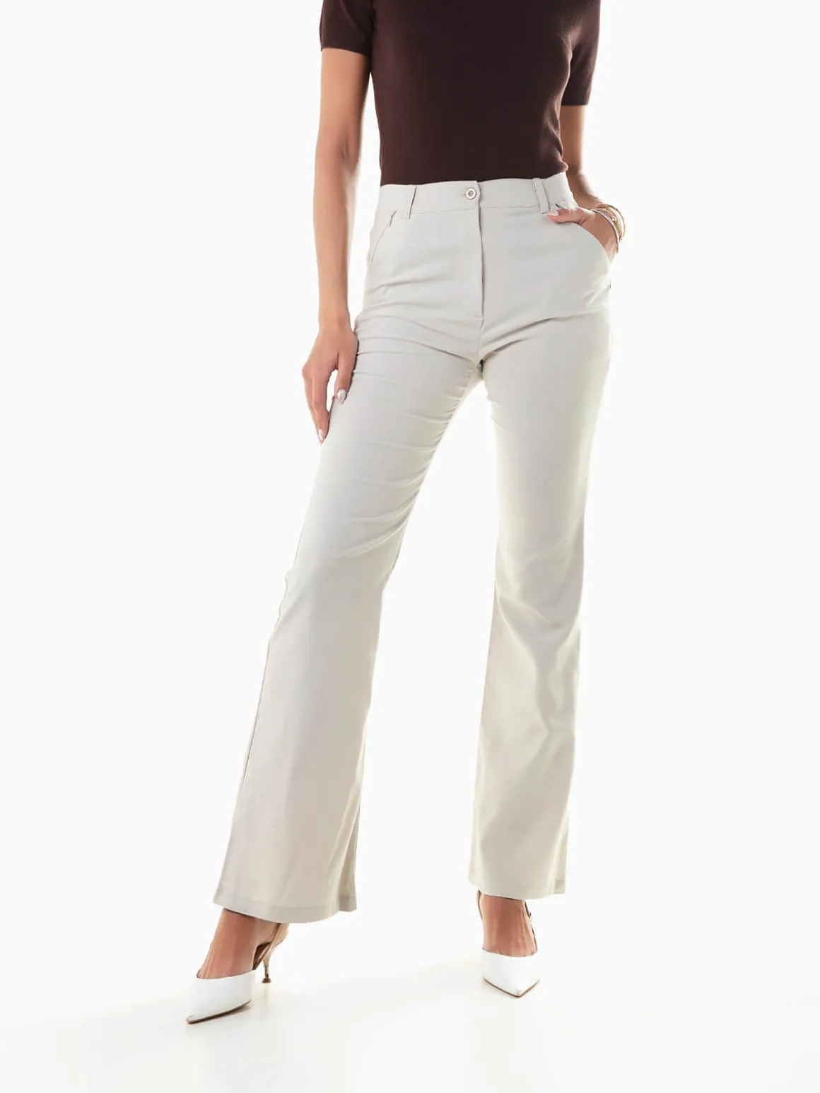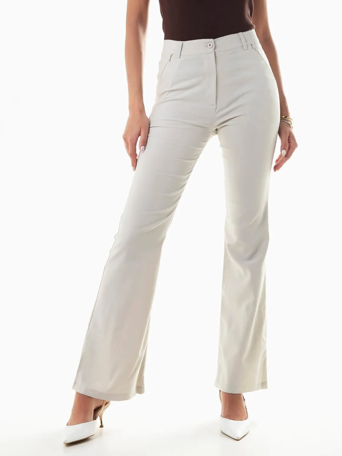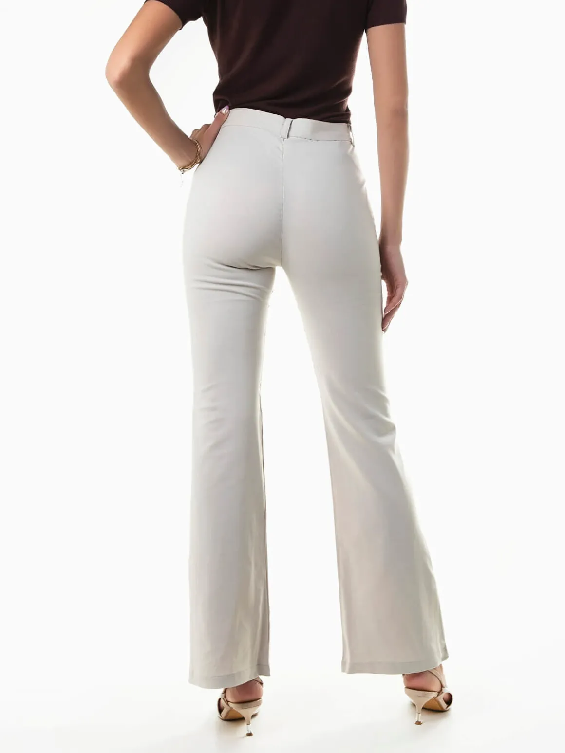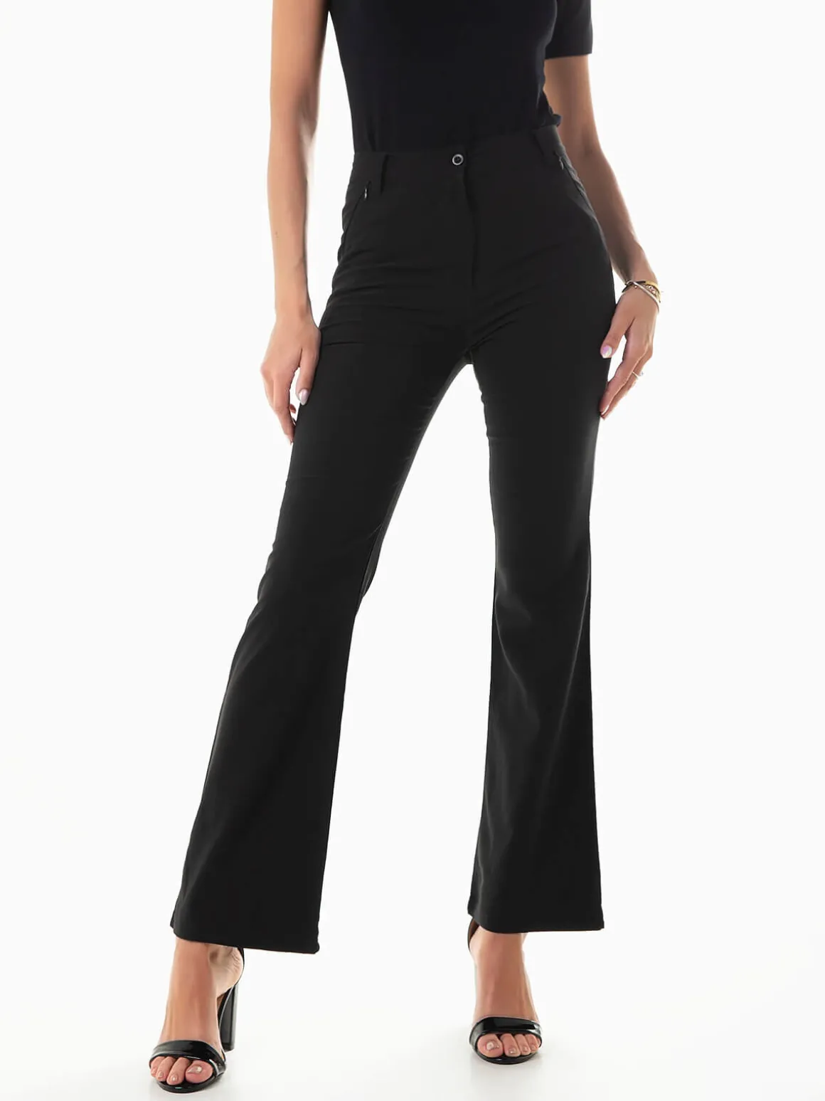 Calças de tecido formal à boca de sino para senhora. Calças elásticas de cintura alta com dois fechos invisíveis na frente. Aperto fecho éclair e botão.Altura da Modelo: 175 cm | Tamanho: M
