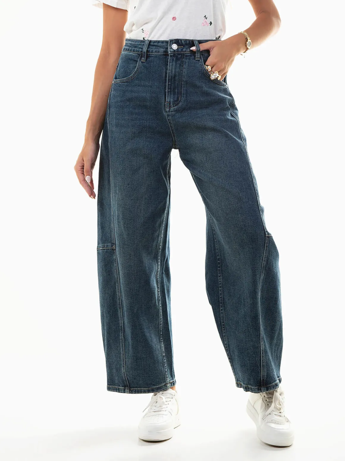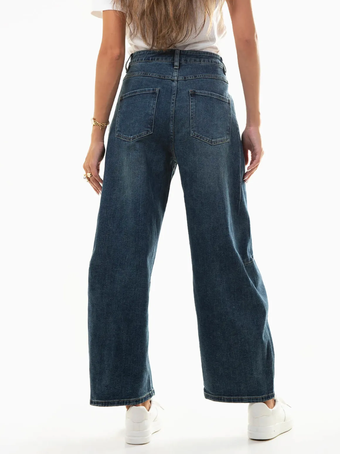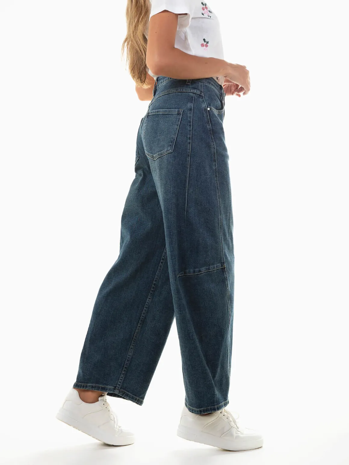 Calças de ganga barrel com cintura alta, lavagem azul escuro ‘lavado’, costuras laterais e 4 bolsos. Fecho de botão e éclair. Básicas, versáteis e com corte confortável para o dia a dia são perfeitas para combinar com t-shirts, blazers ou sapatilhas, criando looks versáteis do dia a dia.Altura da Modelo: 175 cm | Tamanho: S