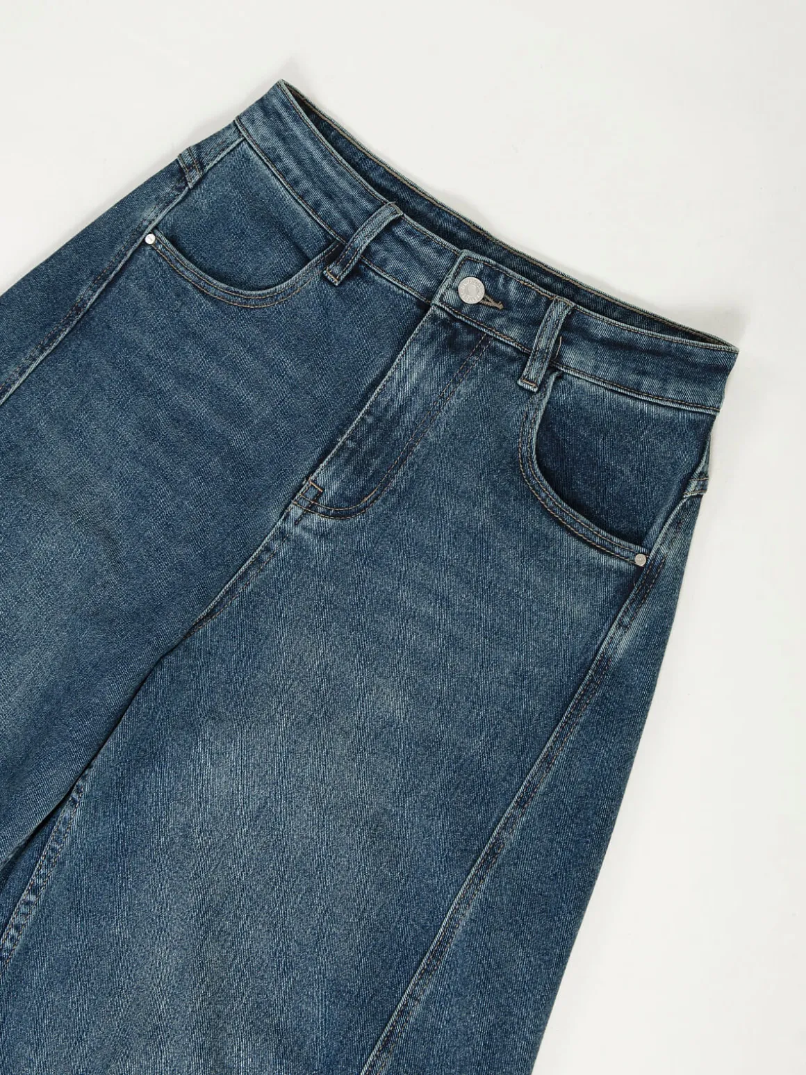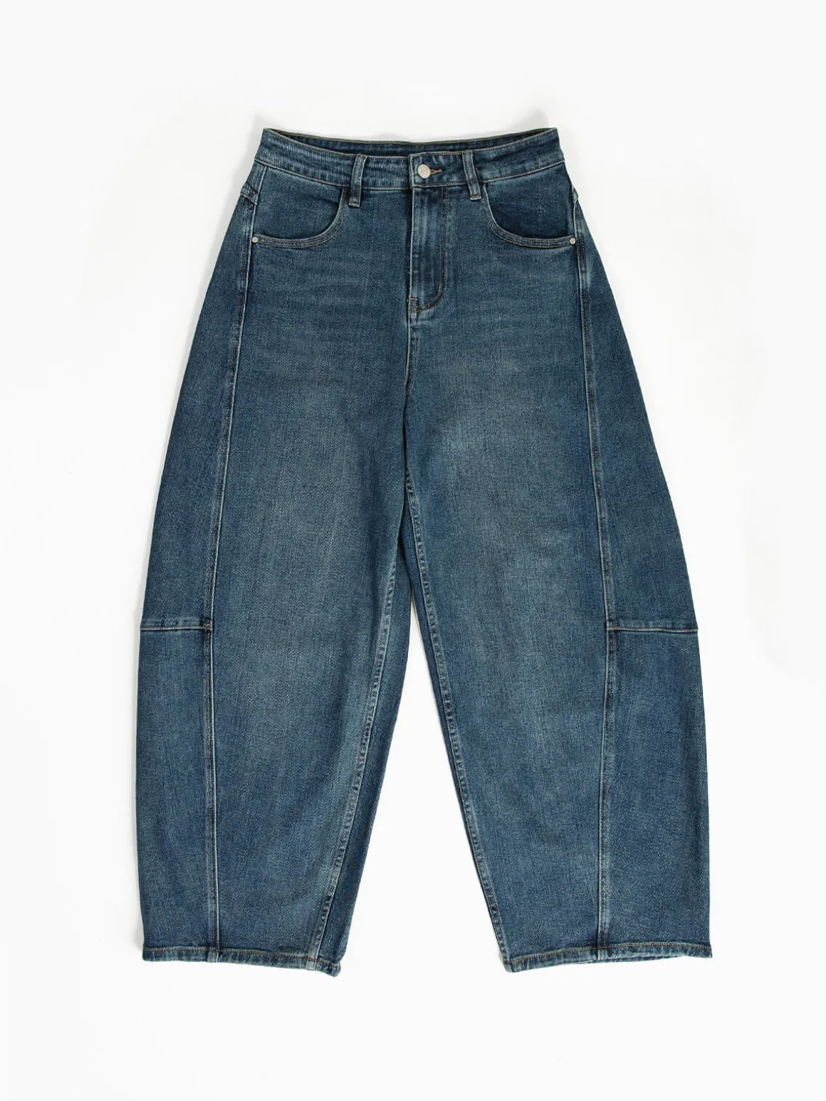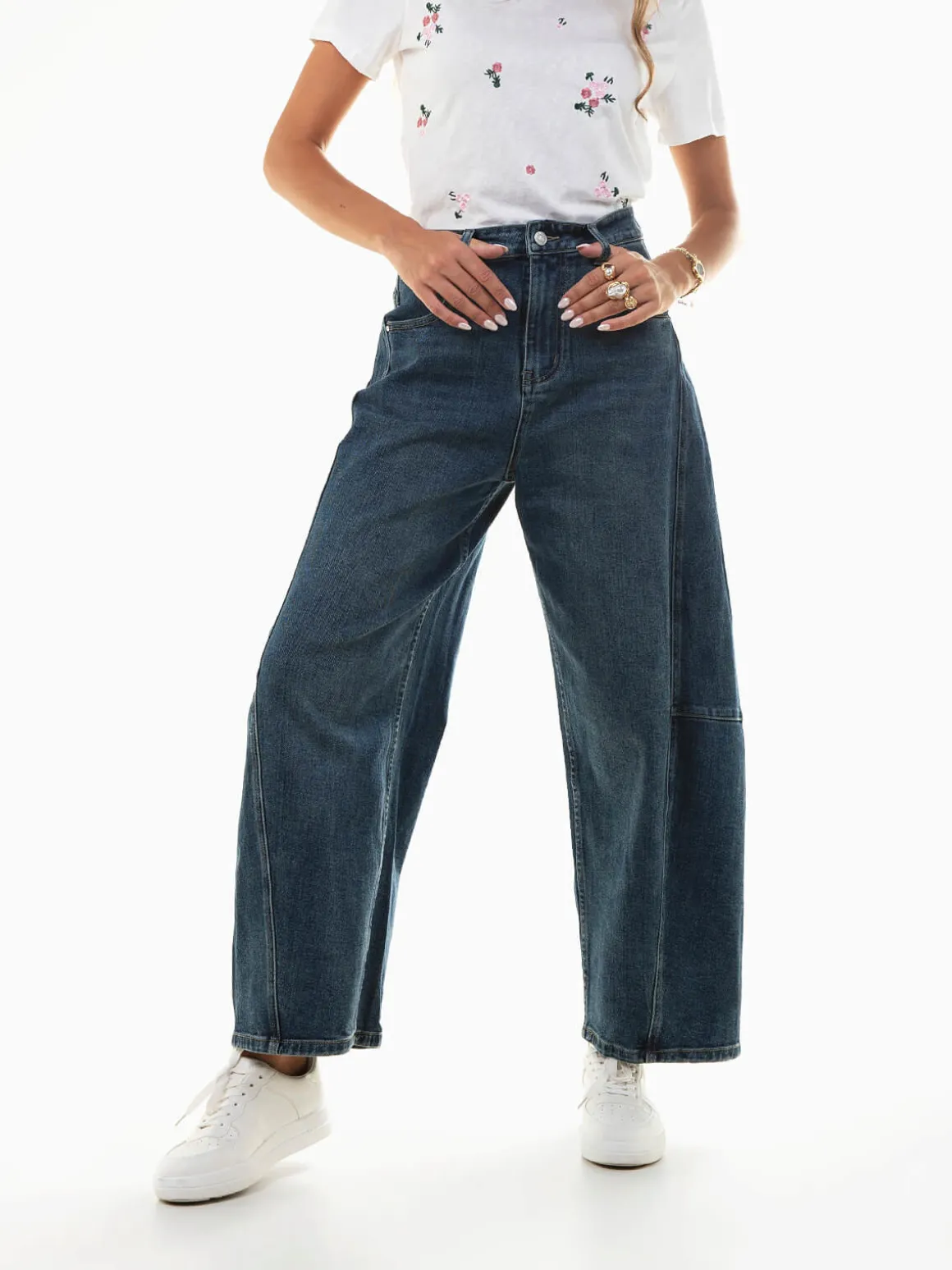 Calças de ganga barrel com cintura alta, lavagem azul escuro ‘lavado’, costuras laterais e 4 bolsos. Fecho de botão e éclair. Básicas, versáteis e com corte confortável para o dia a dia são perfeitas para combinar com t-shirts, blazers ou sapatilhas, criando looks versáteis do dia a dia.Altura da Modelo: 175 cm | Tamanho: S