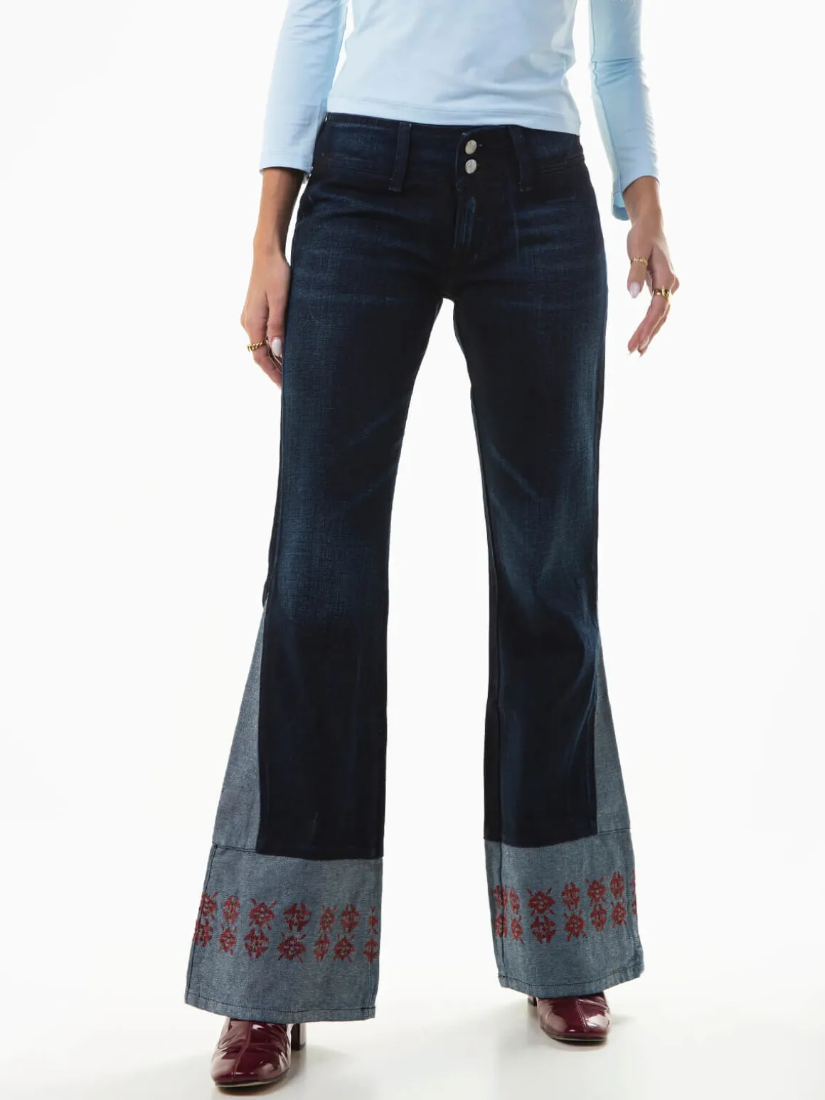 Calças ganga boca de sino com bordados na base. Jeans de cintura baixa com lavagem azul escuro e 2 bolsos na parte posterior. Altura da Modelo: 175 cm | Tamanho: 40