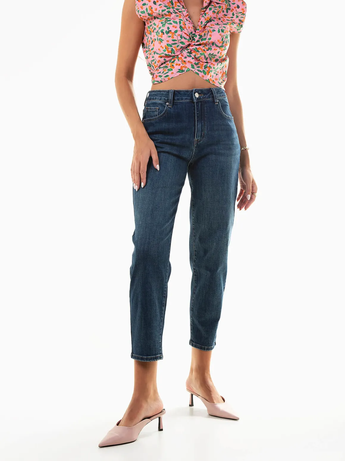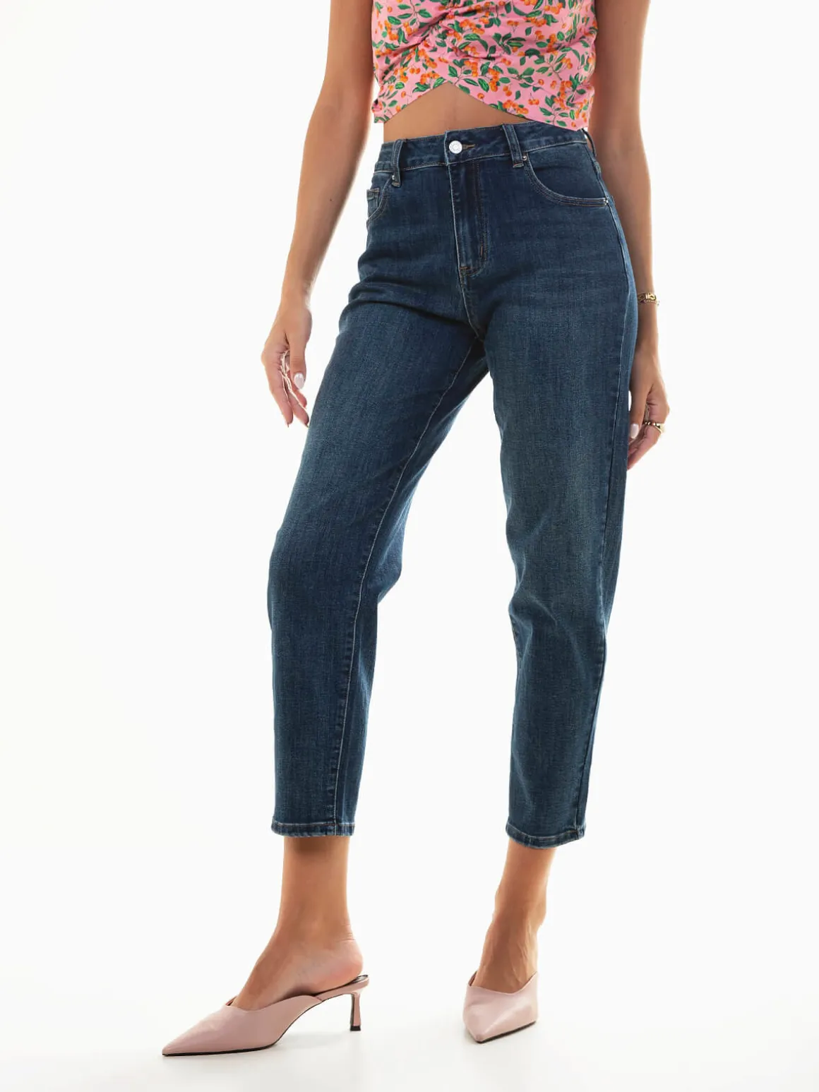 Calças de ganga boyfriend de cintura alta, com lavagem azul escuro. 5 bolsos e fecho de botão e éclair. Um modelo descontraído e moderno, perfeito para quem procura conforto sem perder estilo. Ideais para looks versáteis, do casual ao urbano.Altura da Modelo: 175 cm | Tamanho: S
