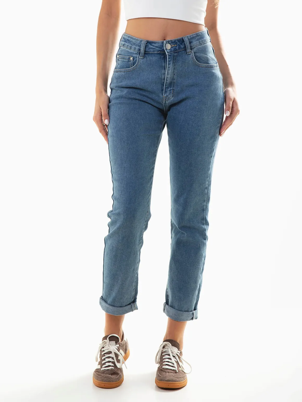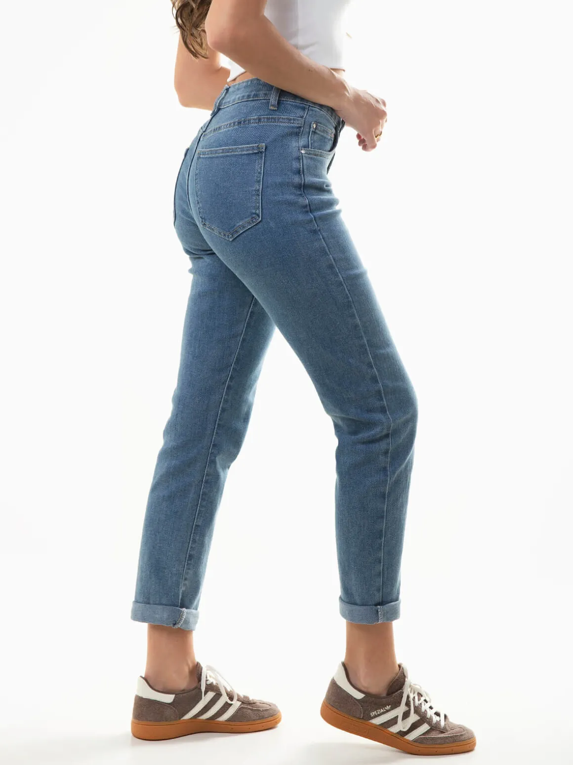Mom jeans de cintura alta com lavagem azul médio. Calças ganga com dobra na base e 5 bolsos. Aperto de fecho éclair e botão. Altura da Modelo: 175 cm | Tamanho: 38