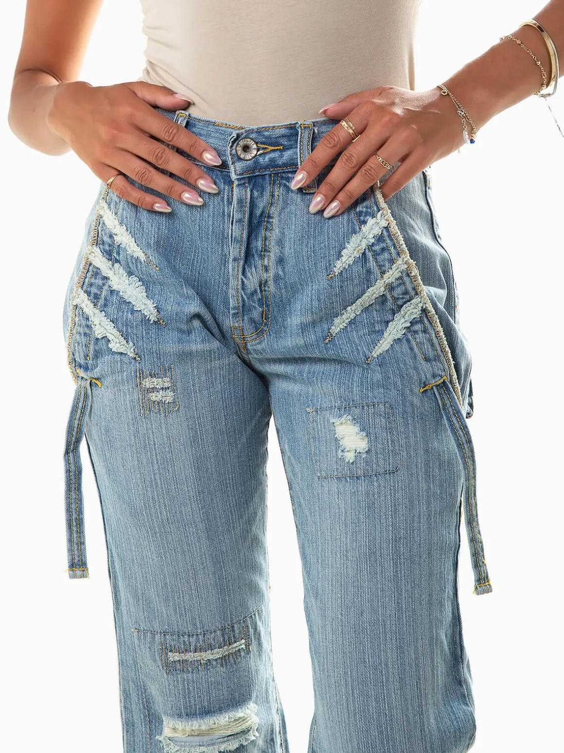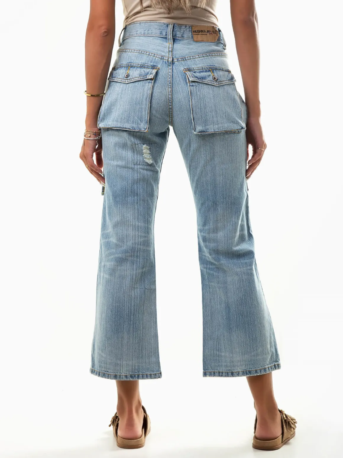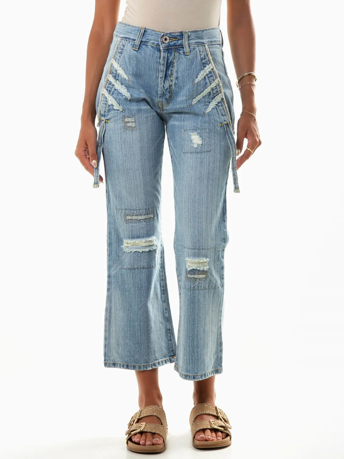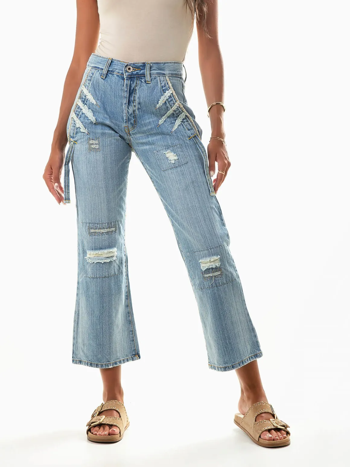 Calças de ganga curtas com rotos e lavagem azul claro. Jeans boca de sino de cintura média com dois bolsos laterais e dois bolsos quadrados na parte posterior. Aperto fecho éclair e botão. Altura da Modelo: 175 cm | Tamanho: 36