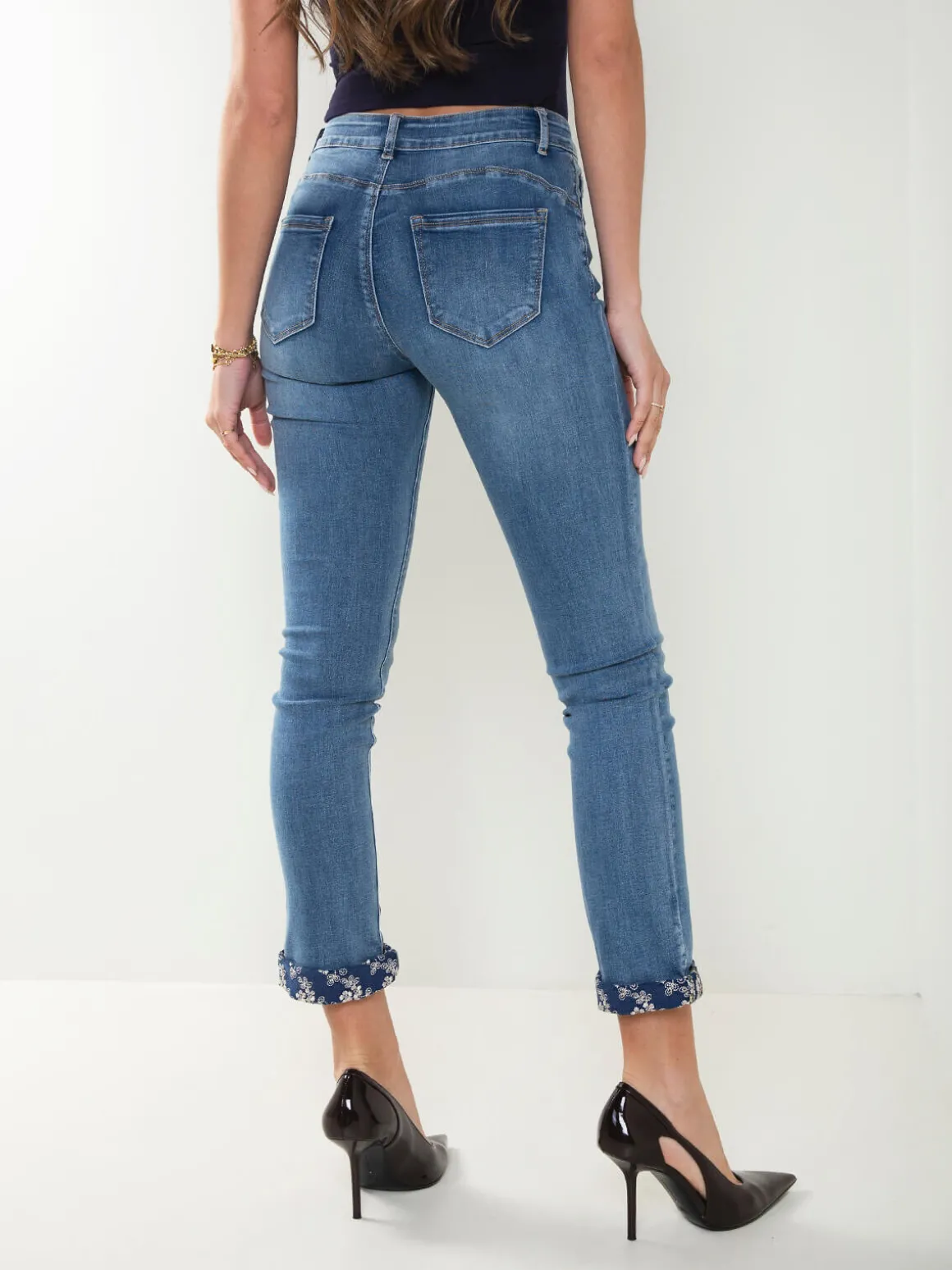 Calças de ganga de cintura média com estrutura 5 bolsos e fecho de correr com botão. Modelo skinny em lavagem azul com detalhe estampado na dobra da bainha. Versáteis e fáceis de conjugar, ideais para looks do dia a dia.Altura da Modelo: 175 cm | Tamanho: 36