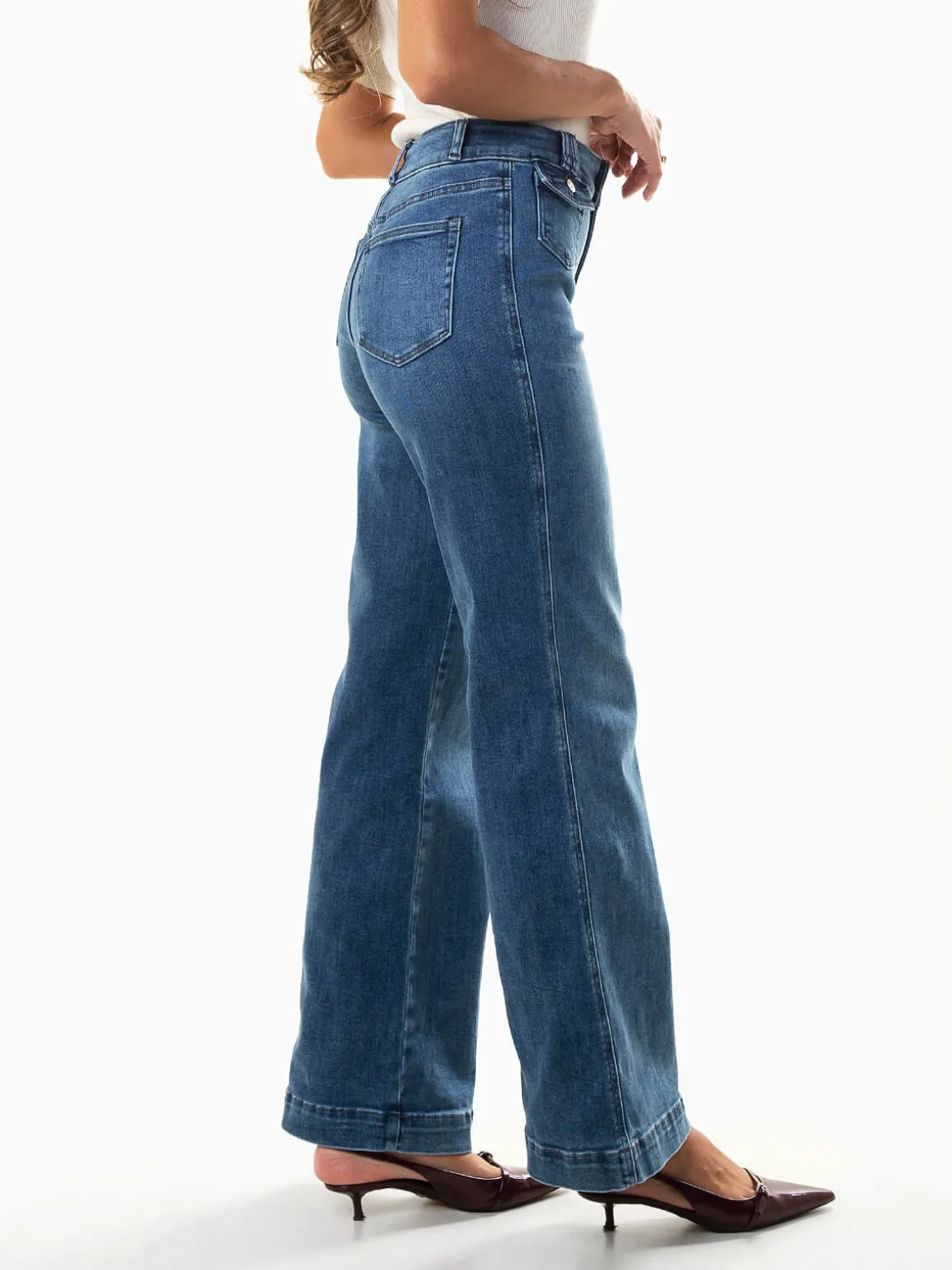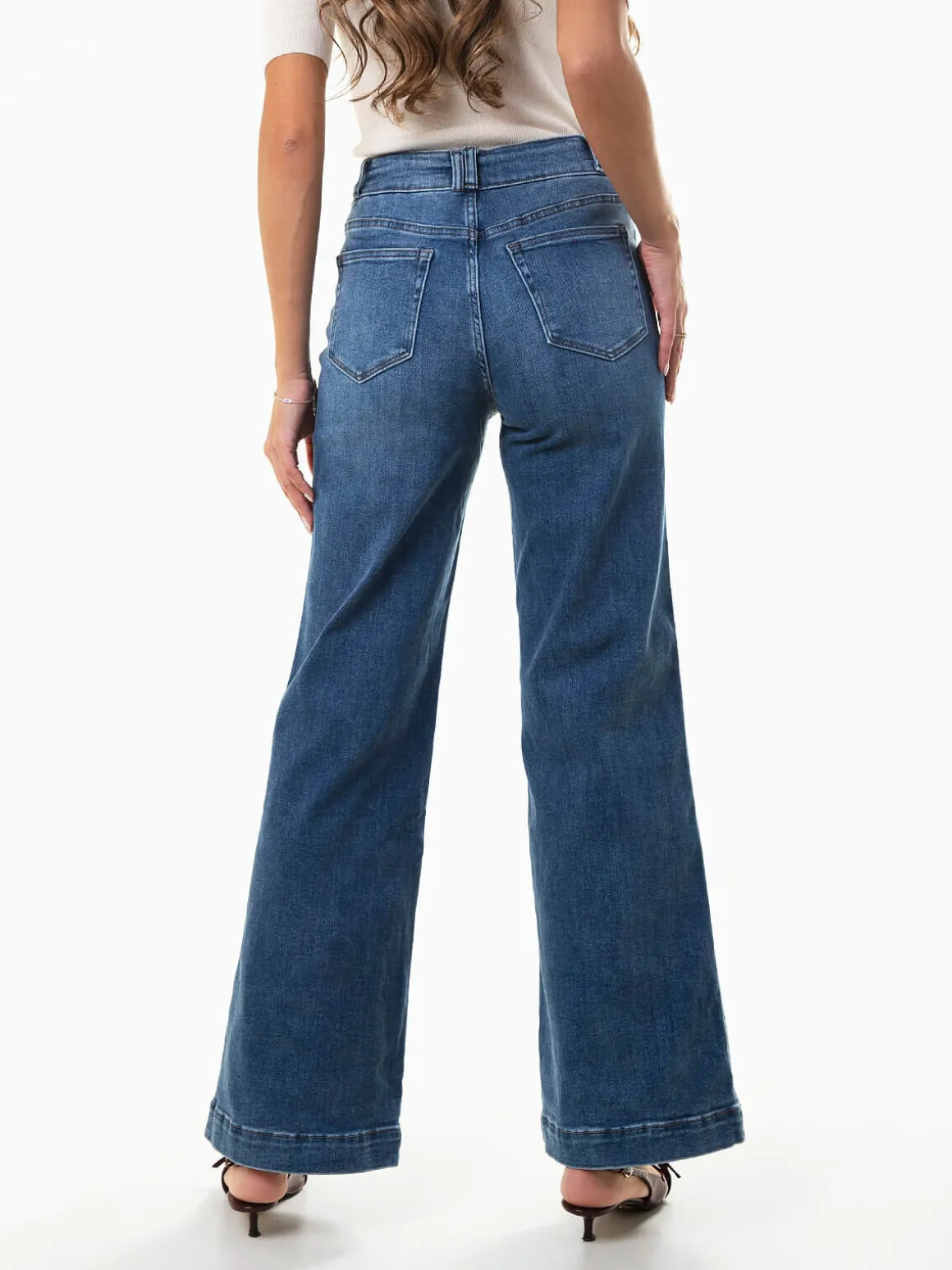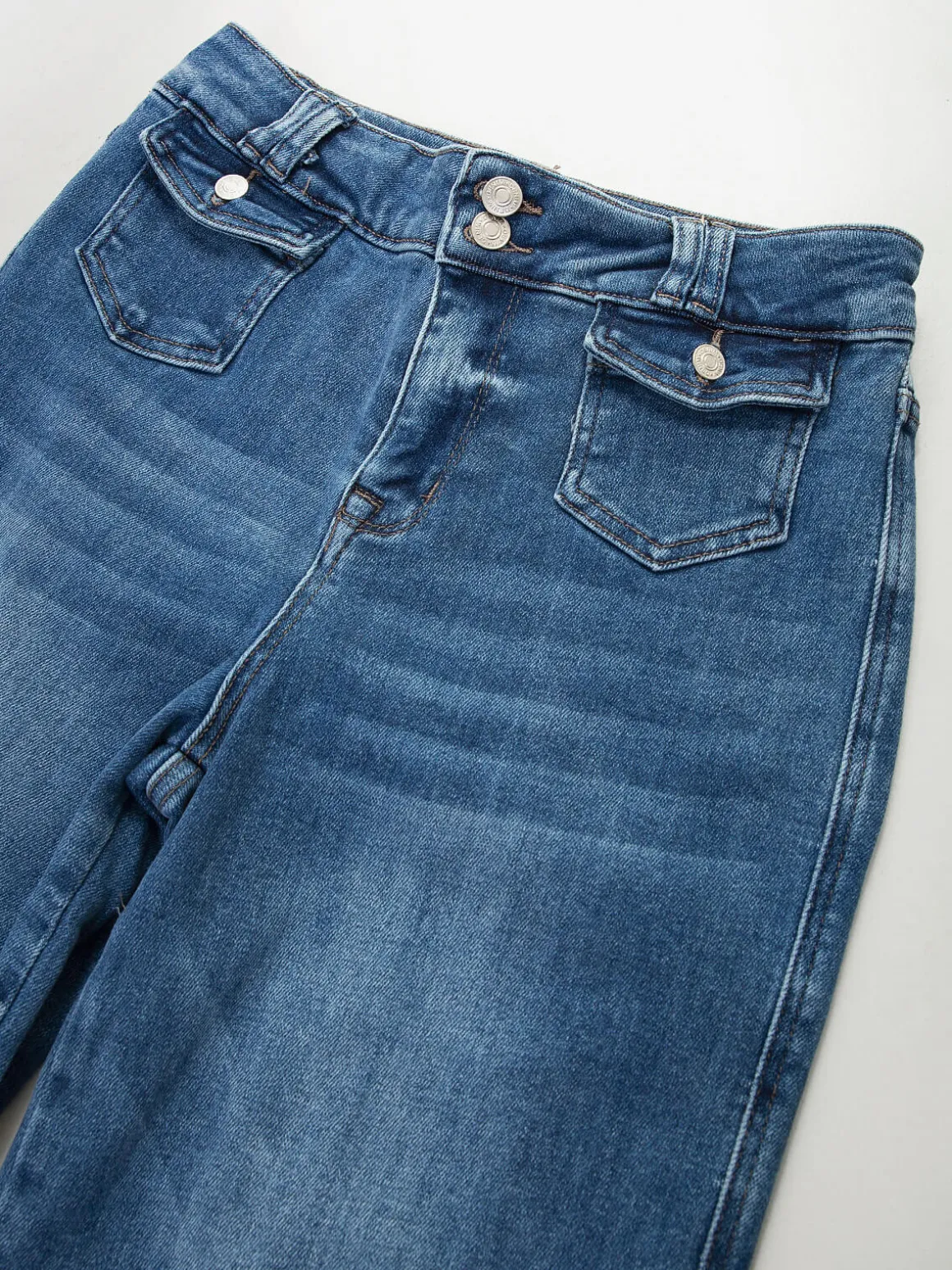 Calças de ganga wide leg com 4 bolsos e lavagem azul médio. Jeans de cintura alta com aperto fecho éclair e dois botões. Altura da Modelo: 175 cm | Tamanho: S