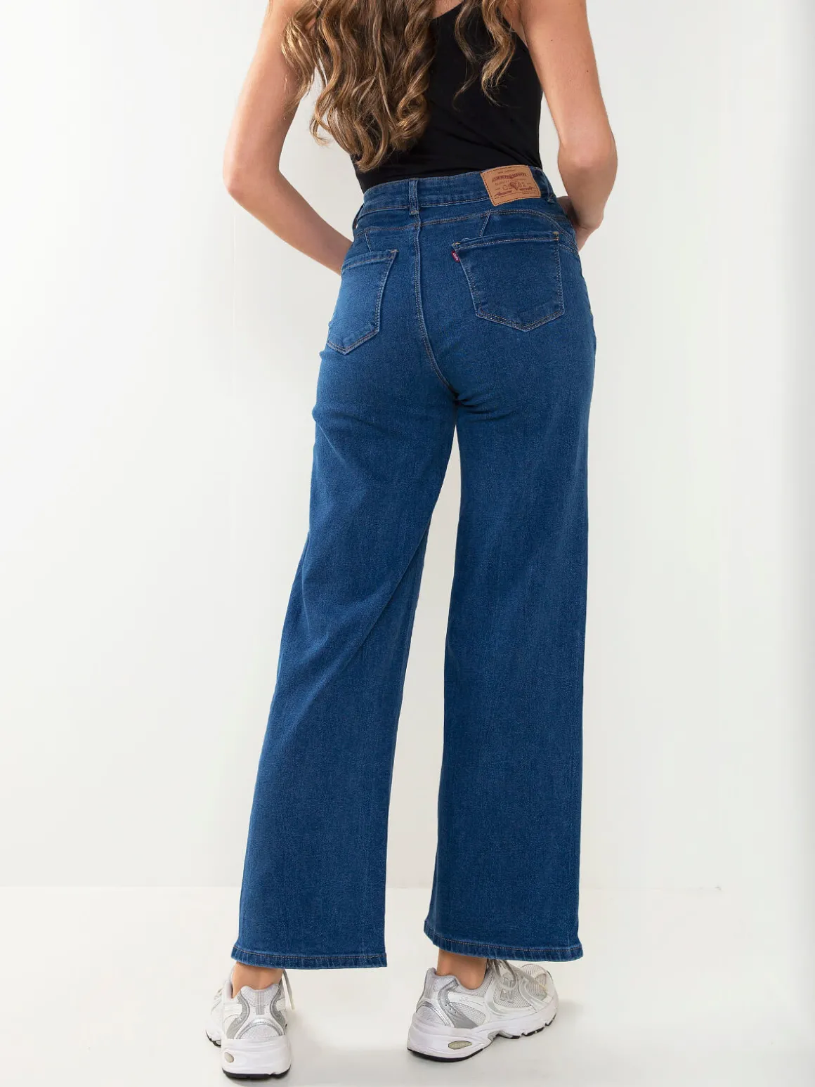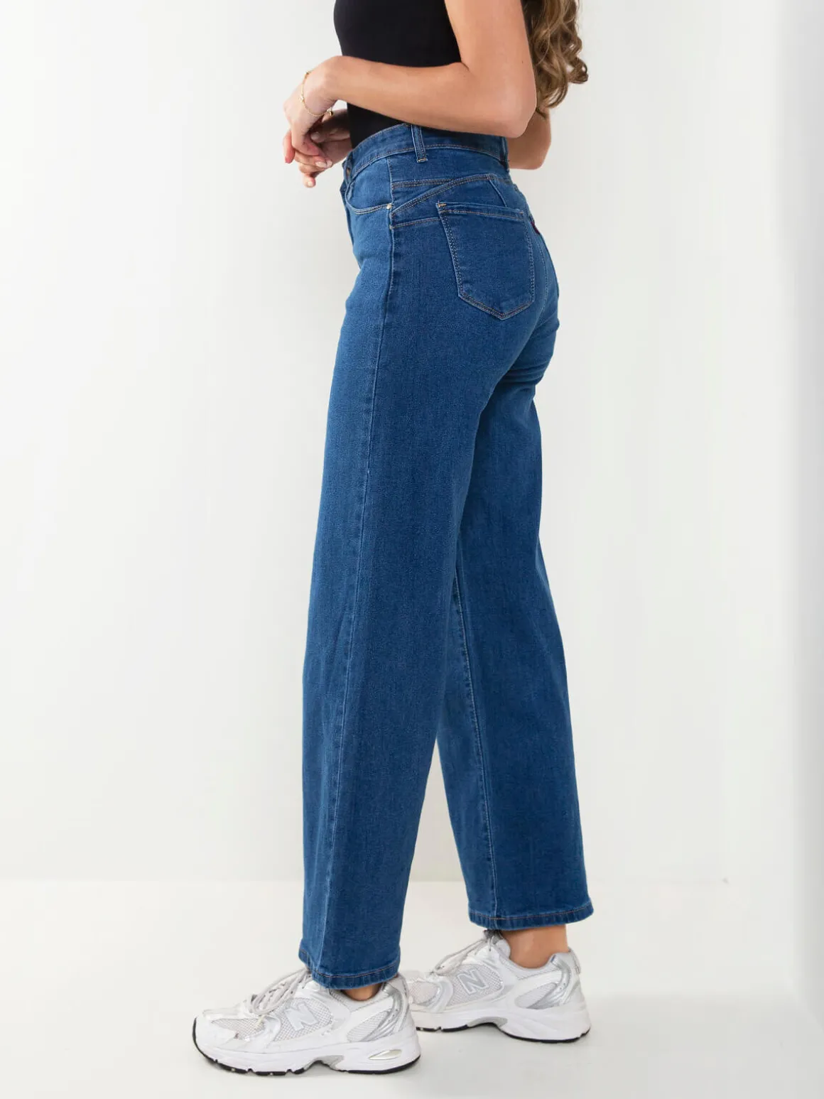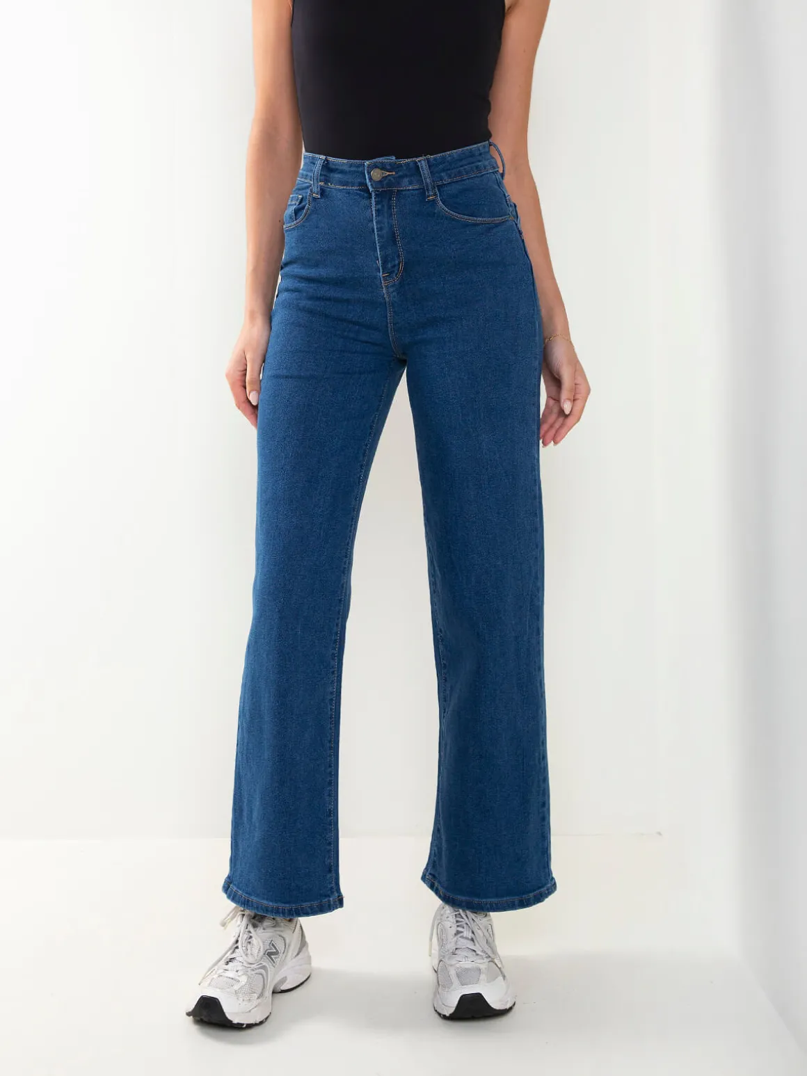 Calças de ganga wide leg com cintura alta, 5 bolsos e aperto com fecho de correr e botão. Lavagem azul versátil, perfeita para looks modernos e confortáveis.Altura da Modelo: 175 cm | Tamanho: 36