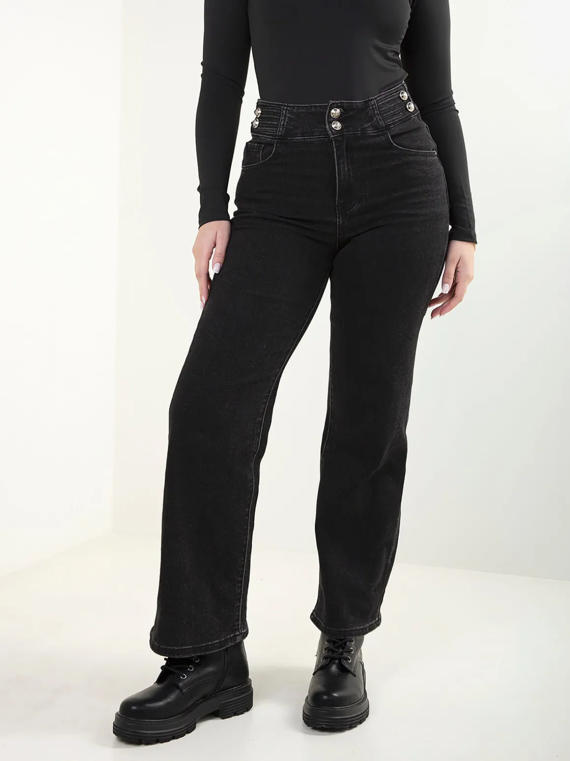 Calças de ganga pretas com cintura alta, fecho éclair e aperto de dois botões. Modelo de perna reta com 5 bolsos, confortável e perfeito para looks simples e modernos.Altura da Modelo: 166 cm | Tamanho: 38