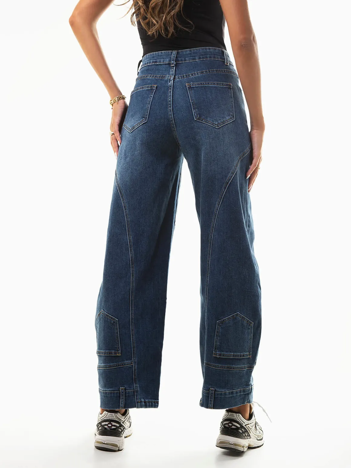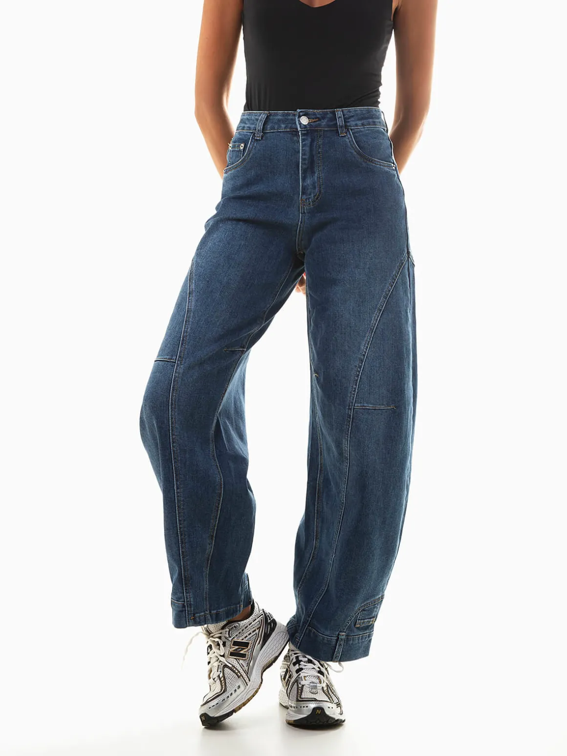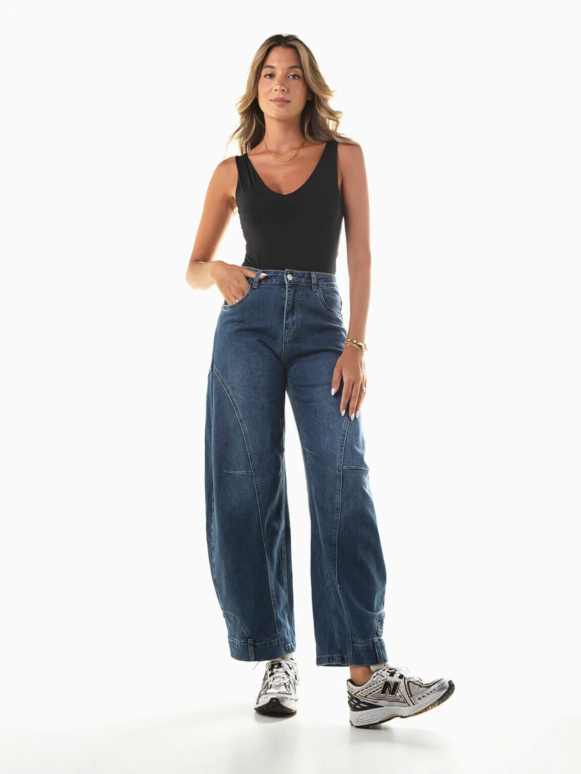 Calças de ganga em tom azul escuro, modelo skater de cintura média. Corte largo e confortável, com 5 bolsos e aperto de fecho éclair e botão. As costuras em destaque acrescentam um toque contemporâneo ao estilo clássico da ganga. Usa com uma t-shirt básica e ténis brancos para um look casual intemporal.Altura da Modelo: 175 cm | Tamanho: S