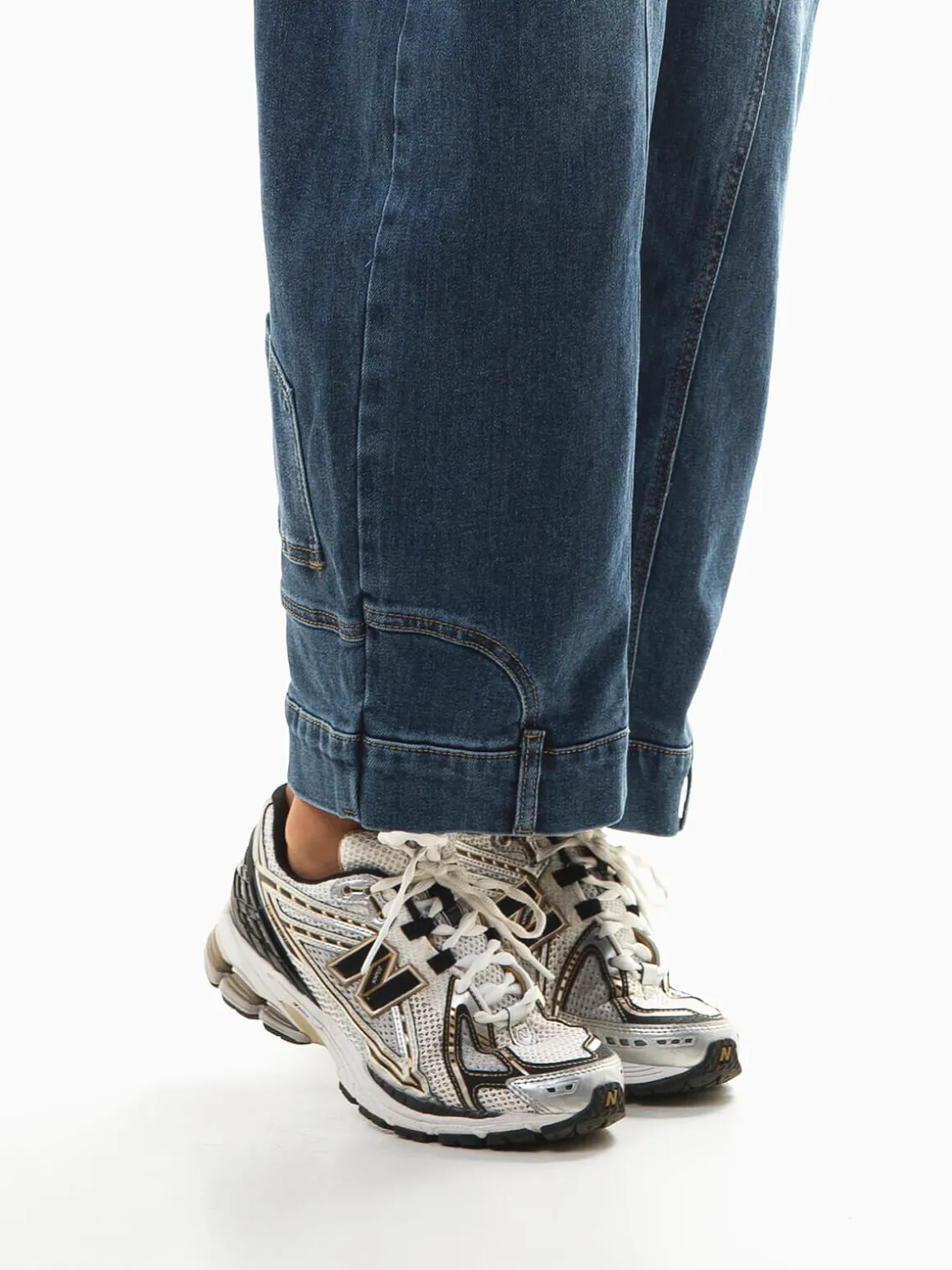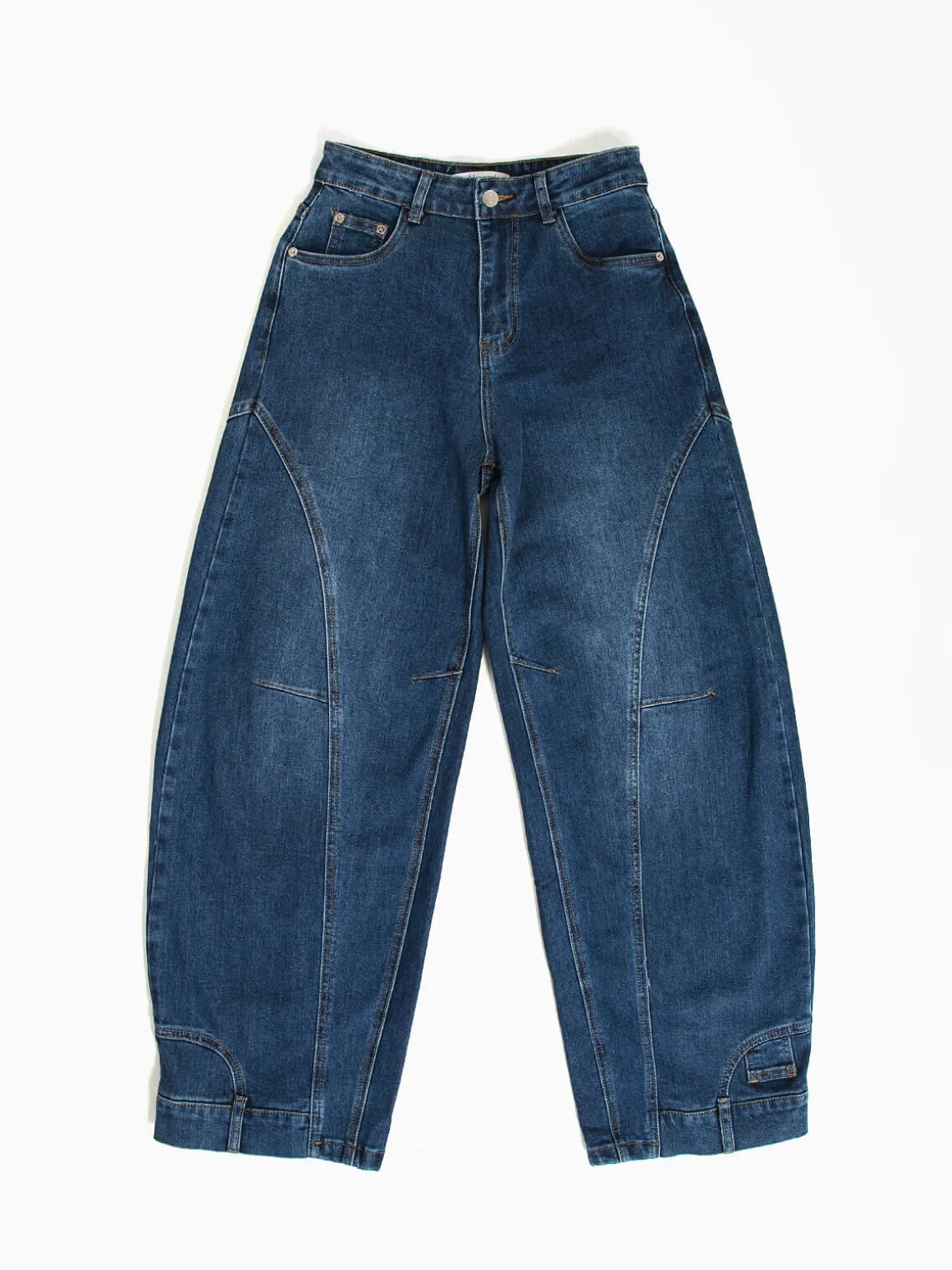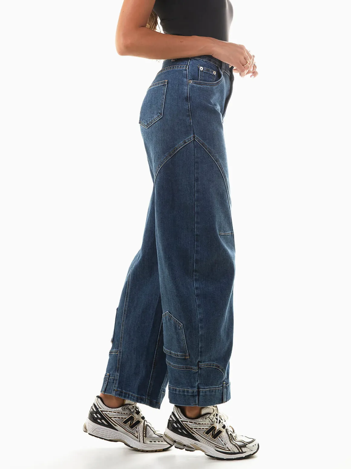 Calças de ganga em tom azul escuro, modelo skater de cintura média. Corte largo e confortável, com 5 bolsos e aperto de fecho éclair e botão. As costuras em destaque acrescentam um toque contemporâneo ao estilo clássico da ganga. Usa com uma t-shirt básica e ténis brancos para um look casual intemporal.Altura da Modelo: 175 cm | Tamanho: S