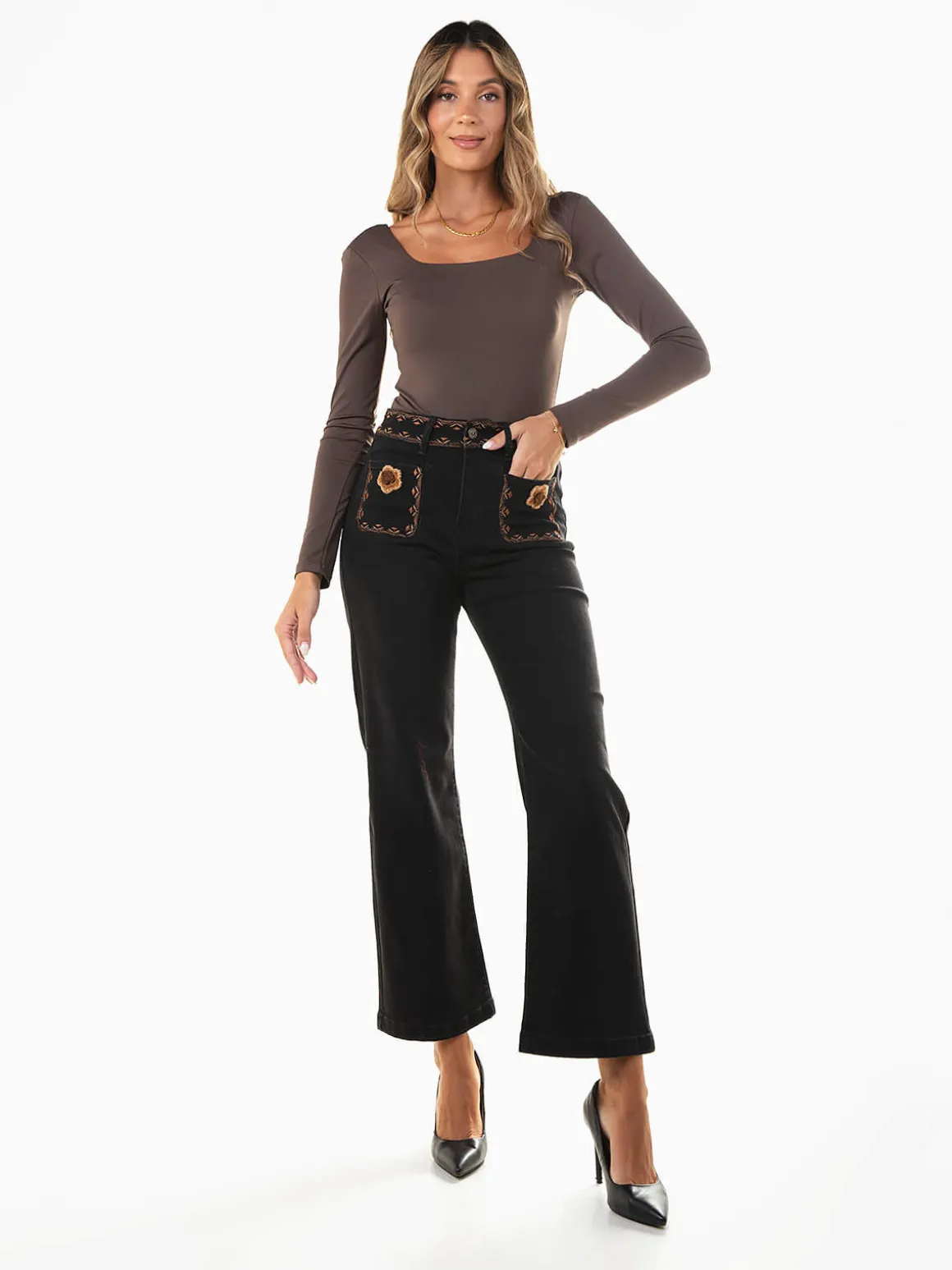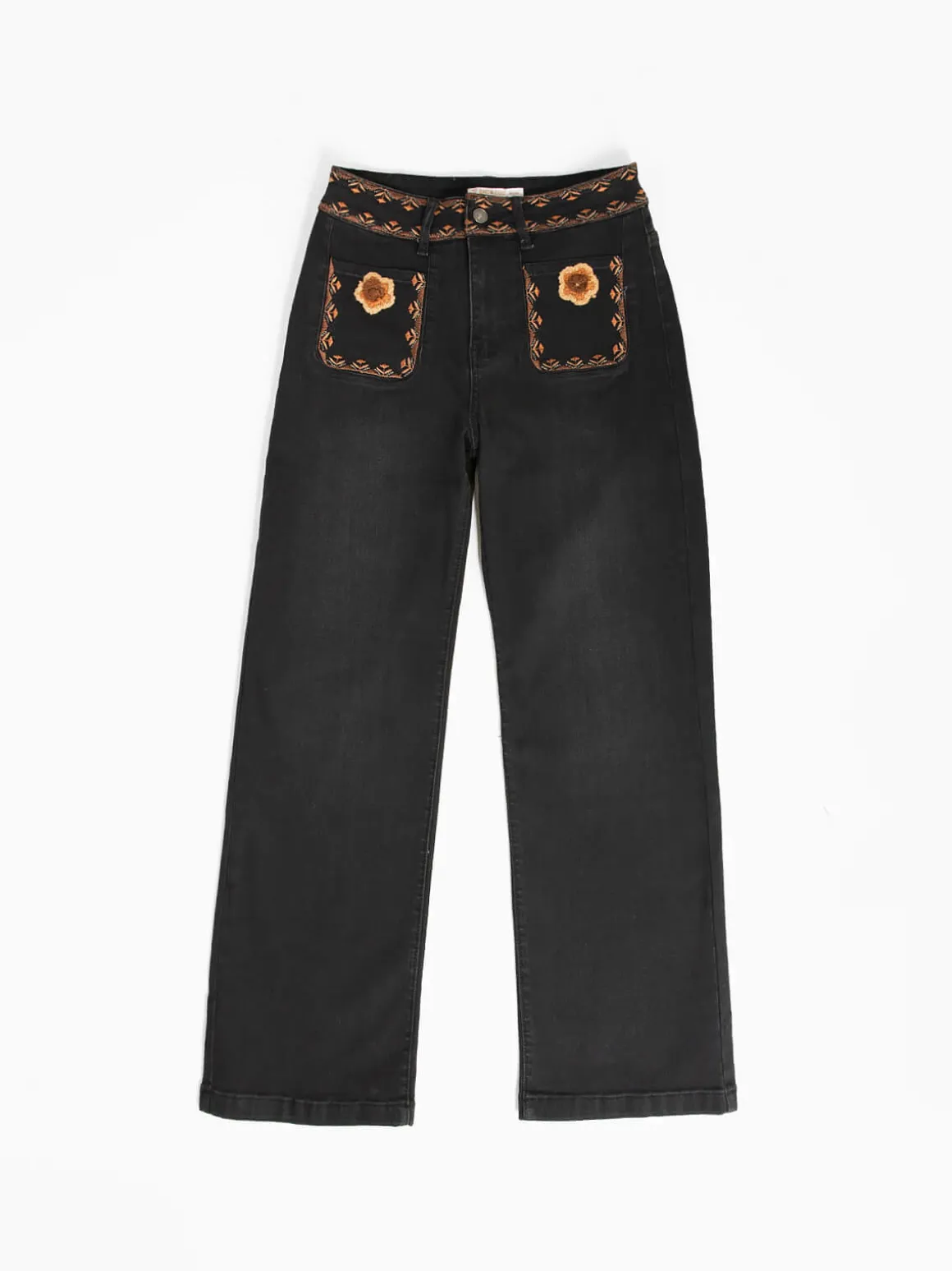 Calças de ganga straight fit de cintura alta, com perna reta e corte intemporal. O detalhe diferenciador está nos bolsos em crochet floral, que acrescentam um toque artesanal e feminino à peça. Modelo de 4 bolsos com fecho éclair e botão, versátil e fácil de coordenar.Altura da Modelo: 175 cm | Tamanho: 36