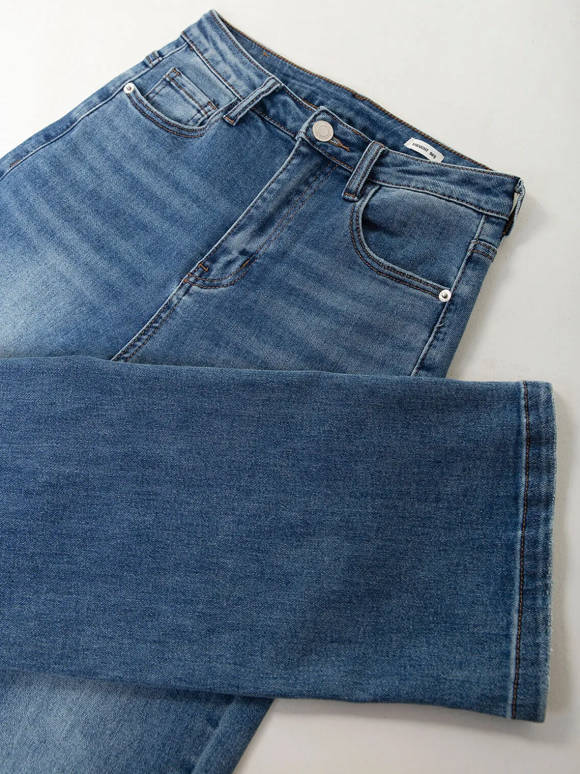 Calças de ganga de corte straight, em lavagem azul médio. Modelo com 5 bolsos, destaque para o coração bordado no bolso traseiro, cintura confortável e aperto frontal com fecho éclair e botão. Um essencial versátil com um detalhe feminino que faz a diferença.Altura da Modelo: 175 cm | Tamanho: 36