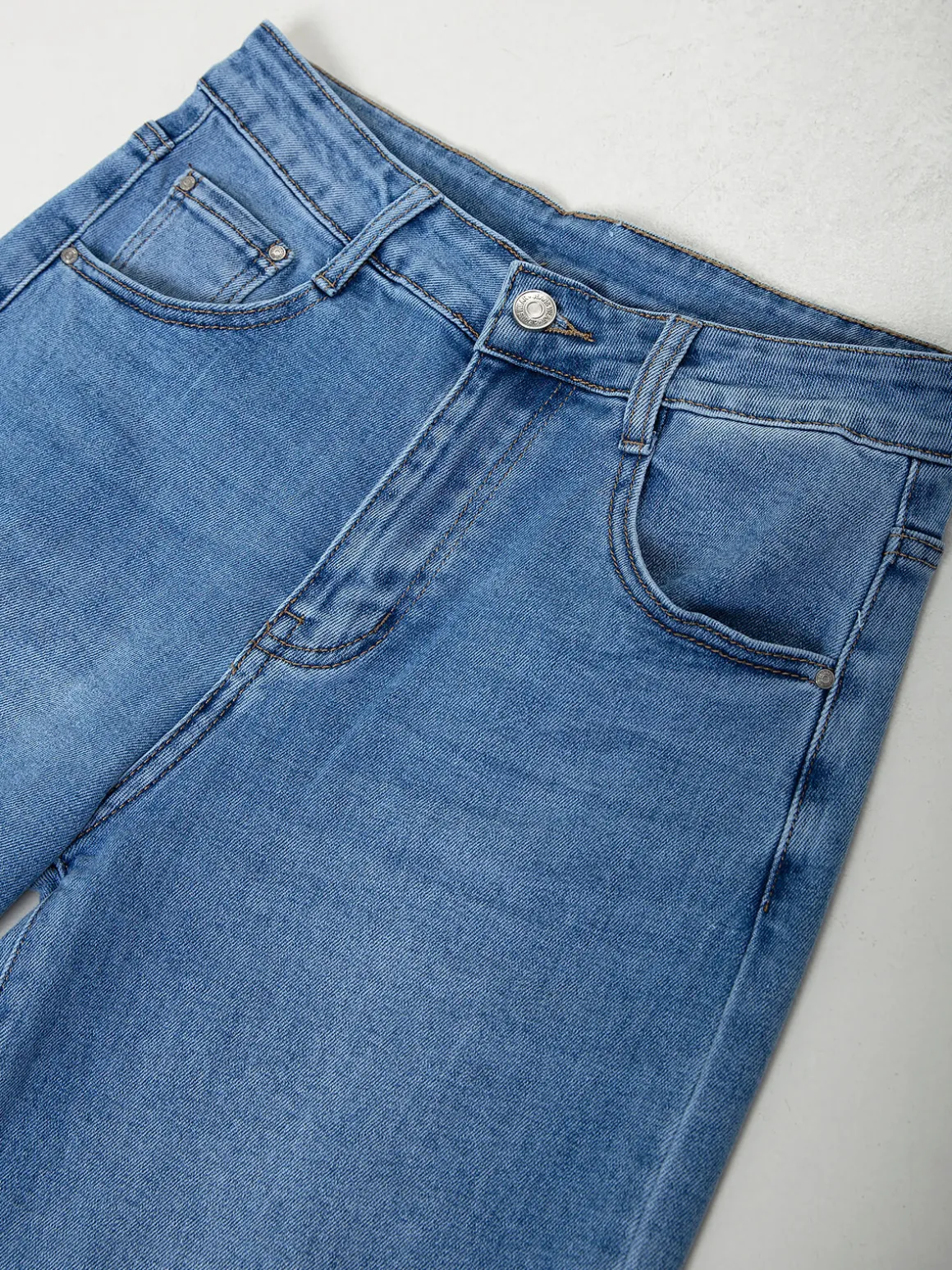Calças de ganga de cintura alta, com corte wide leg e design de 5 bolsos. Fecho de correr e botão para um ajuste confortável e versátil, ideal para looks do dia a dia ou mais elegantes.Altura da Modelo: 166 cm | Tamanho: S