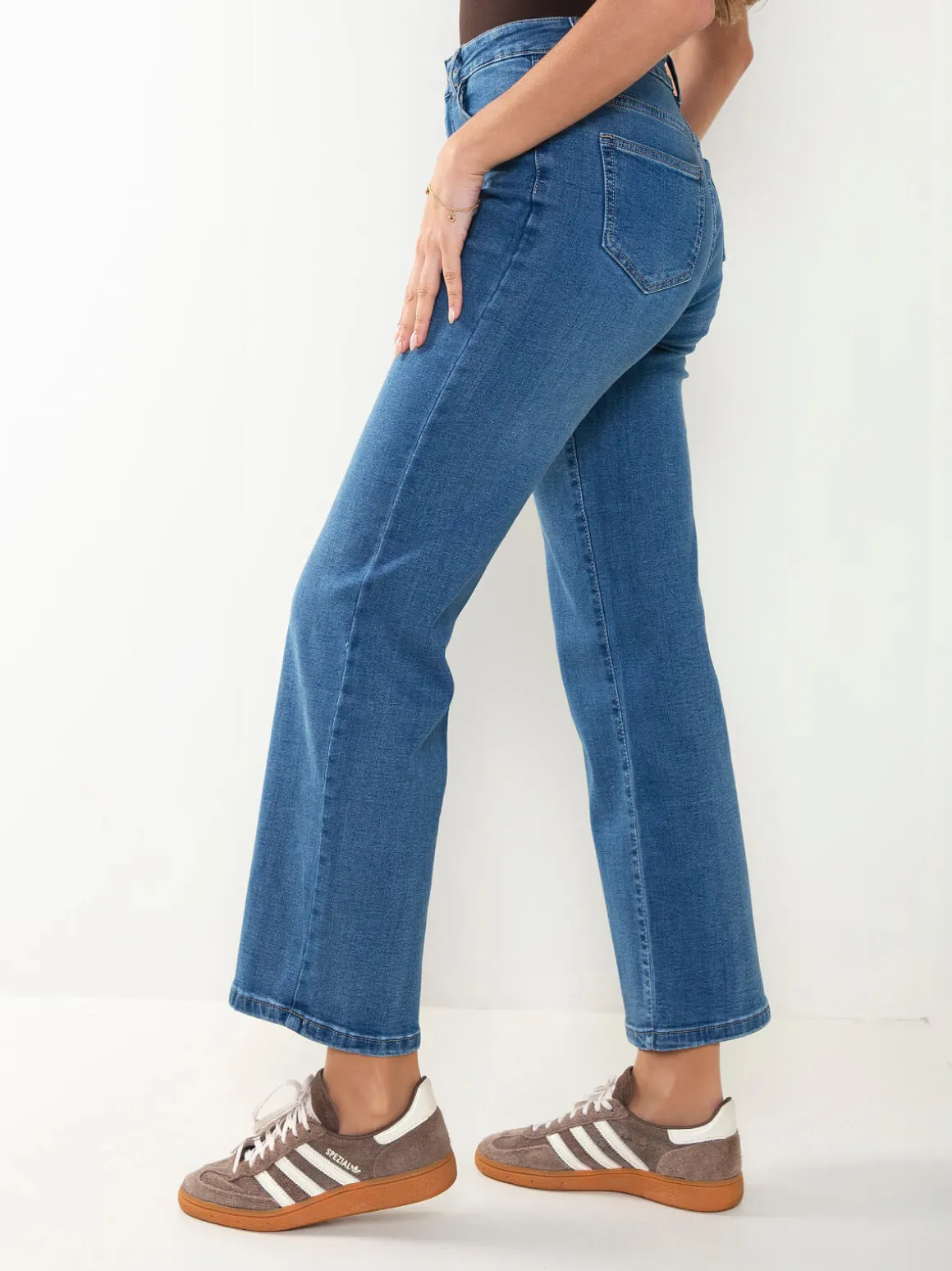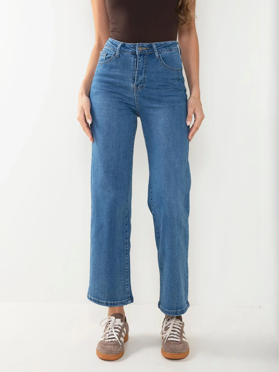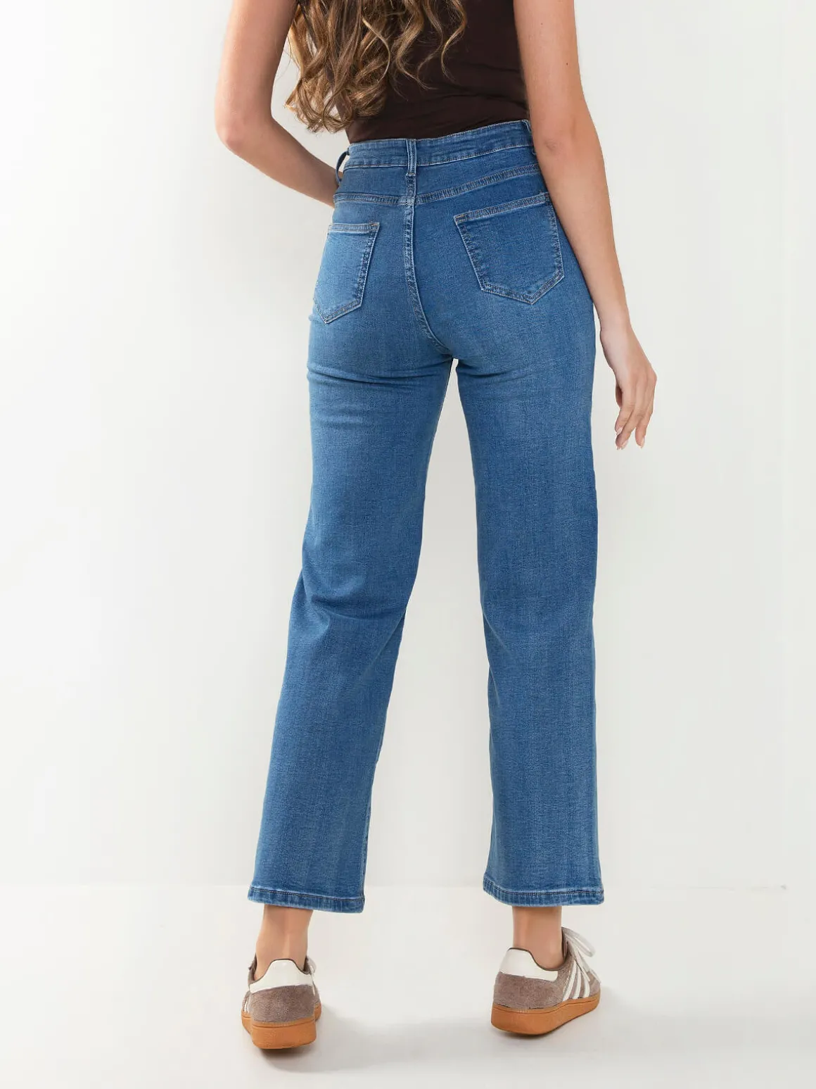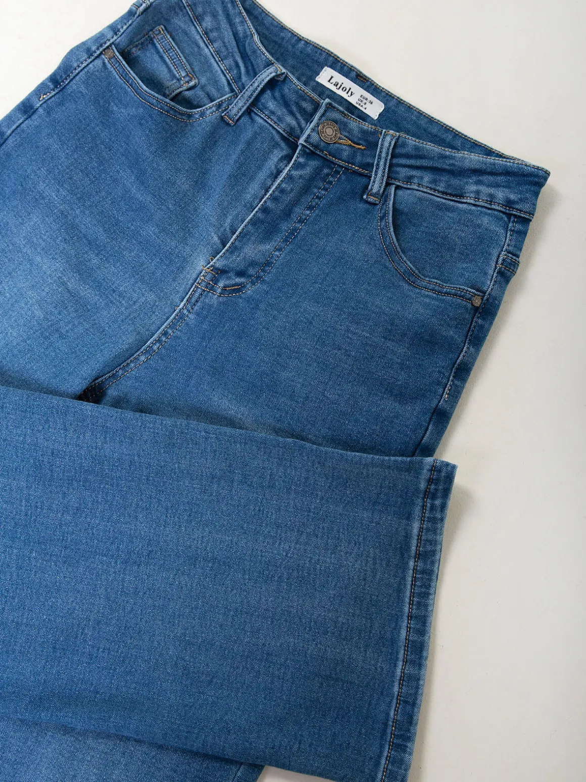 Calças de ganga de cintura alta com corte wide leg. Modelo 5 bolsos, com fecho de correr e botão. Lavagem média versátil, perfeita para looks casuais ou mais arranjados dentro das tendências de moda acessível.Altura da Modelo: 175 cm | Tamanho: 36
