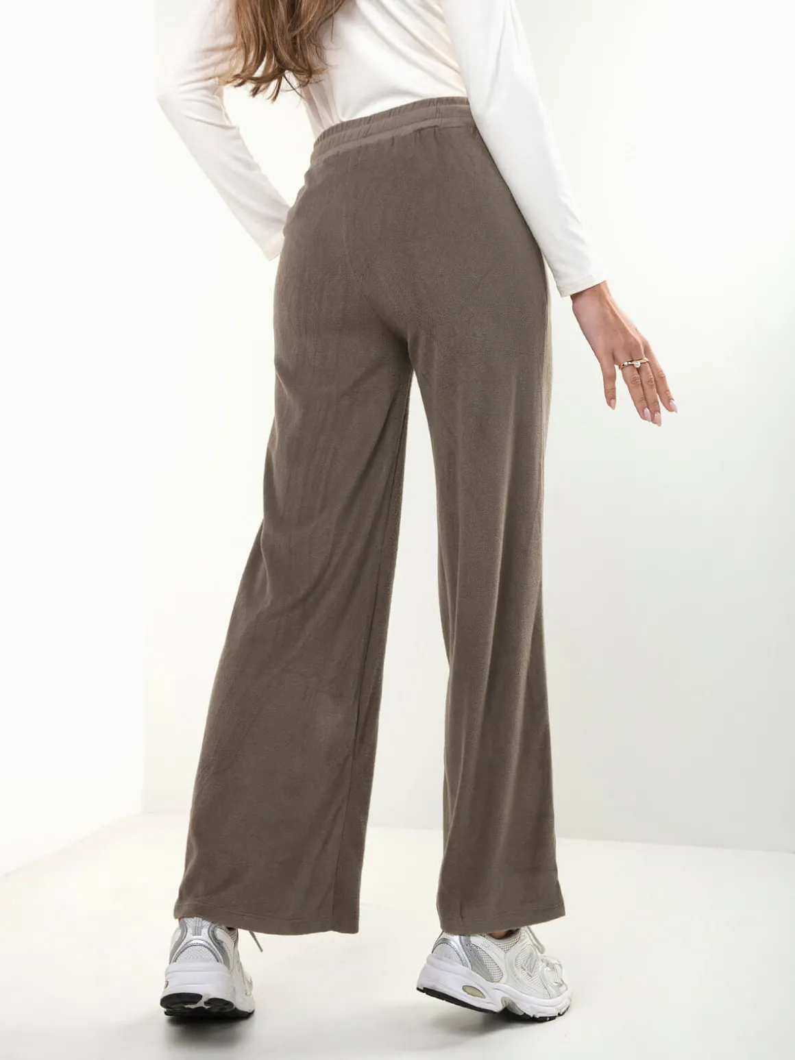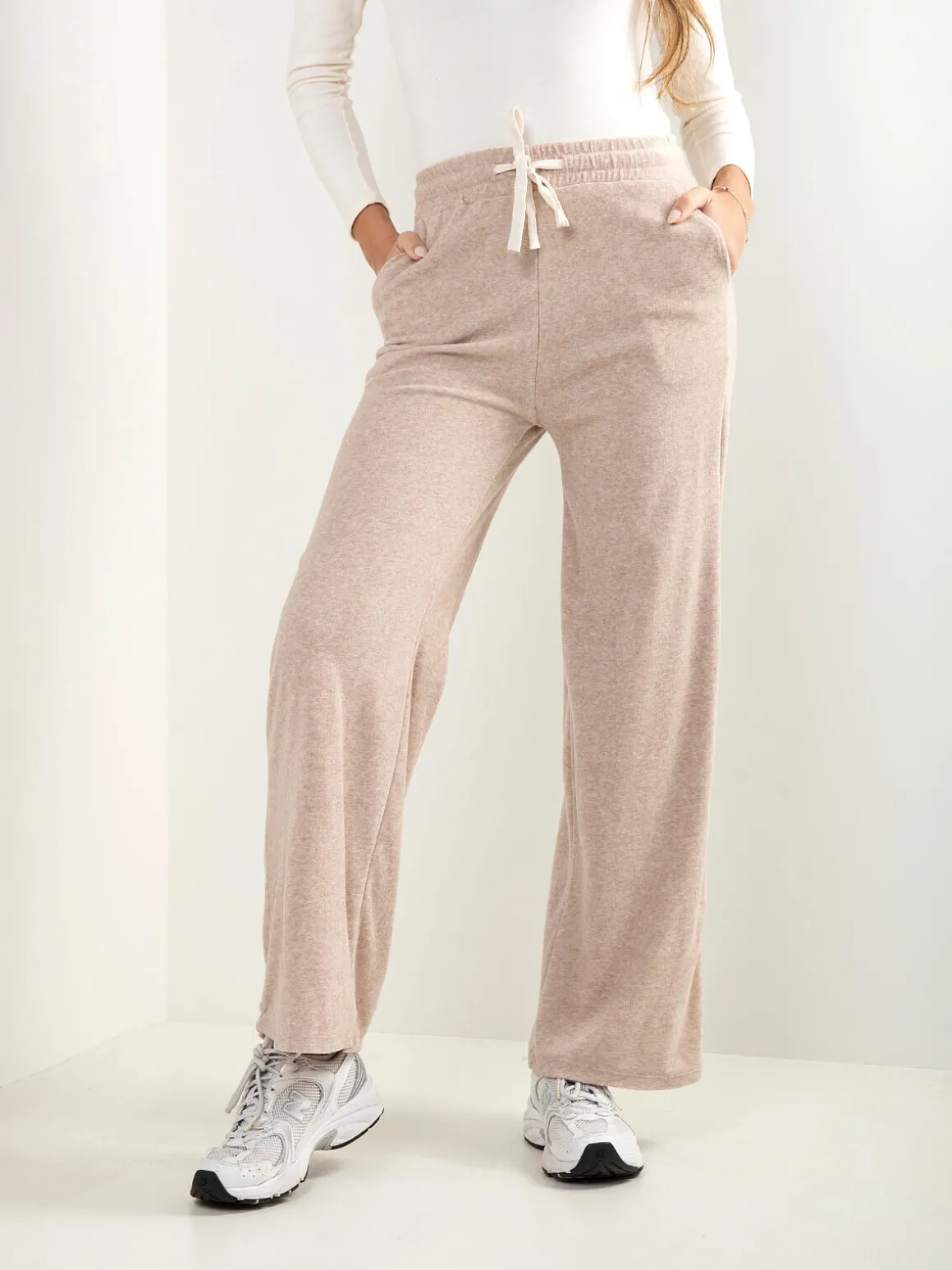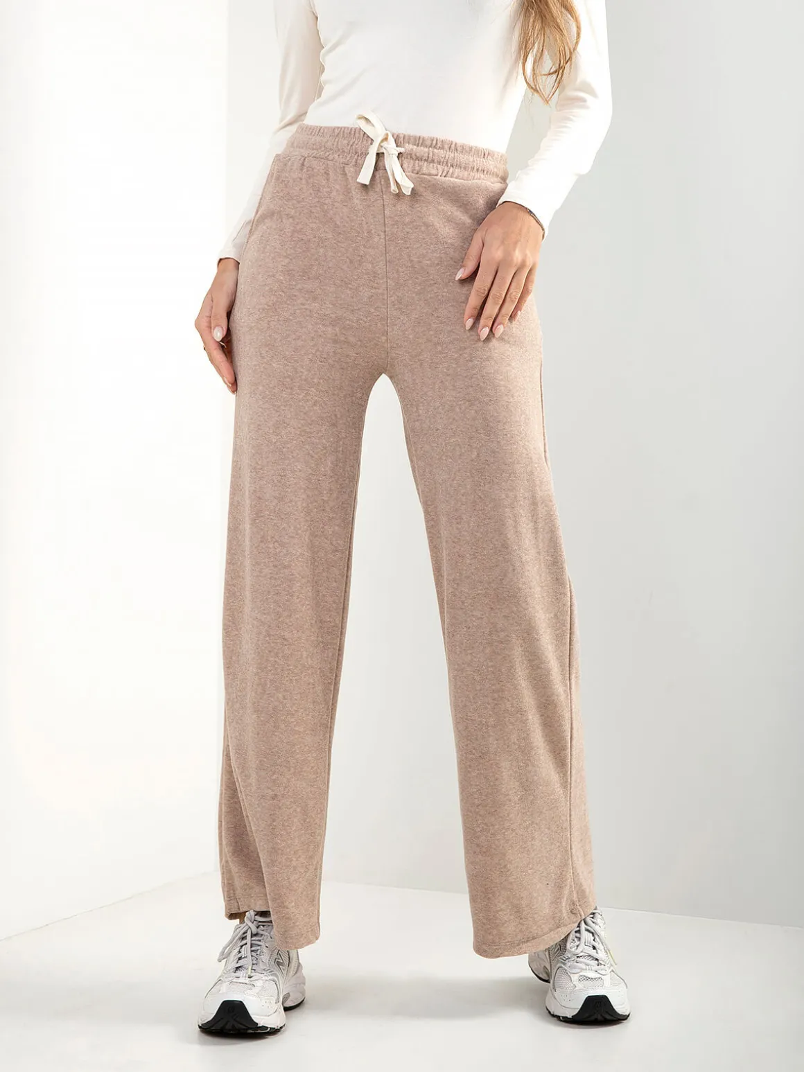 Calças fluidas em malha com efeito aveludado, cintura alta e cordão para ajustar. Modelo confortável com 2 bolsos, perfeito para looks casuais e atuais. Disponíveis em cores neutras da estação.Altura da Modelo: 175 cm | Tamanho: S/M