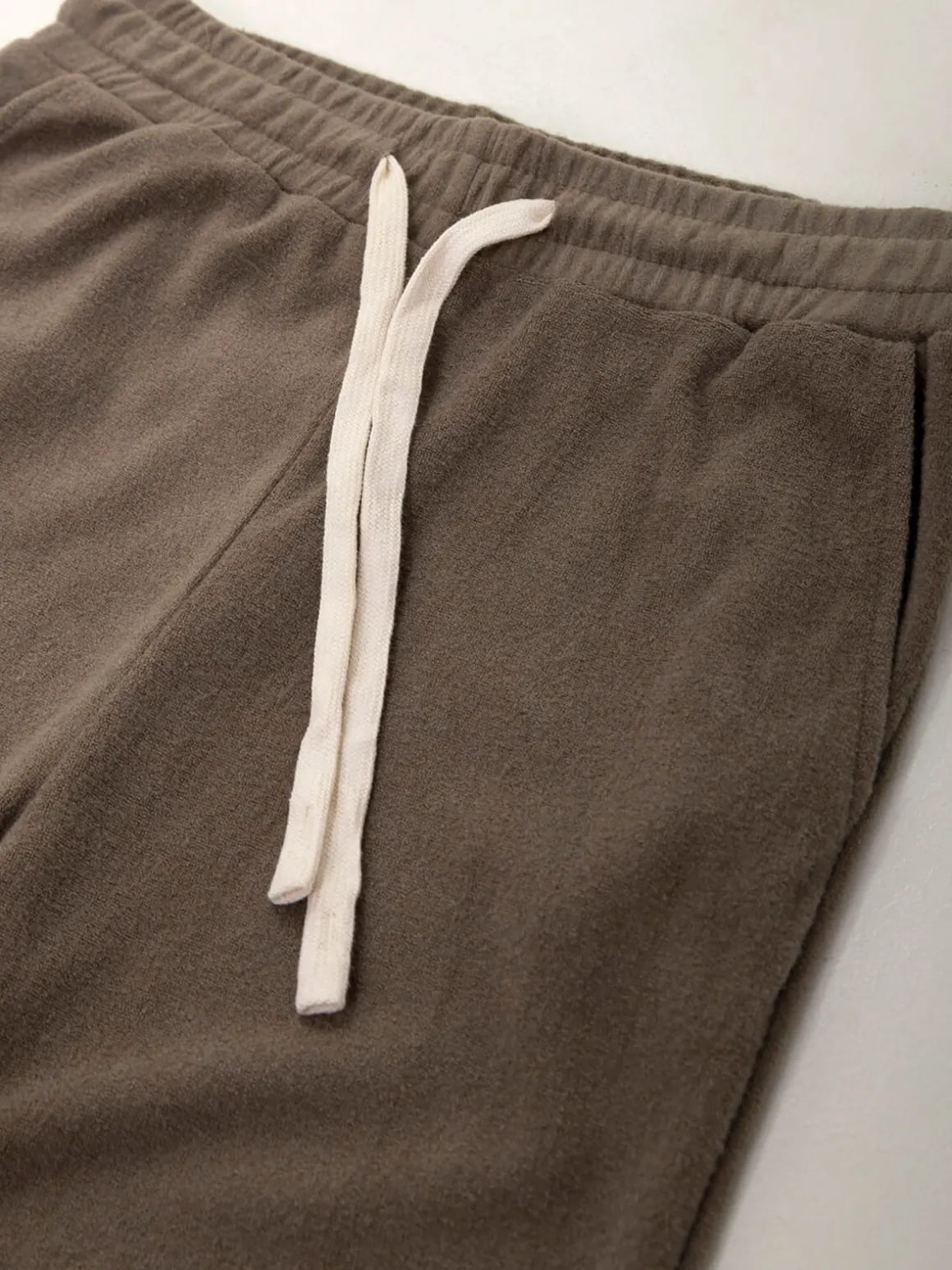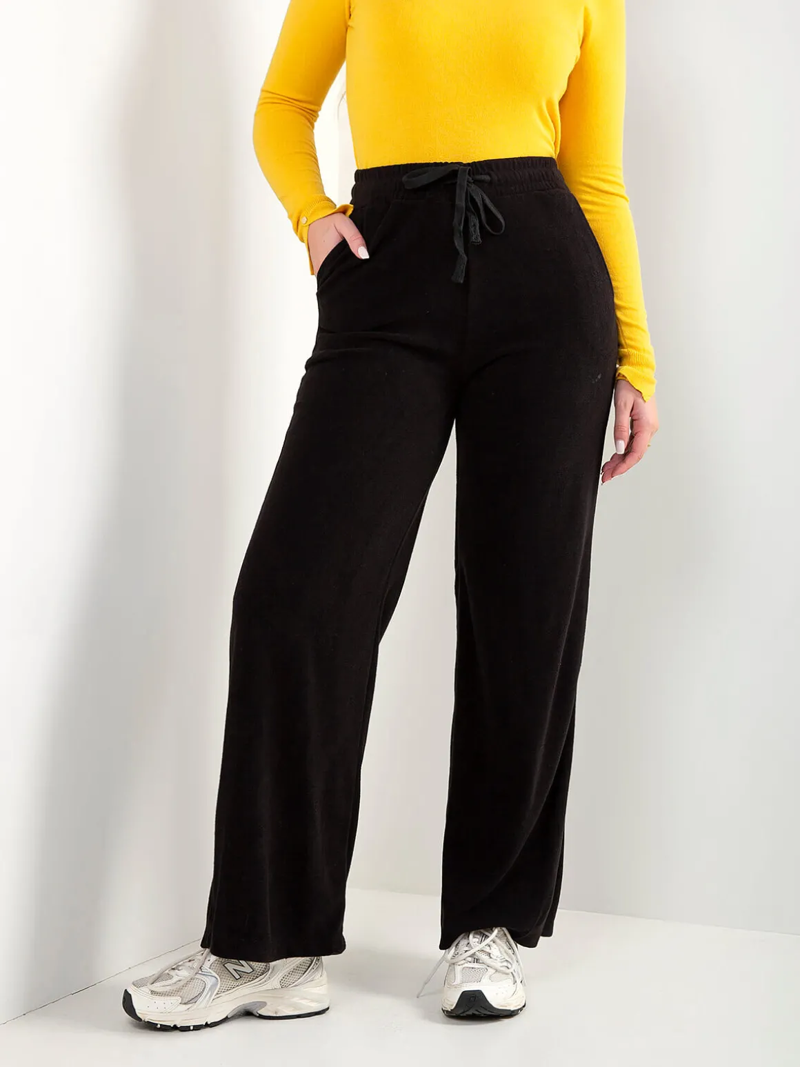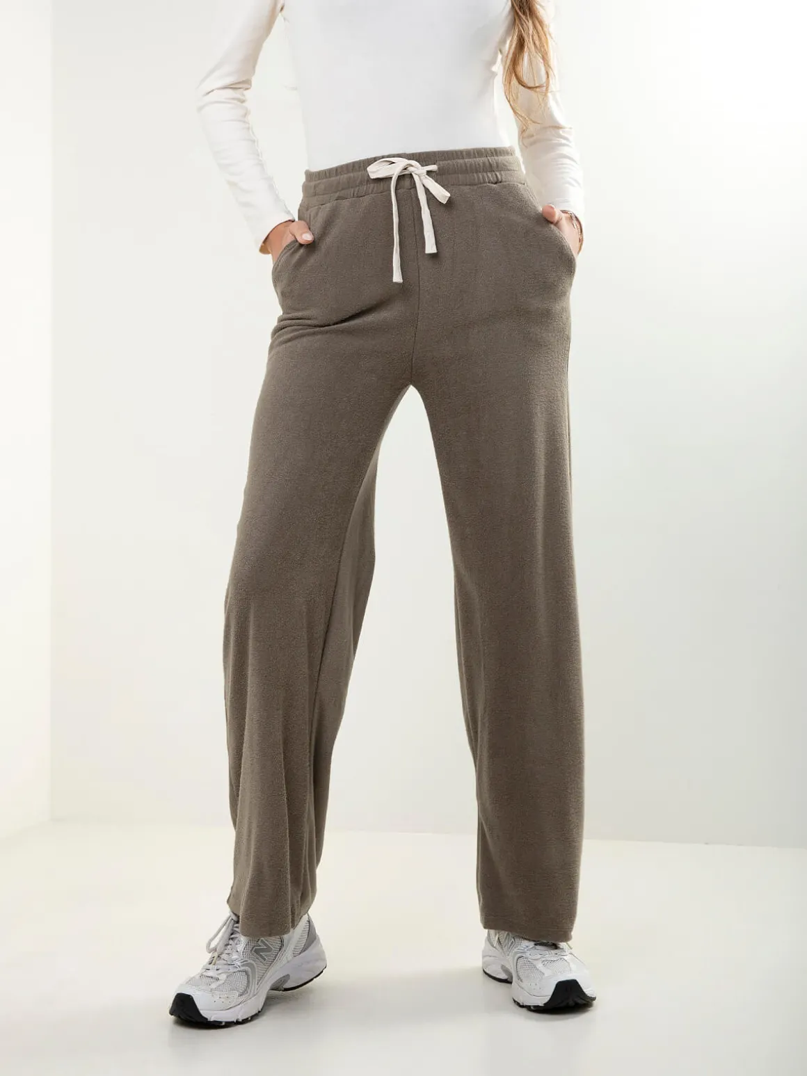 Calças fluidas em malha com efeito aveludado, cintura alta e cordão para ajustar. Modelo confortável com 2 bolsos, perfeito para looks casuais e atuais. Disponíveis em cores neutras da estação.Altura da Modelo: 175 cm | Tamanho: S/M