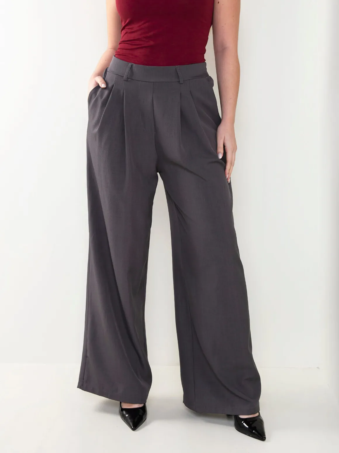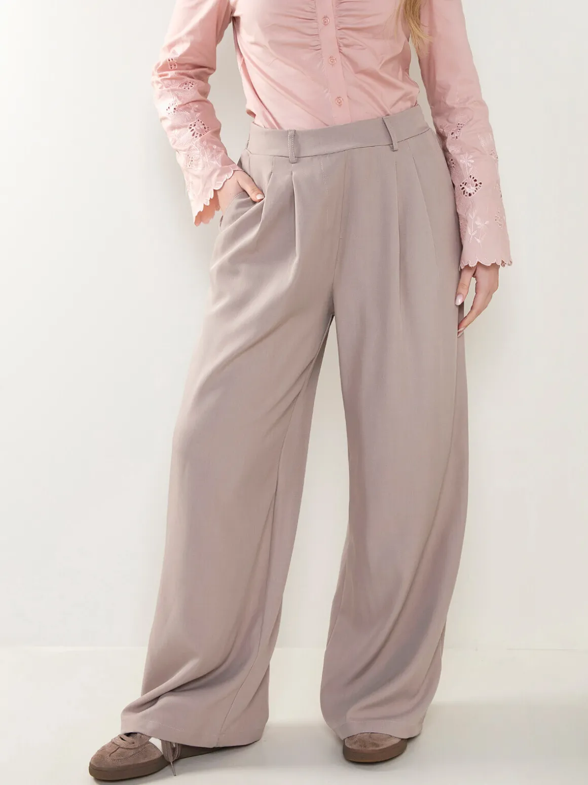 Calças de cintura subida com corte palazzo e pregas frontais. Modelo fluido com bolsos laterais e acabamento elegante, ideal para looks formais ou combinações mais modernas. Uma peça versátil e atual dentro das tendências de moda acessível.Altura da Modelo: 166 cm | Tamanho: S/M