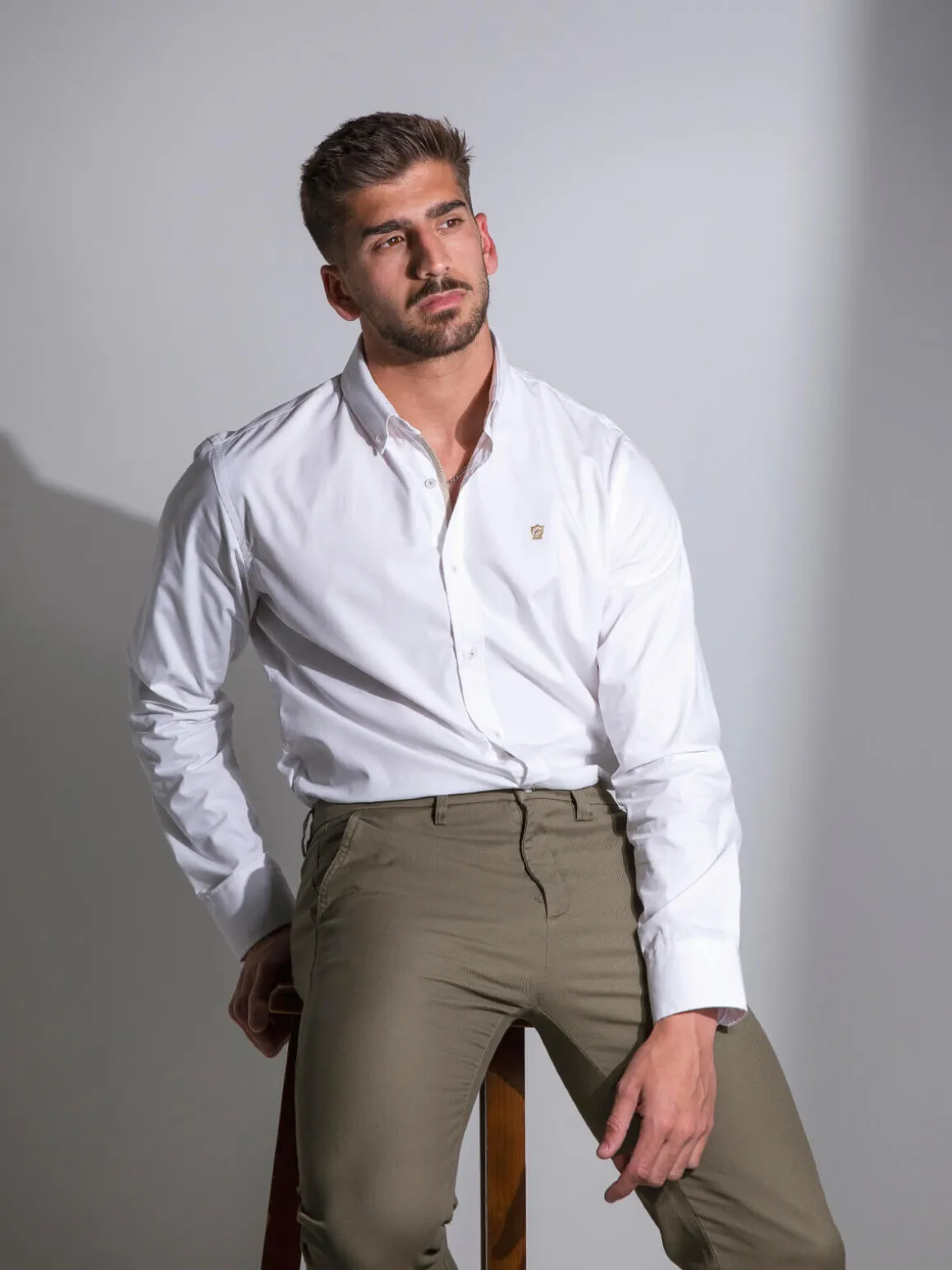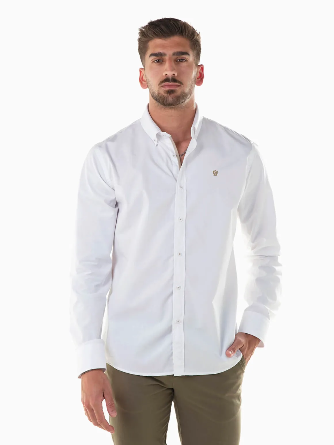 Camisa branca slim fit 100% algodão para homem. Camisa de manga comprida com símbolo bordado no peito em contraste. Colarinho americano e punhos abotoados. Aperto frontal de botões. Altura do Modelo: 182 cm | Tamanho: L