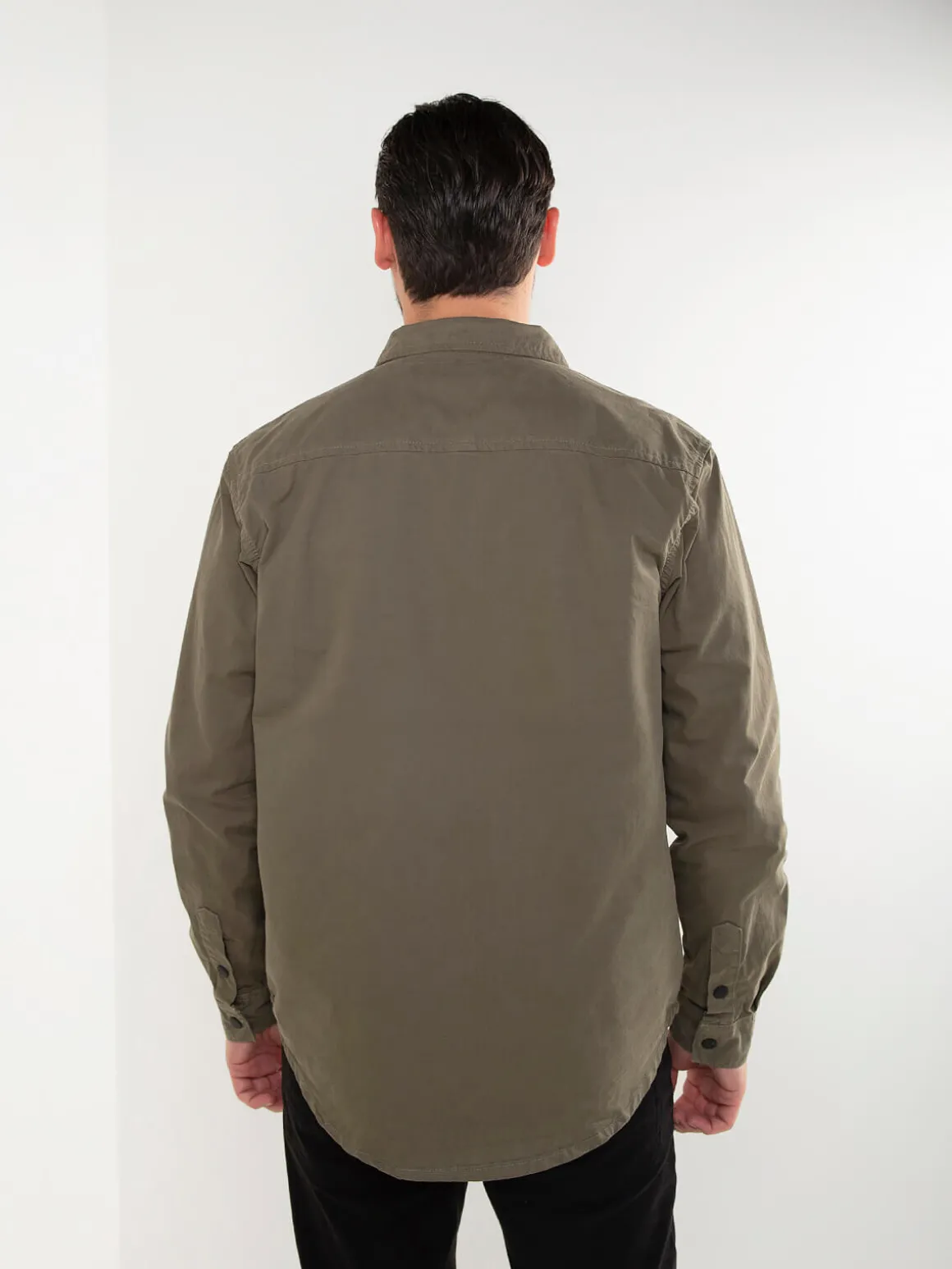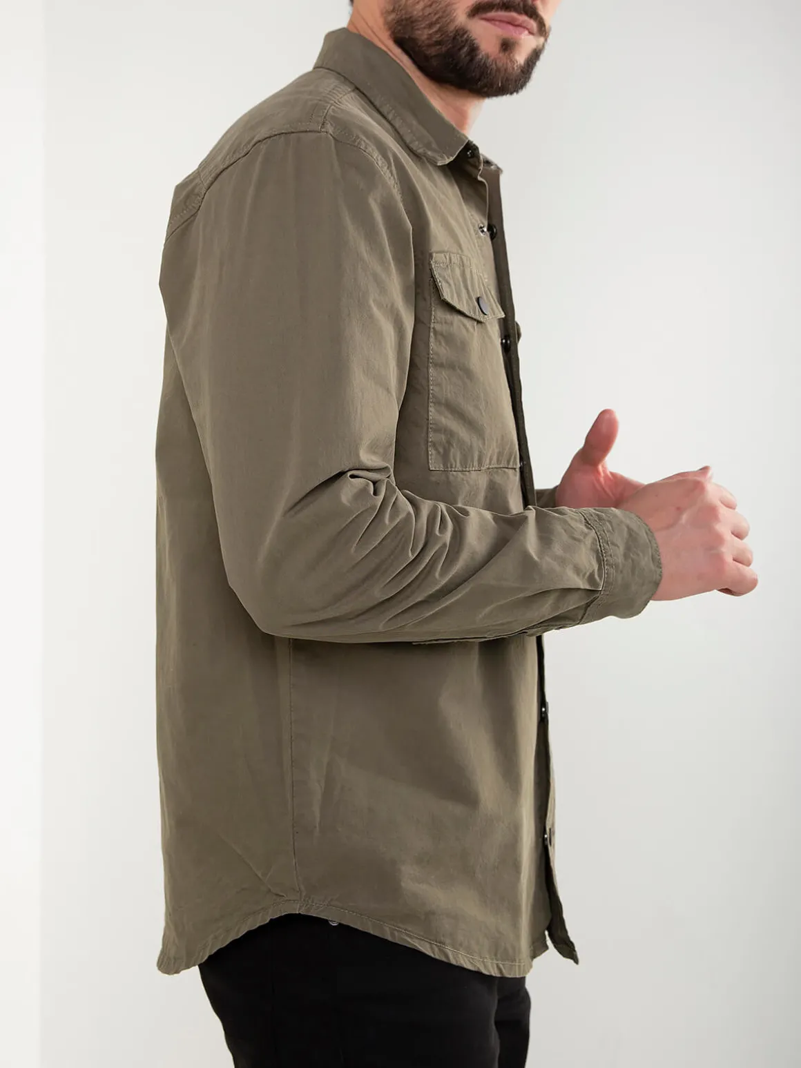 Camisa em sarja verde tropa com botões de pressão e 2 bolsos frontais. Modelo prático e confortável que resulta bem fechada para um look arrumado sem esforço.Altura do Modelo: 180 cm | Tamanho: M