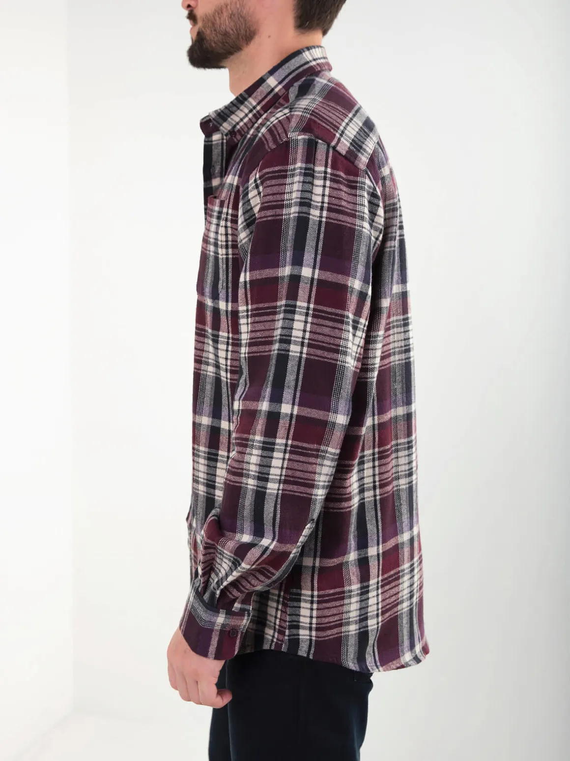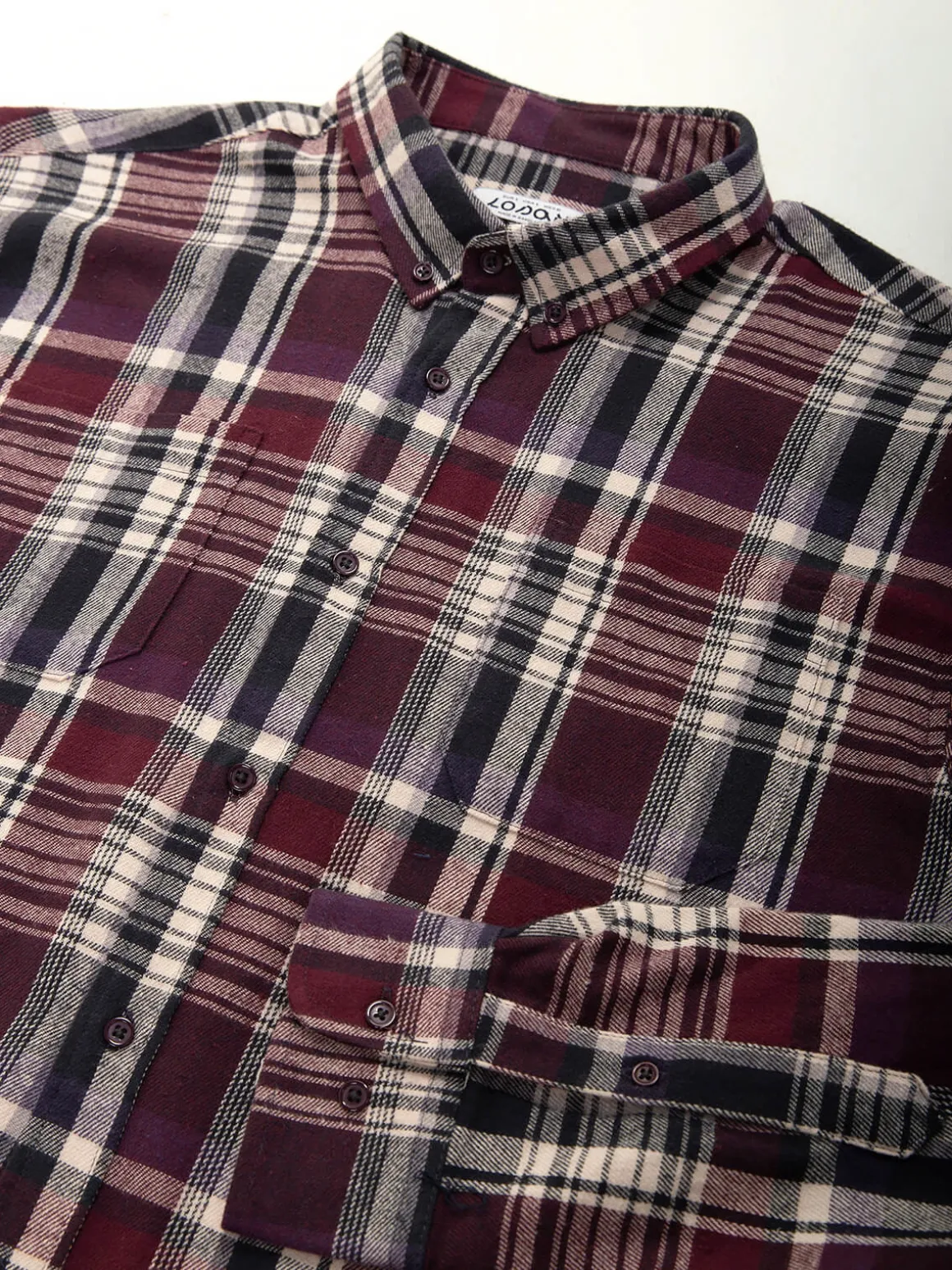 Camisa de flanela bordeaux em 100% algodão, manga comprida, colarinho americano e punhos abotoados. Modelo com bolso no peito e aperto frontal de botões. Combina com ganga escura ou calças chino castanhas para um look casual de inverno.Altura do Modelo: 180 cm | Tamanho: L