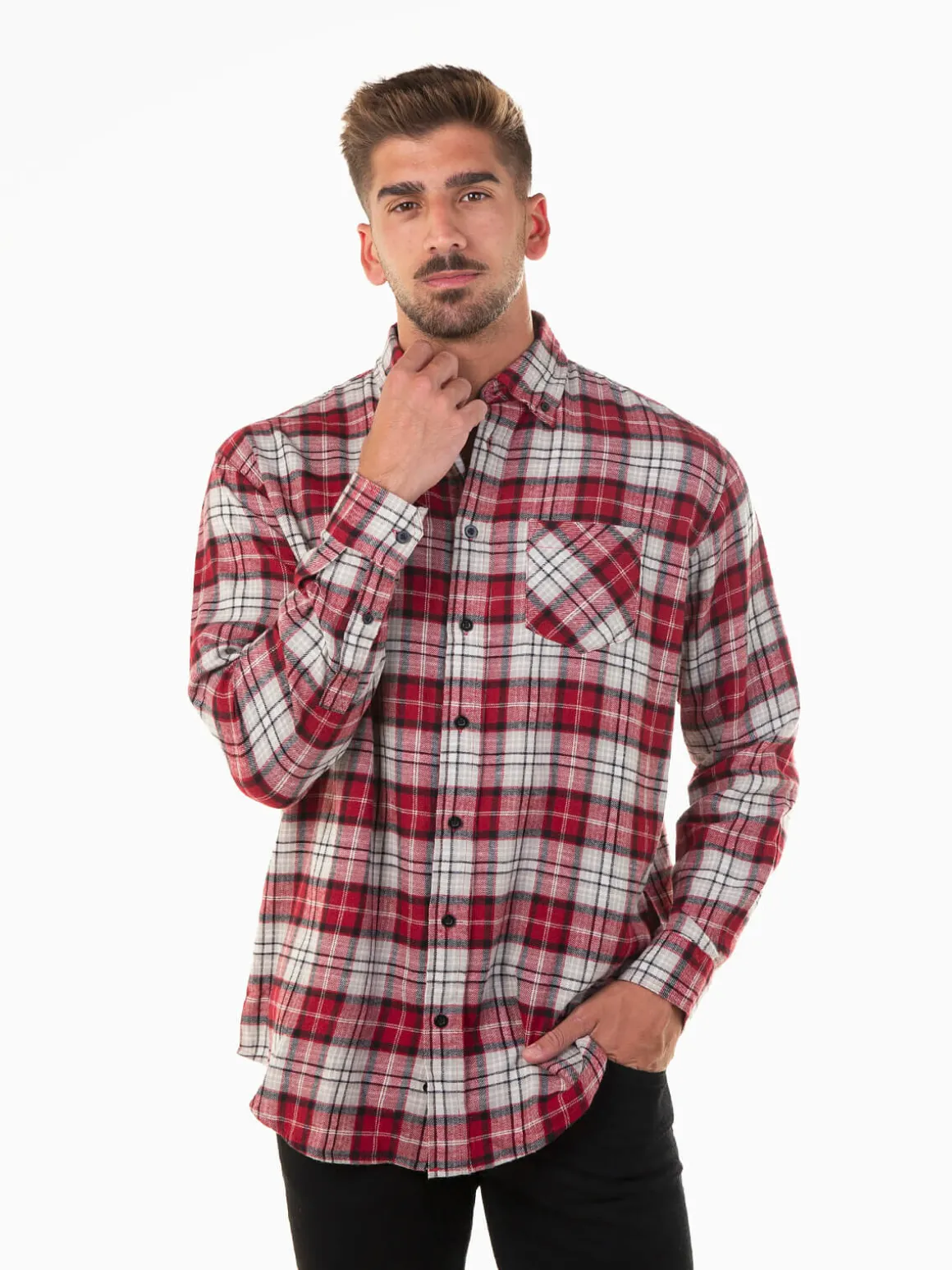 Camisa de flanela para homem em 100% algodão, com padrão xadrez clássico. Modelo de manga comprida com bolso no peito, punhos abotoados e aperto de botões à frente. O colarinho americano dá um toque descontraído e versátil, perfeito para conjugar tanto em looks casuais como em outfits mais arrumados.Altura do Modelo: 182 cm | Tamanho: L