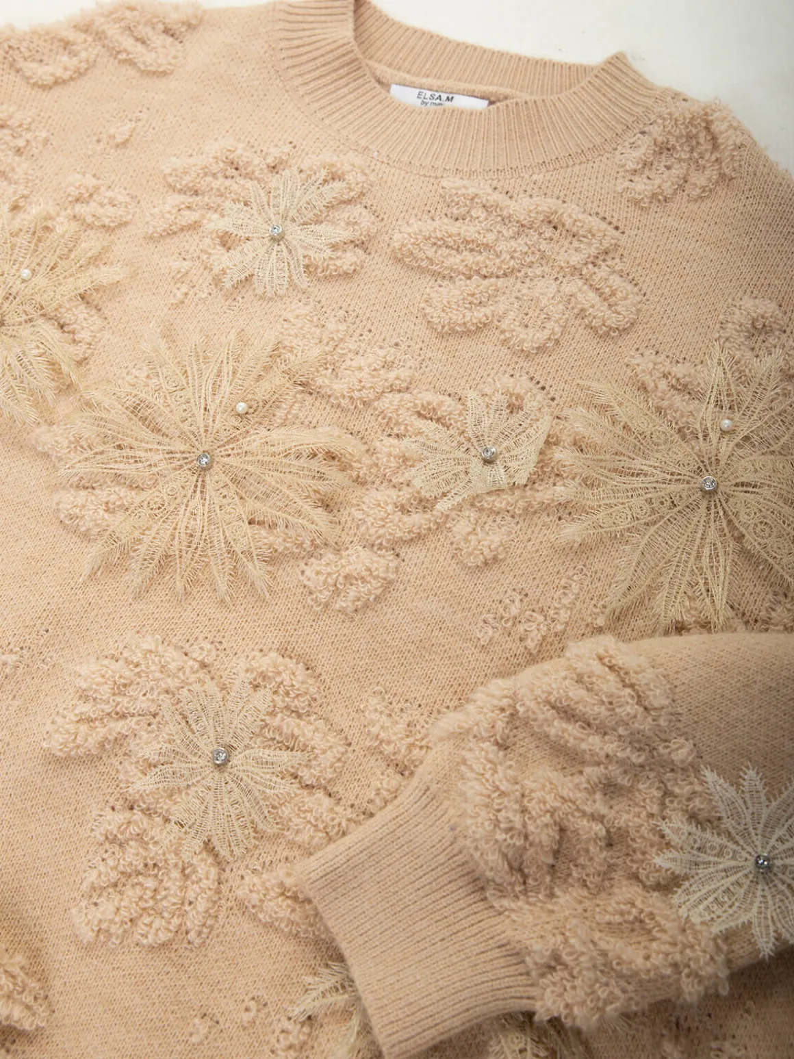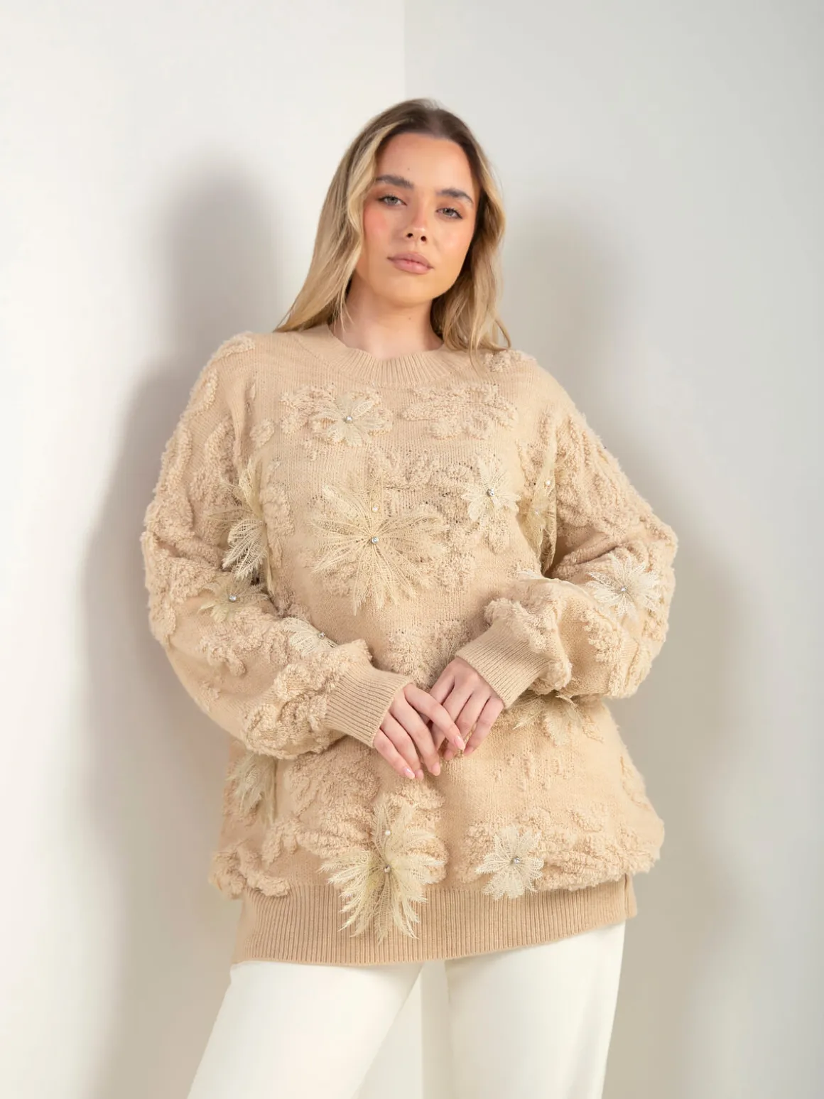 Camisola de malha com aplicações florais em relevo e pequenos apontamentos decorativos que acrescentam textura ao modelo. Gola redonda e corte oversized, ideal para elevar looks simples com calças lisas ou alfaiataria. Altura da Modelo: 166 cm | Tamanho: Tamanho Único