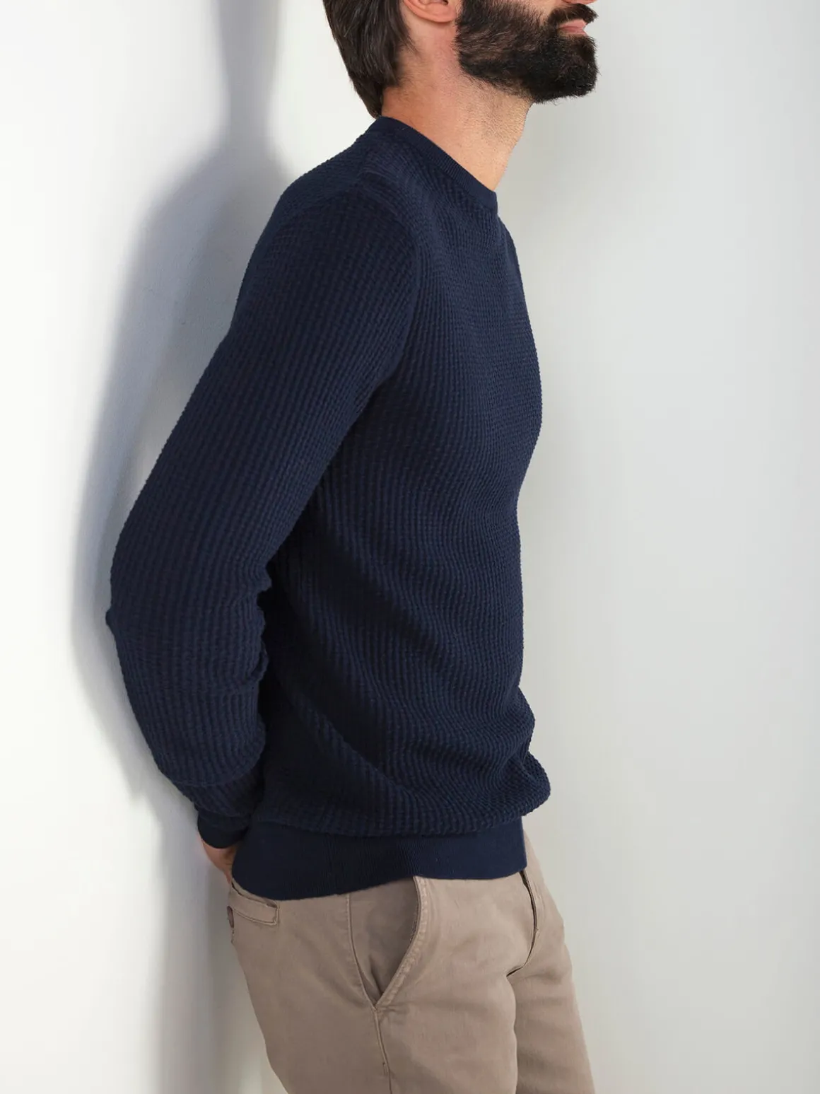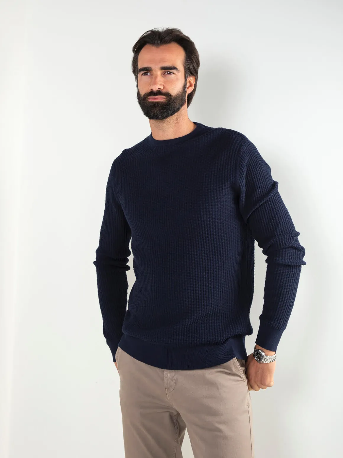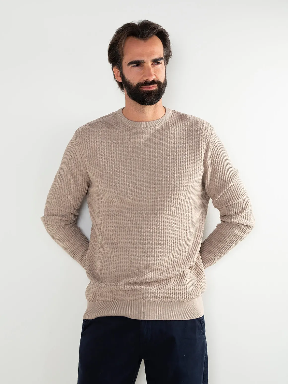 Camisola de homem em malha texturizada, com gola redonda e acabamento canelado nos punhos e bainha. Modelo confortável e versátil, ideal para looks casuais ou smart casual. Altura do Modelo: 188 cm | Tamanho: L