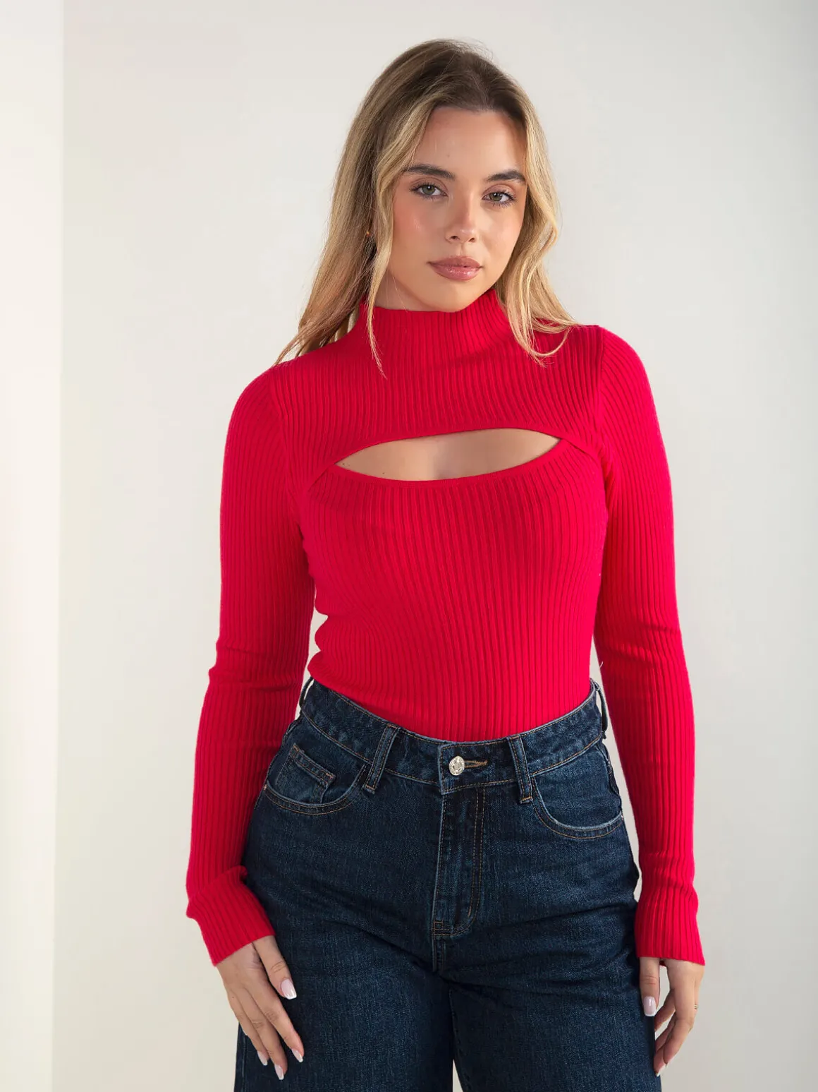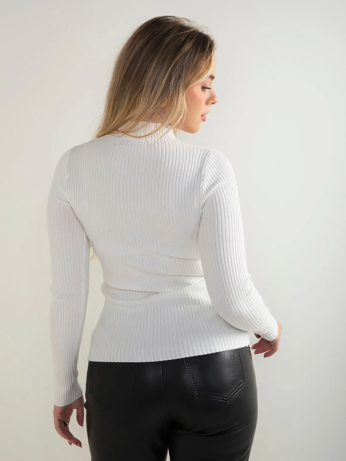 Camisola de malha canelada com recorte frontal, gola perkins e manga comprida. Modelo ajustado ao corpo e confortável para usar no dia a dia. Combina com calças efeito pele ou jeans de cintura alta.Altura da Modelo: 166 cm | Tamanho: S/M