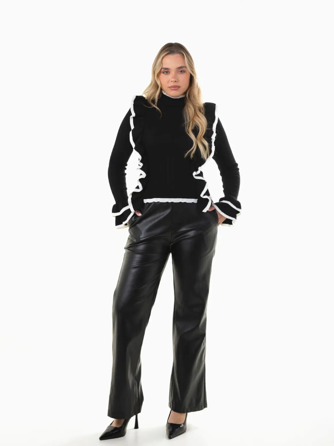 Camisola de malha canelada com folhos em contraste nas mangas e laterais. Modelo de gola subida e manga comprida com acabamento em volante. Um design feminino e atual, ideal para elevar looks do dia-a-dia.Altura da Modelo: 166 cm | Tamanho: Tamanho Único