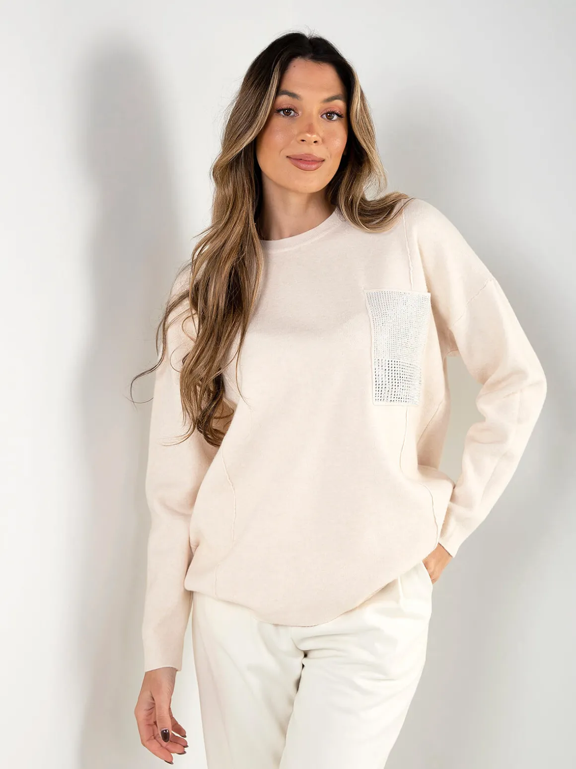 Camisola de malha macia e corte largo, com gola redonda e bolso frontal com aplicação de strass. Um modelo confortável com um detalhe discreto que faz a diferença no look.Altura da Modelo: 175 cm | Tamanho: Tamanho Único