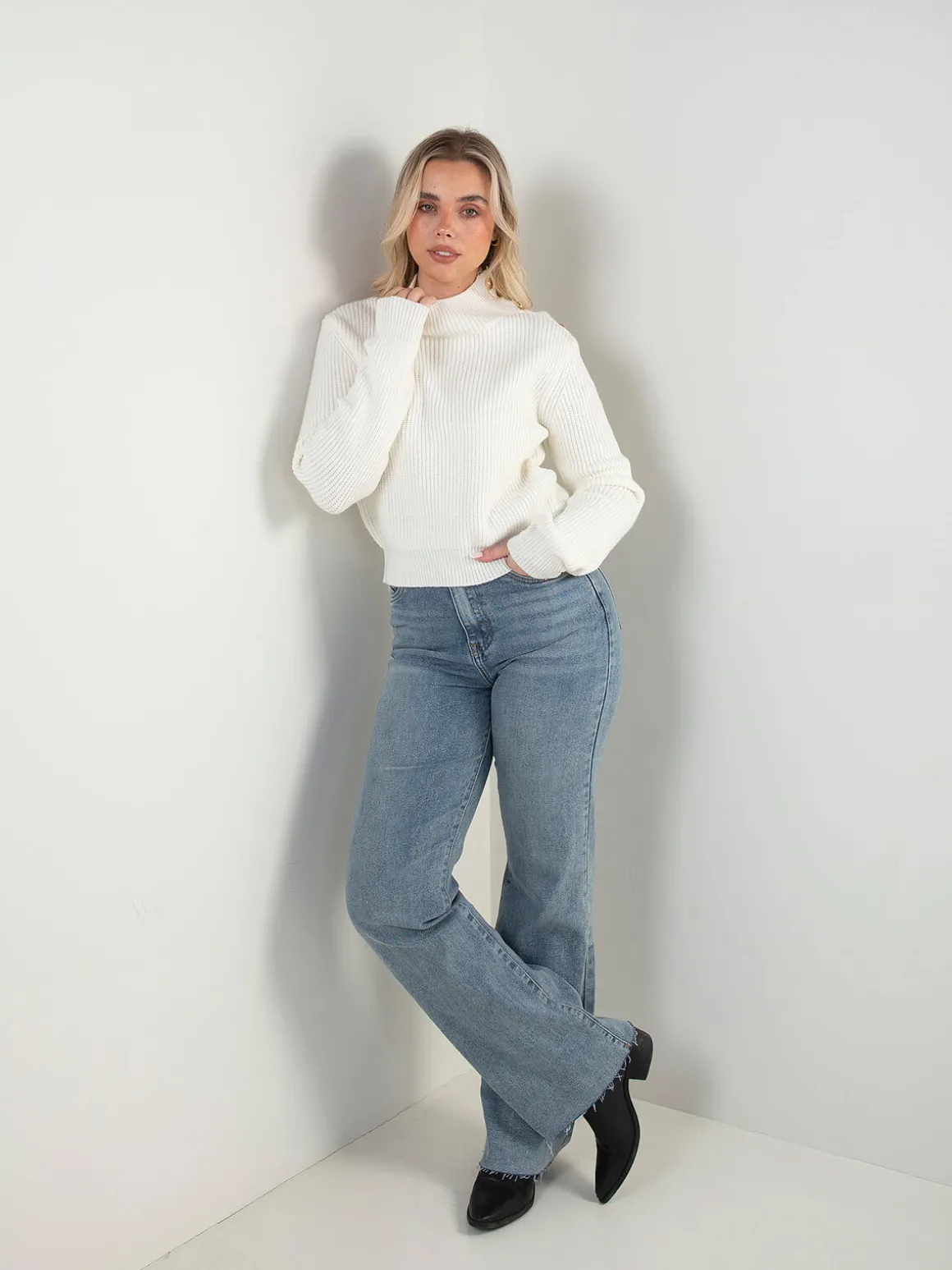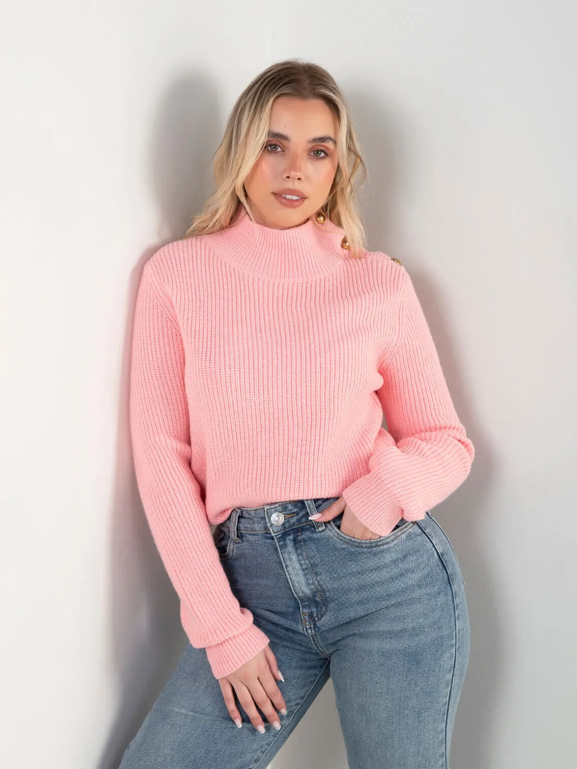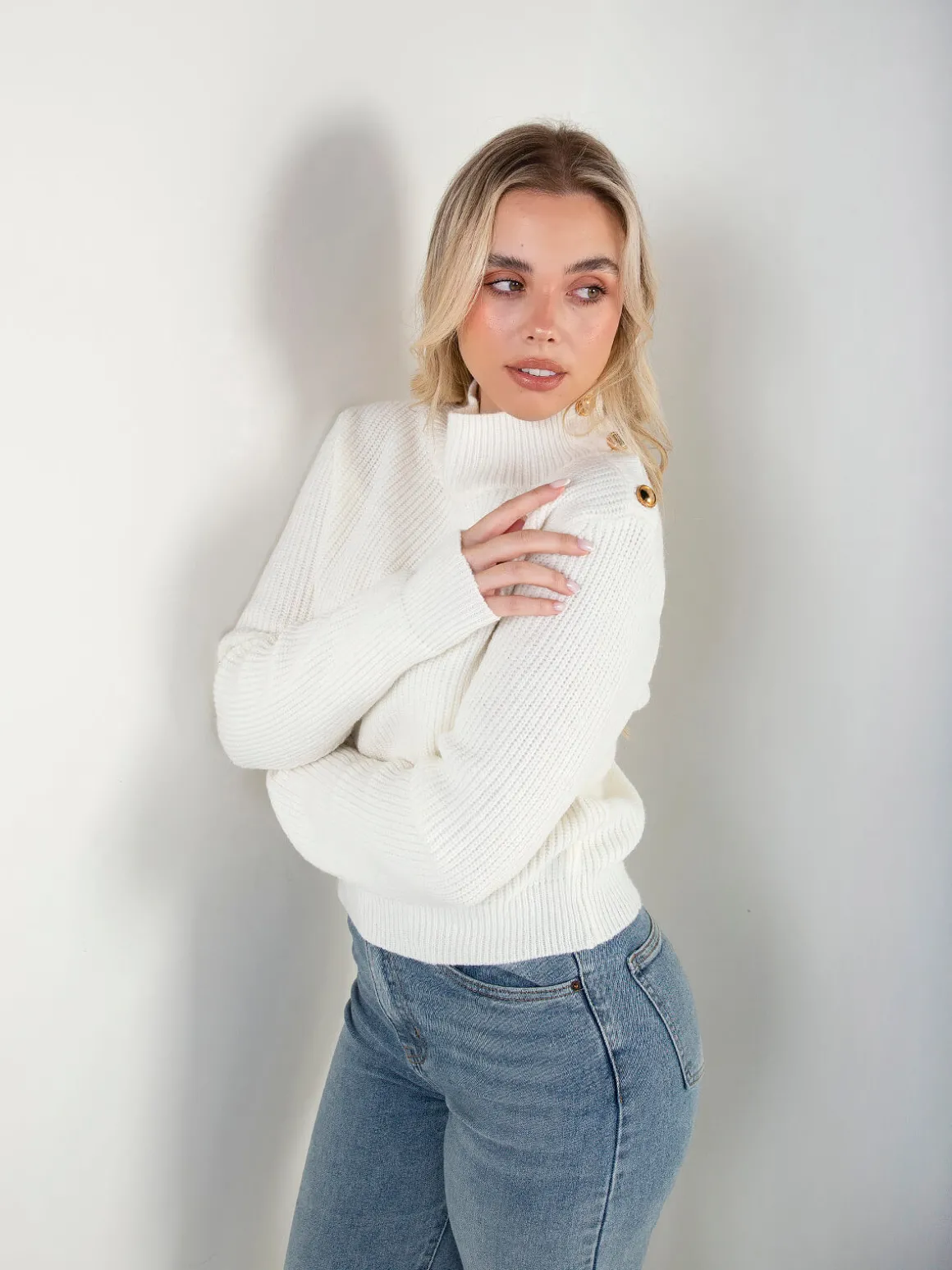 Camisola em malha de textura encorpada, com gola perkins e detalhe de botões metálicos no ombro. Um essencial com apontamento diferenciado.Altura da Modelo: 166 cm | Tamanho: Tamanho Único