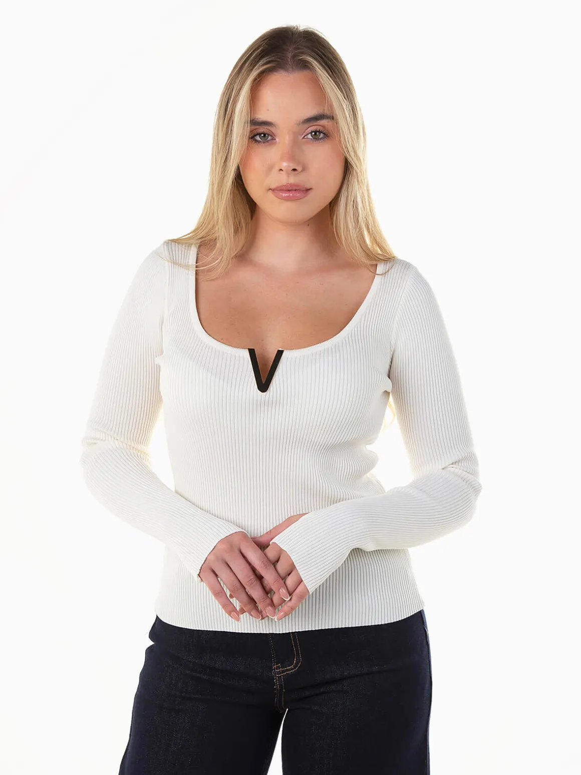 Camisola de malha canelada com decote redondo e abertura em V com chapa dourada. Manga comprida, versátil e perfeita para looks modernos e sofisticados.Altura da Modelo: 166 cm | Tamanho: Tamanho Único