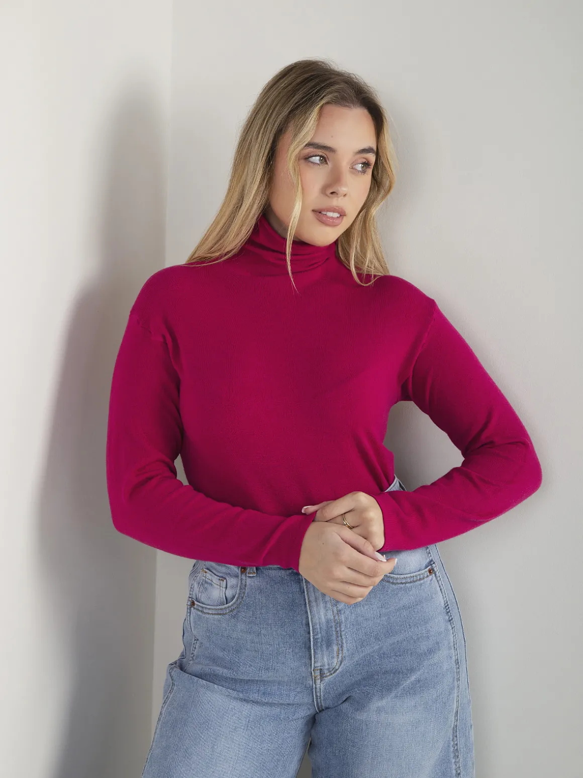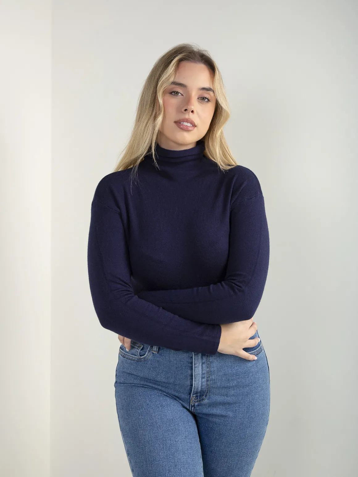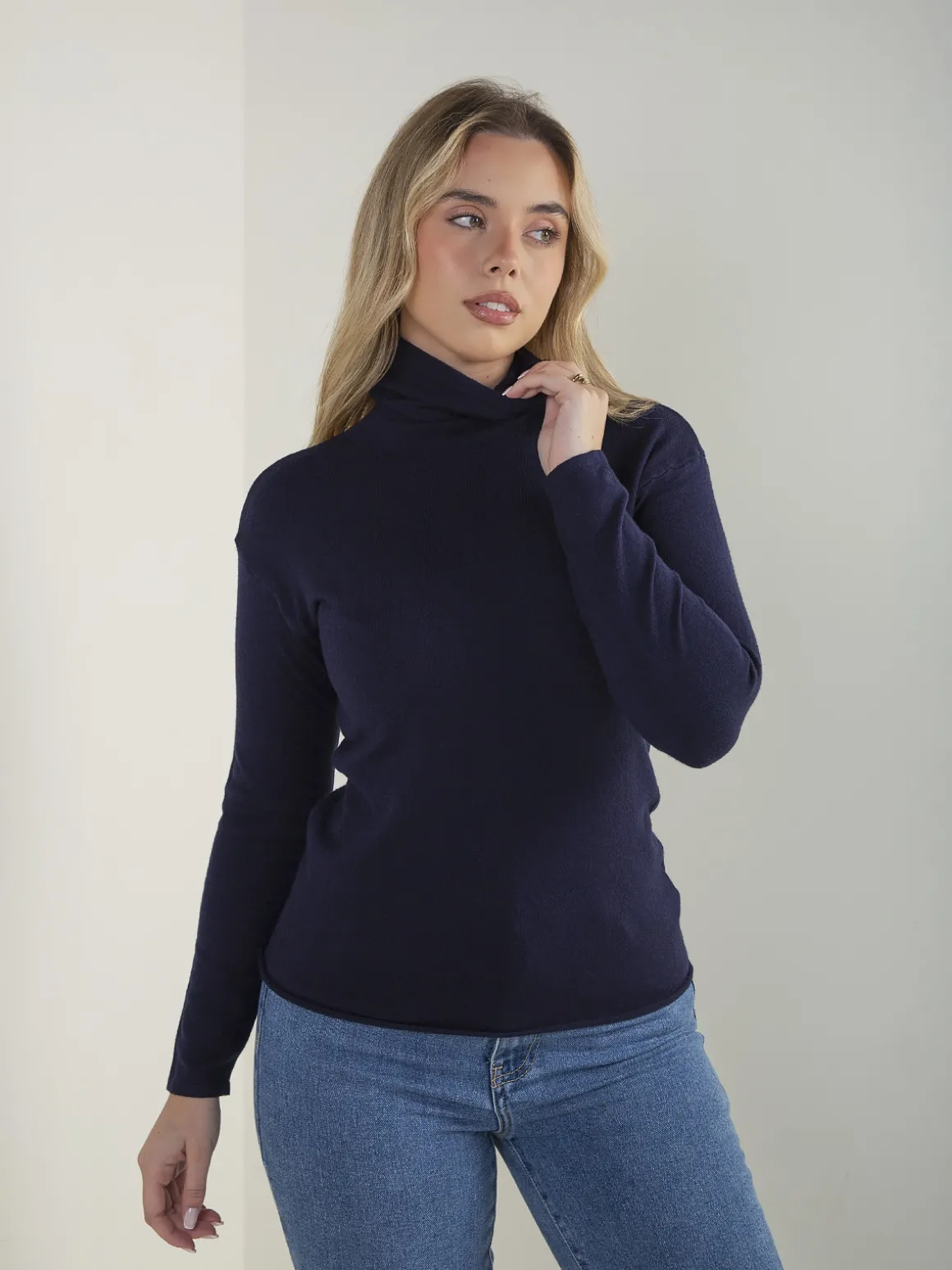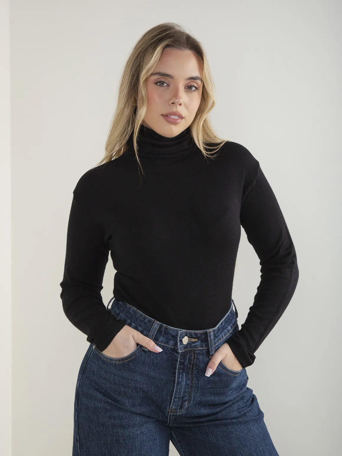 Camisola de malha fina com gola rolling, manga comprida e corte confortável. Modelo básico e versátil, fácil de conjugar no dia a dia.Altura da Modelo: 166 cm | Tamanho: S/M