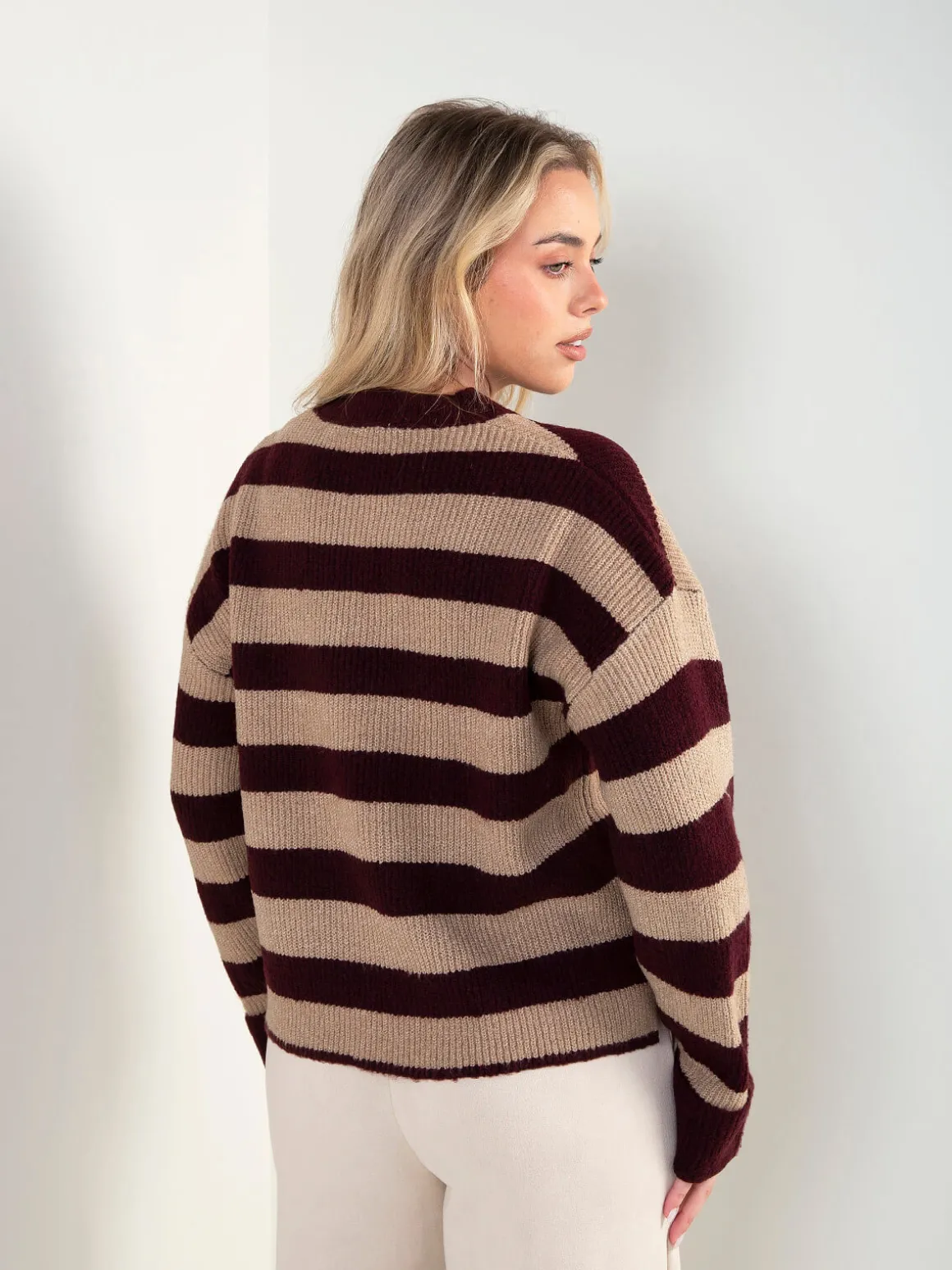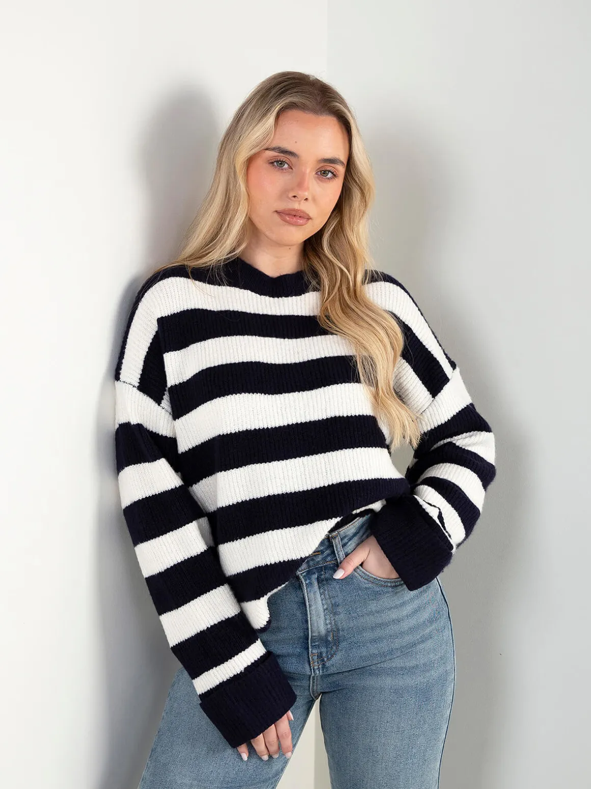 Camisola em malha com padrão às riscas e decote redondo. Um clássico intemporal, fácil de combinar em looks casuais ou mais cuidados.Altura da Modelo: 166 cm | Tamanho: S/M