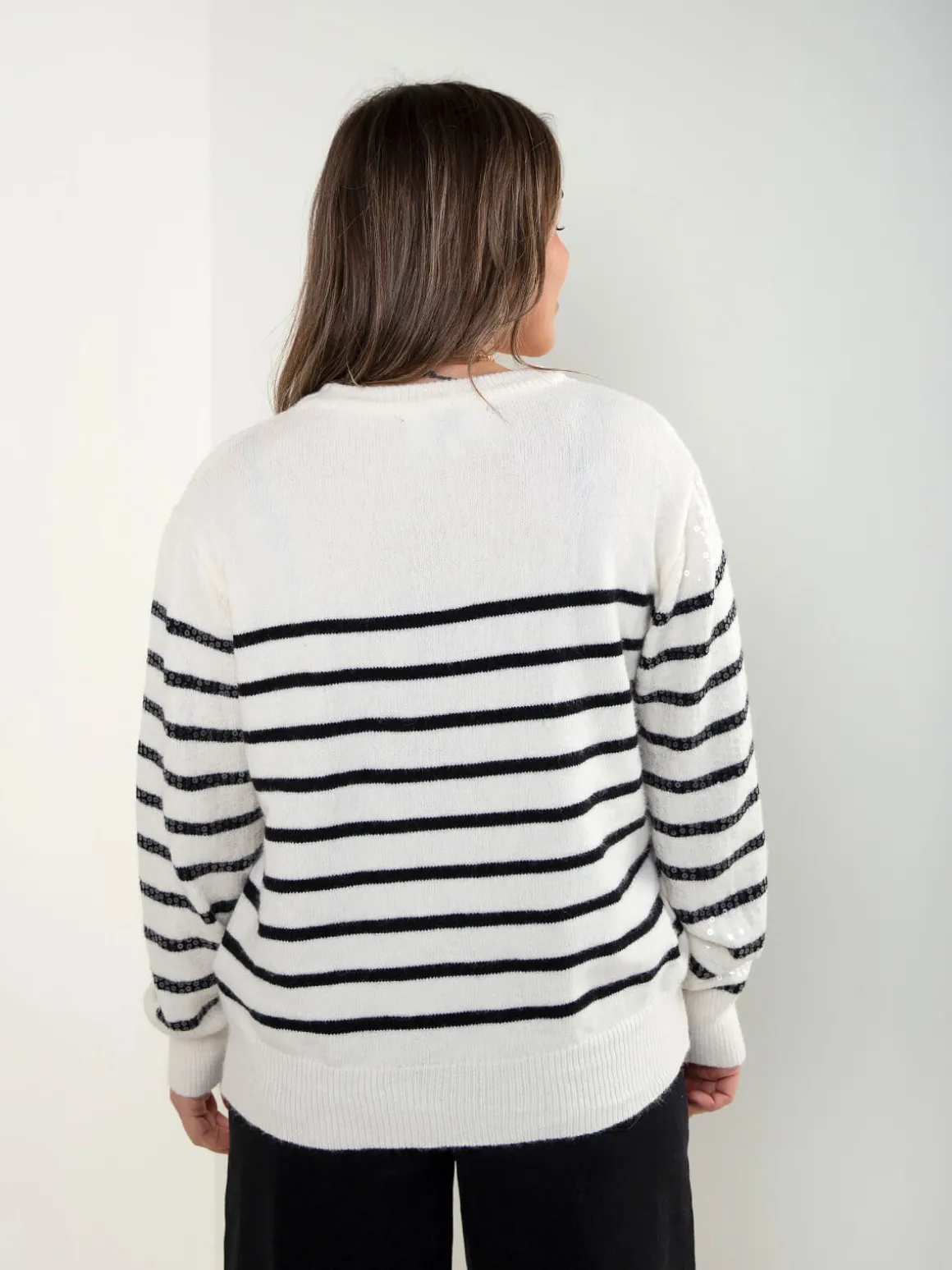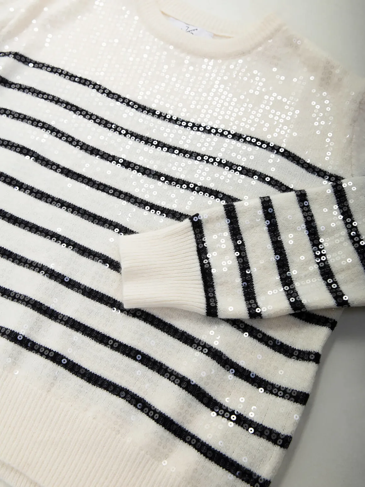Camisola de malha às riscas com lantejoulas aplicadas para efeito brilhante. Camisola de manga comprida com ombros descaídos e acabamentos canelados. Decote redondo. Altura da Modelo: 160 cm | Tamanho: Tamanho Único