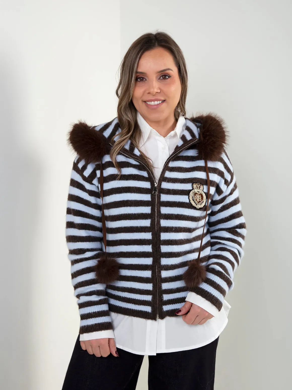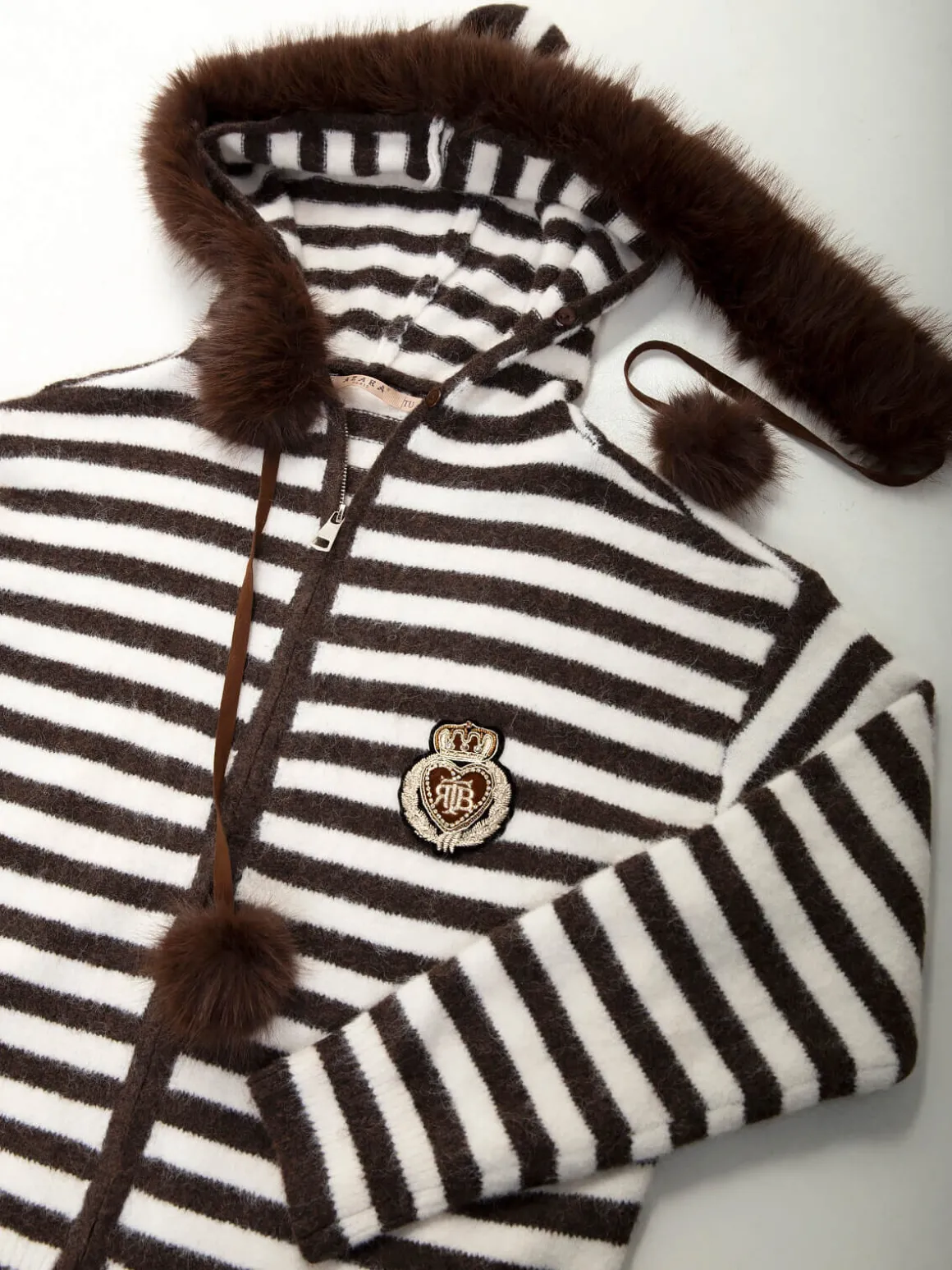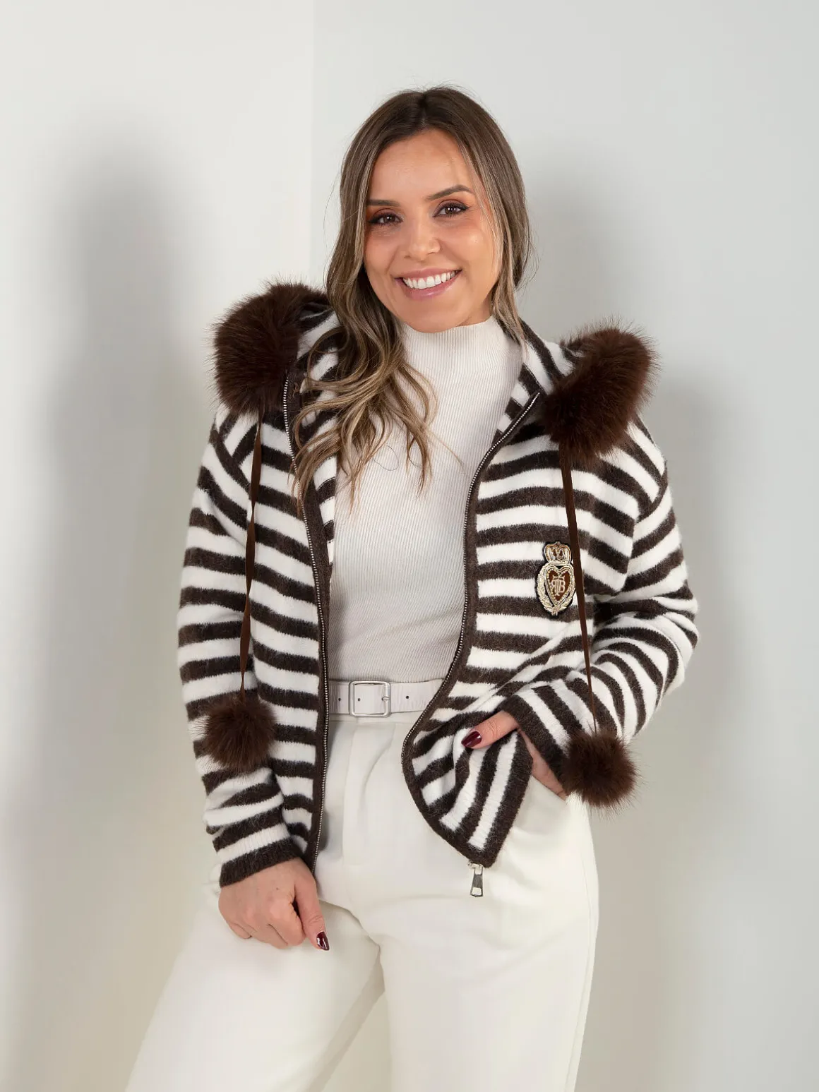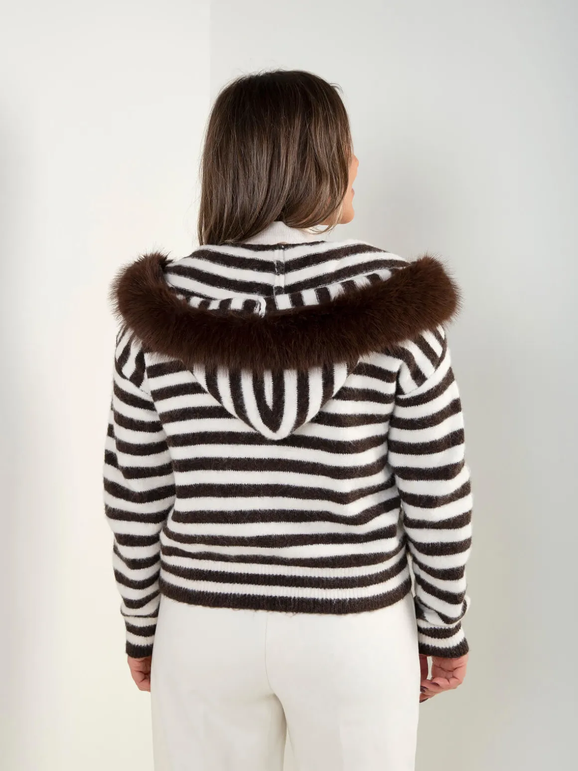 Casaco de senhora em malha suave, com padrão às riscas e fecho frontal. Capuz com detalhe em pelo sintético removíveis e cordões. Manga comprida e acabamentos canelados para um ajuste confortável.Altura da Modelo: 160 cm | Tamanho: Tamanho Único
