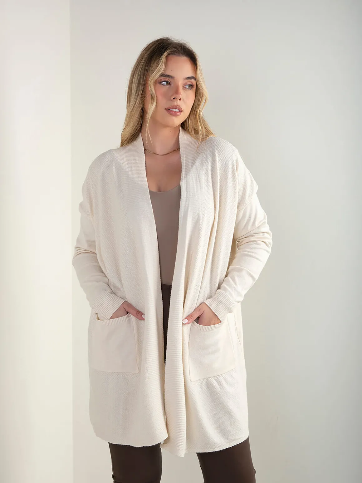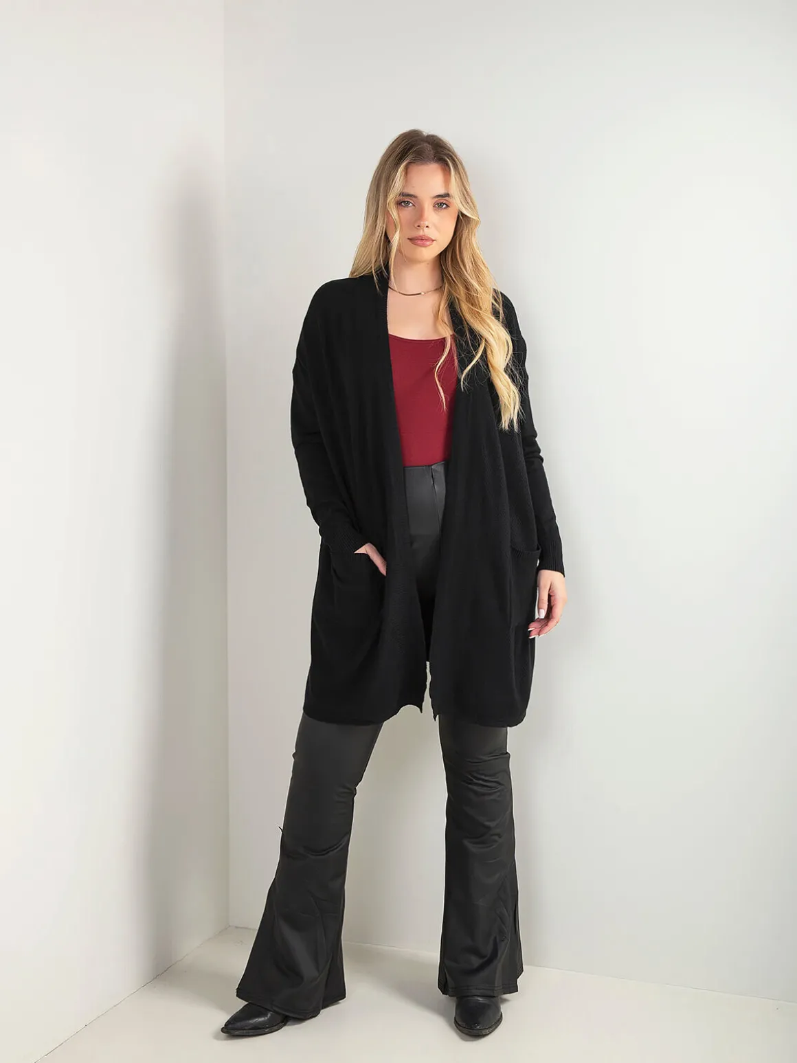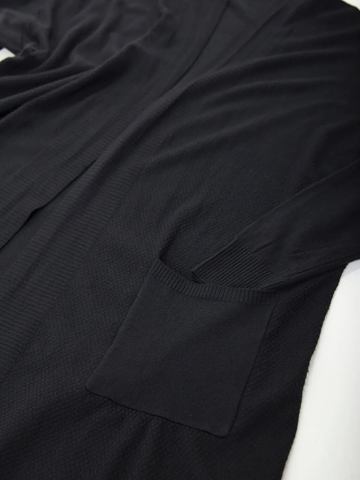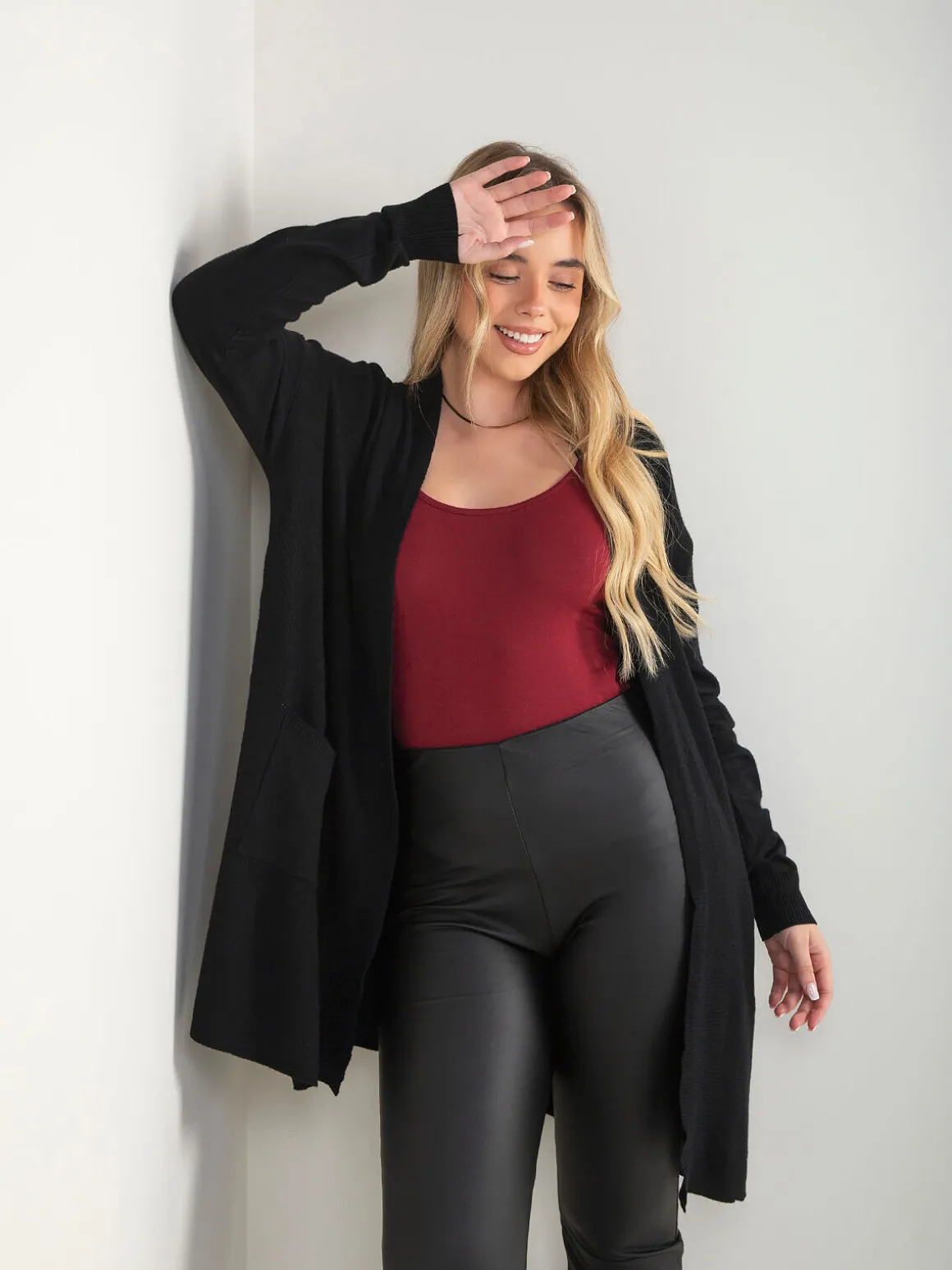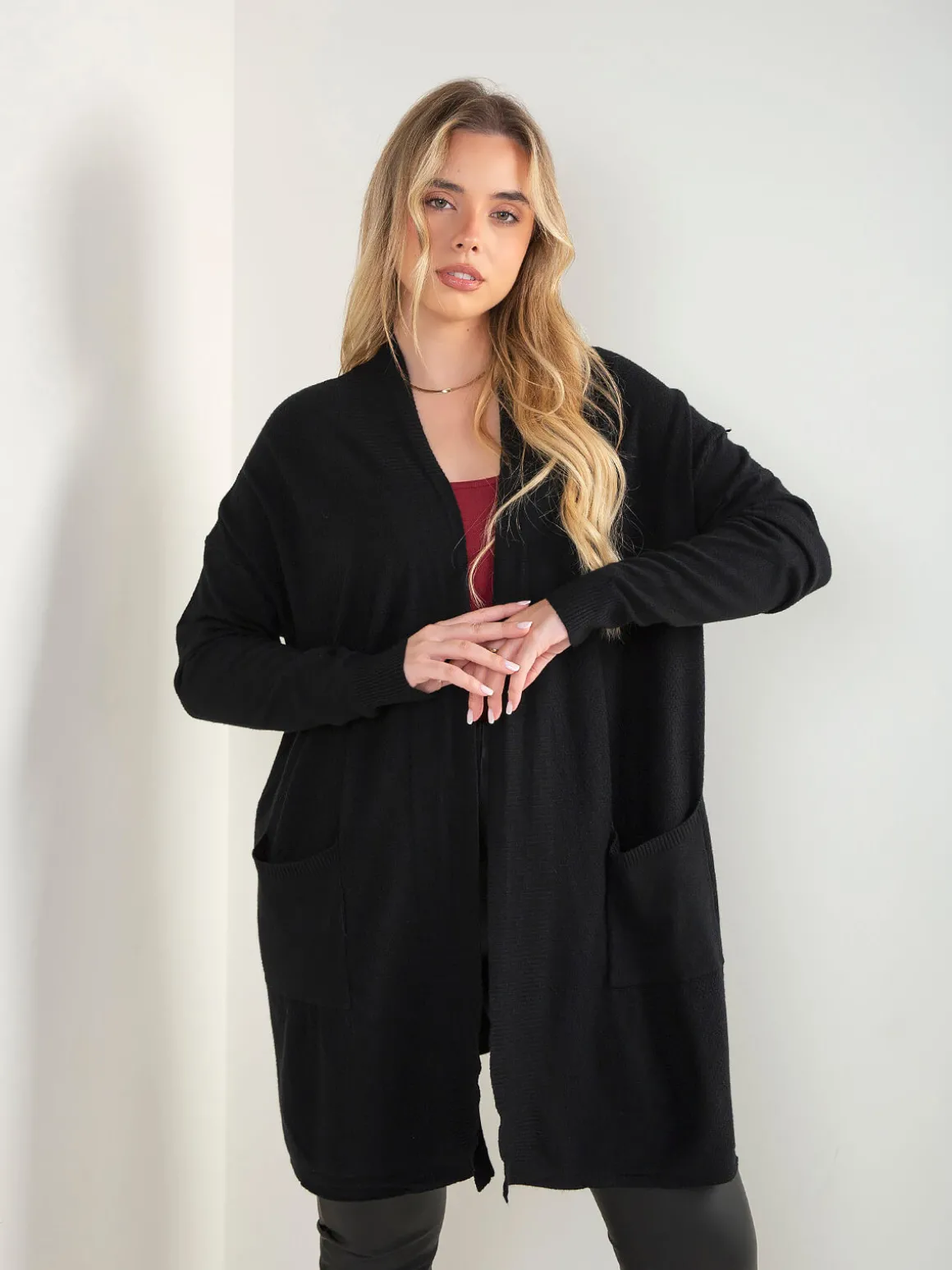 Casaco de malha comprido e aberto, com bolsos frontais e malha fina estruturada. Modelo leve e confortável, ideal para usar no dia a dia sobre tops ou malhas básicas.Altura da Modelo: 166 cm | Tamanho: Tamanho Único