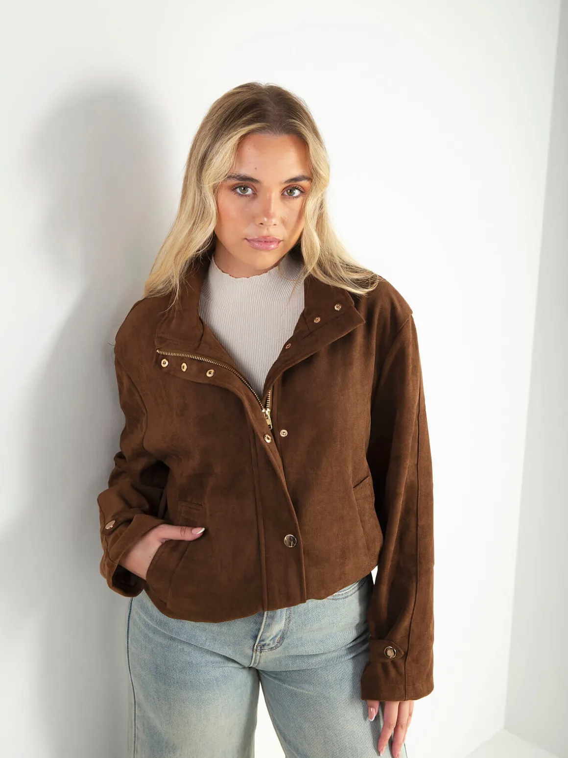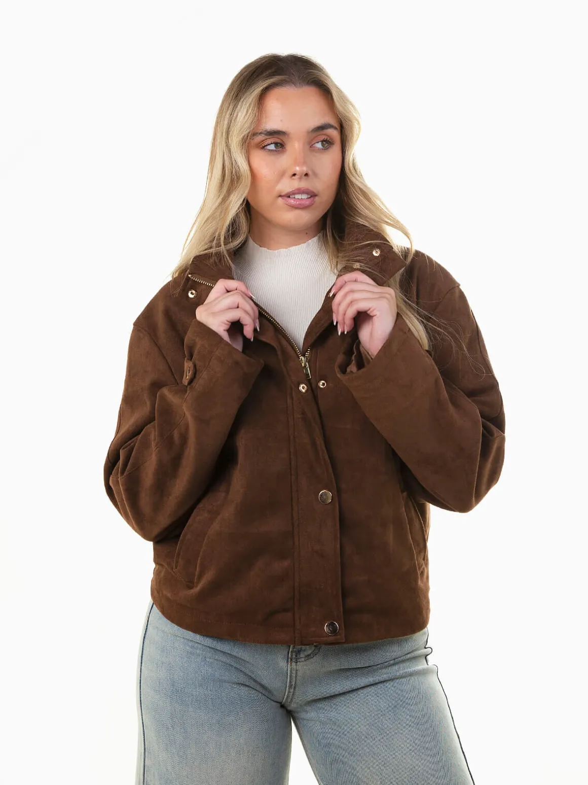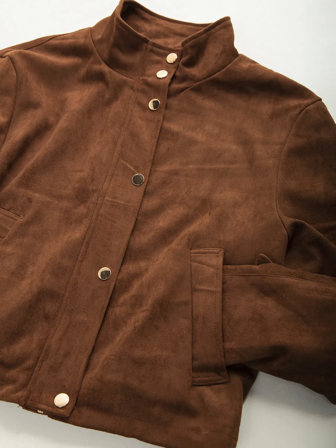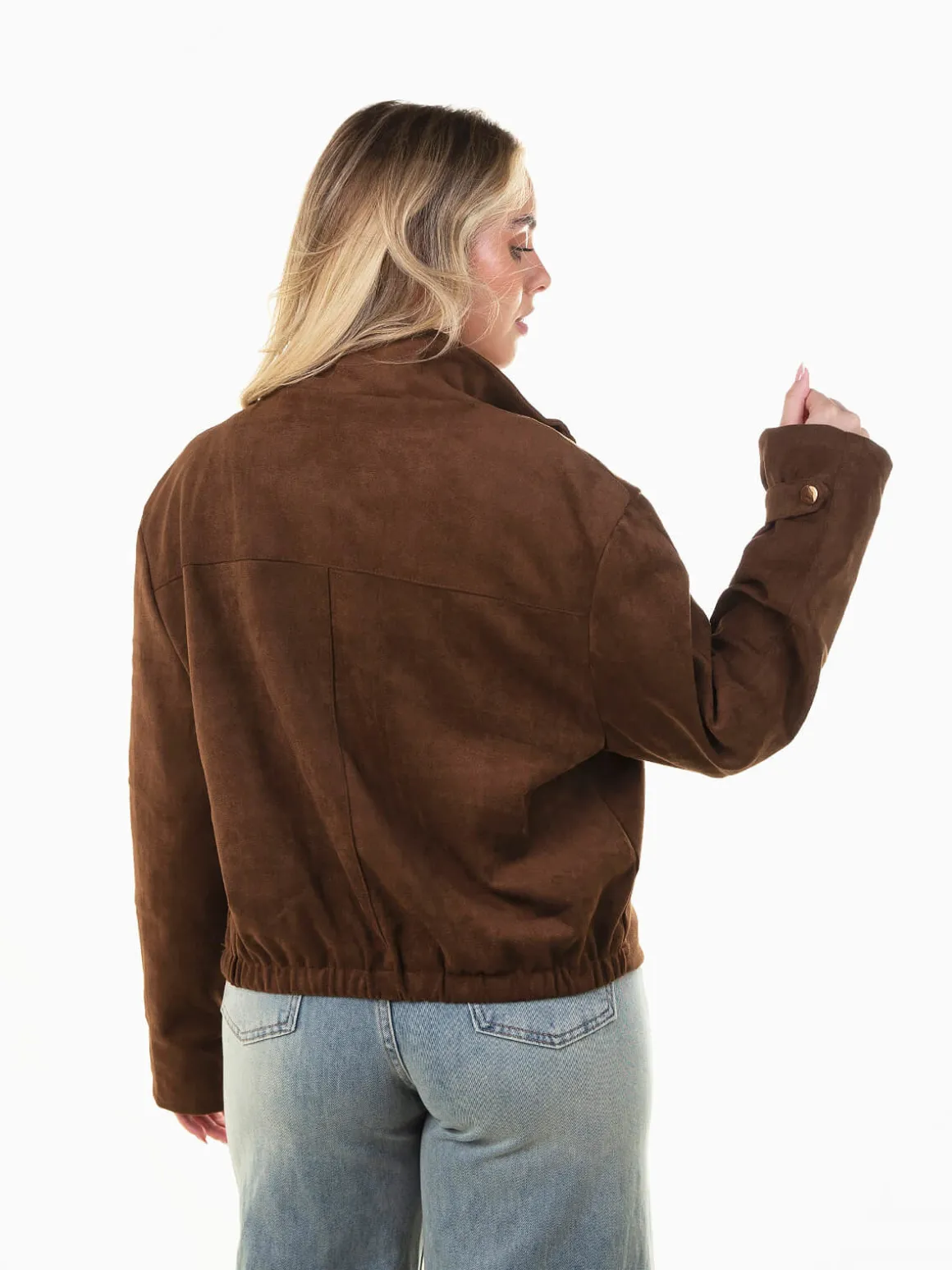 Blusão efeito camurça com gola subida e interior forrado para maior conforto. Modelo com presilhas decorativas e 2 bolsos frontais. Aperto de fecho zíper e botões de pressão. Uma peça tendência da estação, perfeita para looks modernos e elegantes.Altura da Modelo: 166 cm | Tamanho: S
