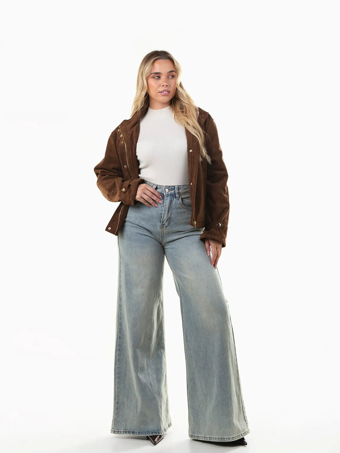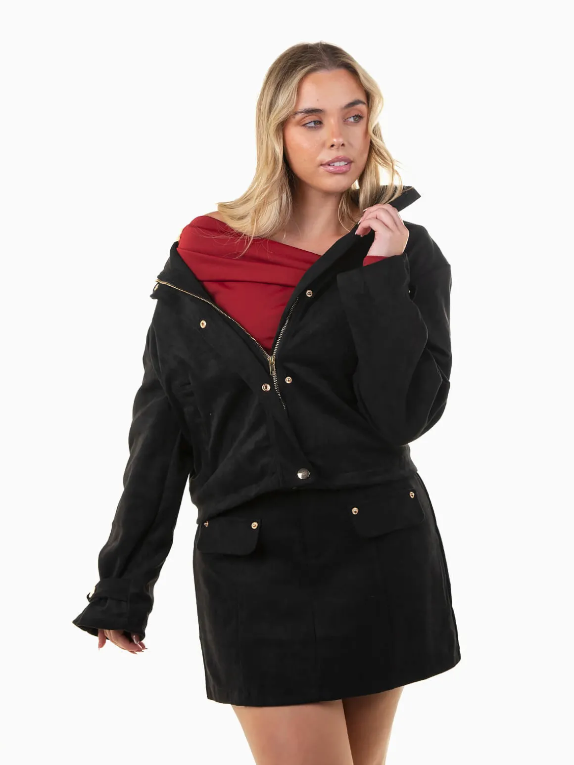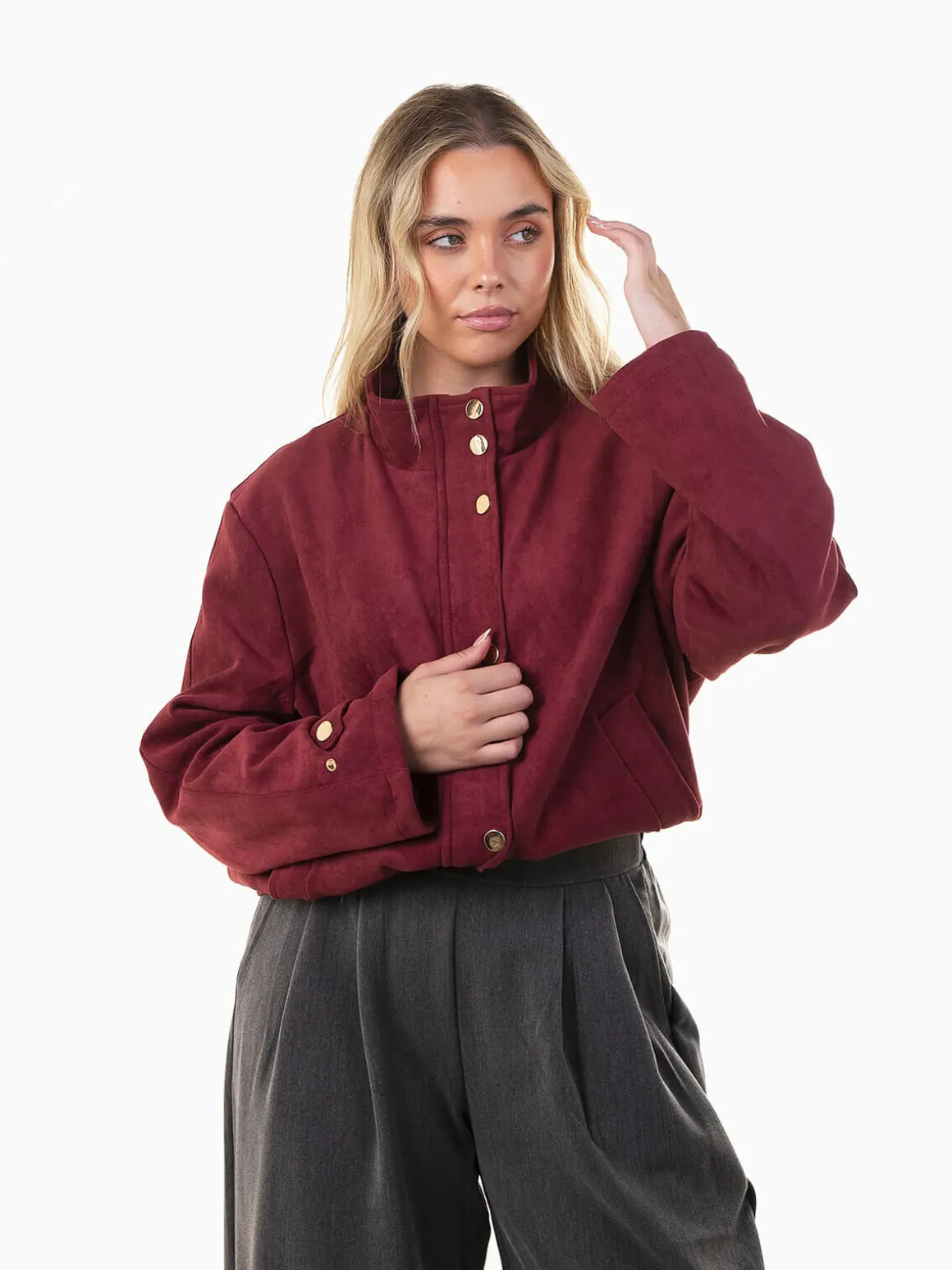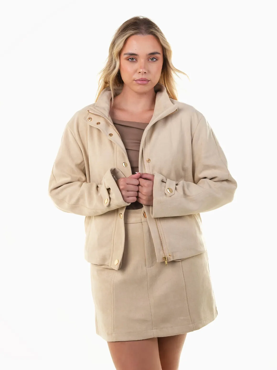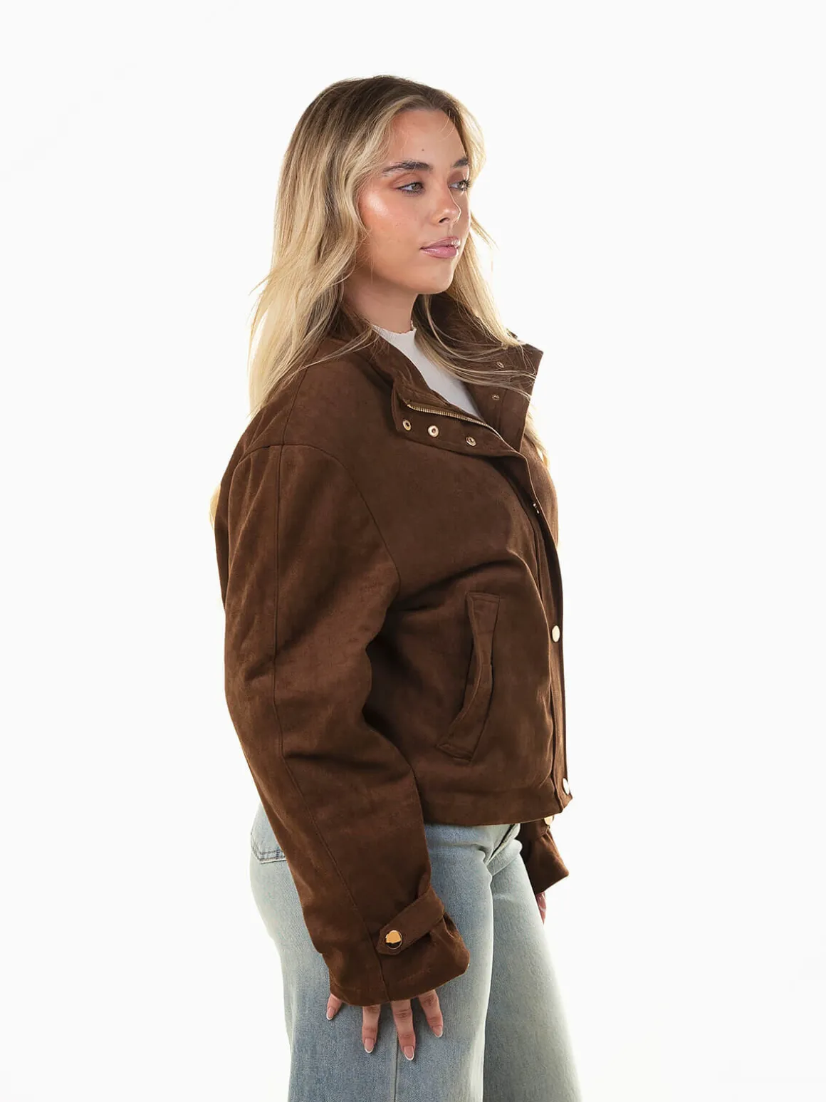 Blusão efeito camurça com gola subida e interior forrado para maior conforto. Modelo com presilhas decorativas e 2 bolsos frontais. Aperto de fecho zíper e botões de pressão. Uma peça tendência da estação, perfeita para looks modernos e elegantes.Altura da Modelo: 166 cm | Tamanho: S