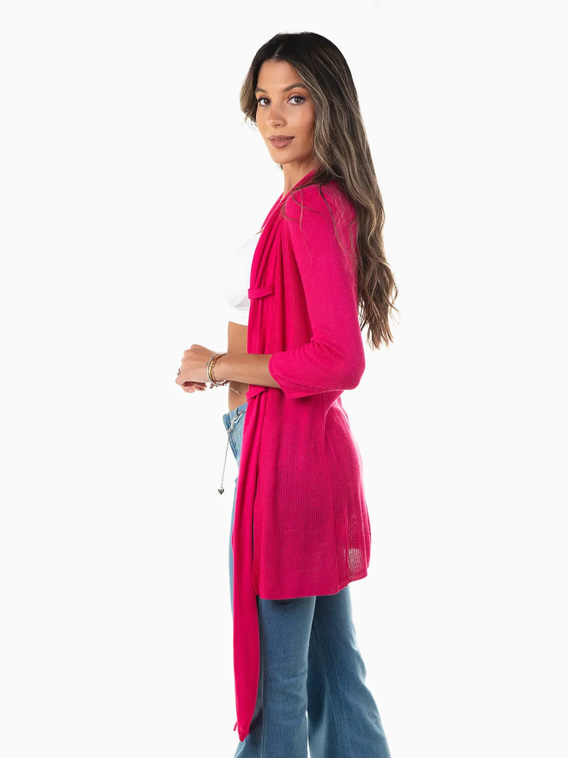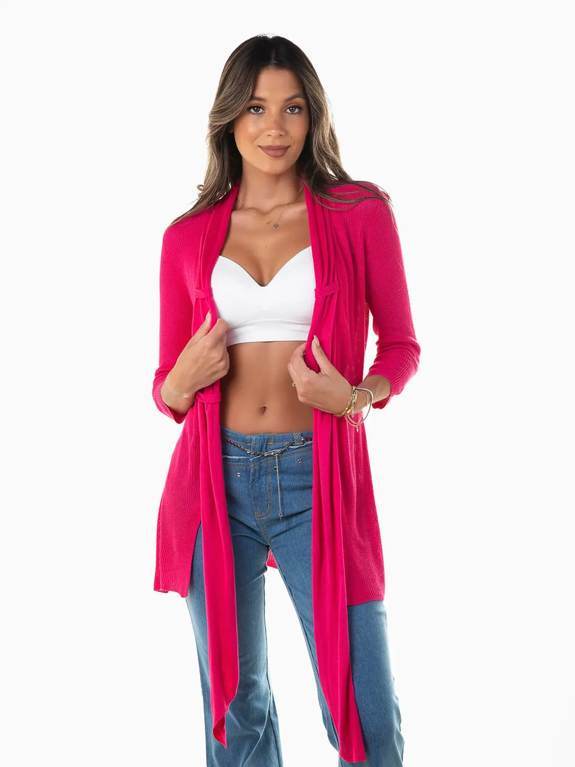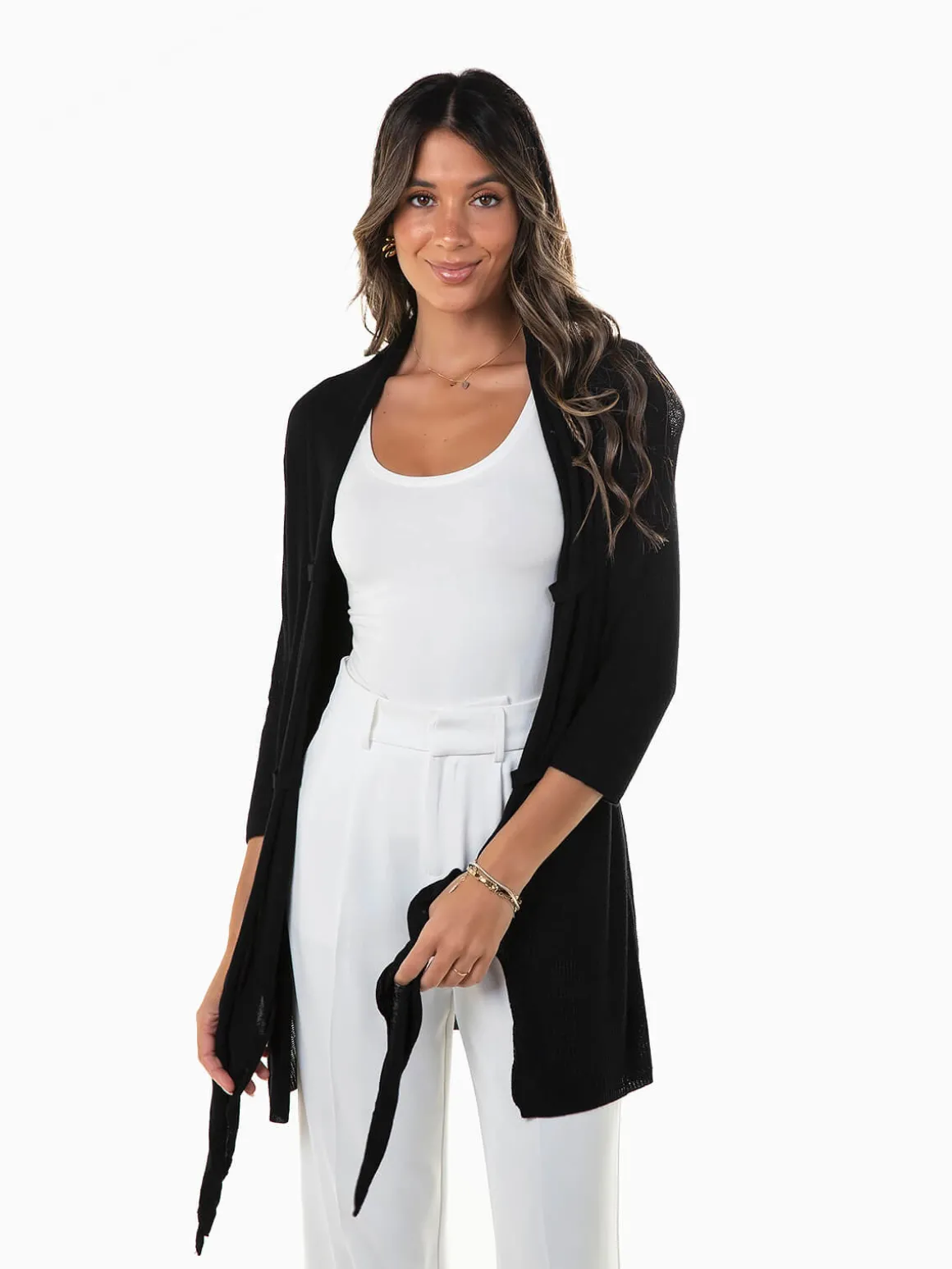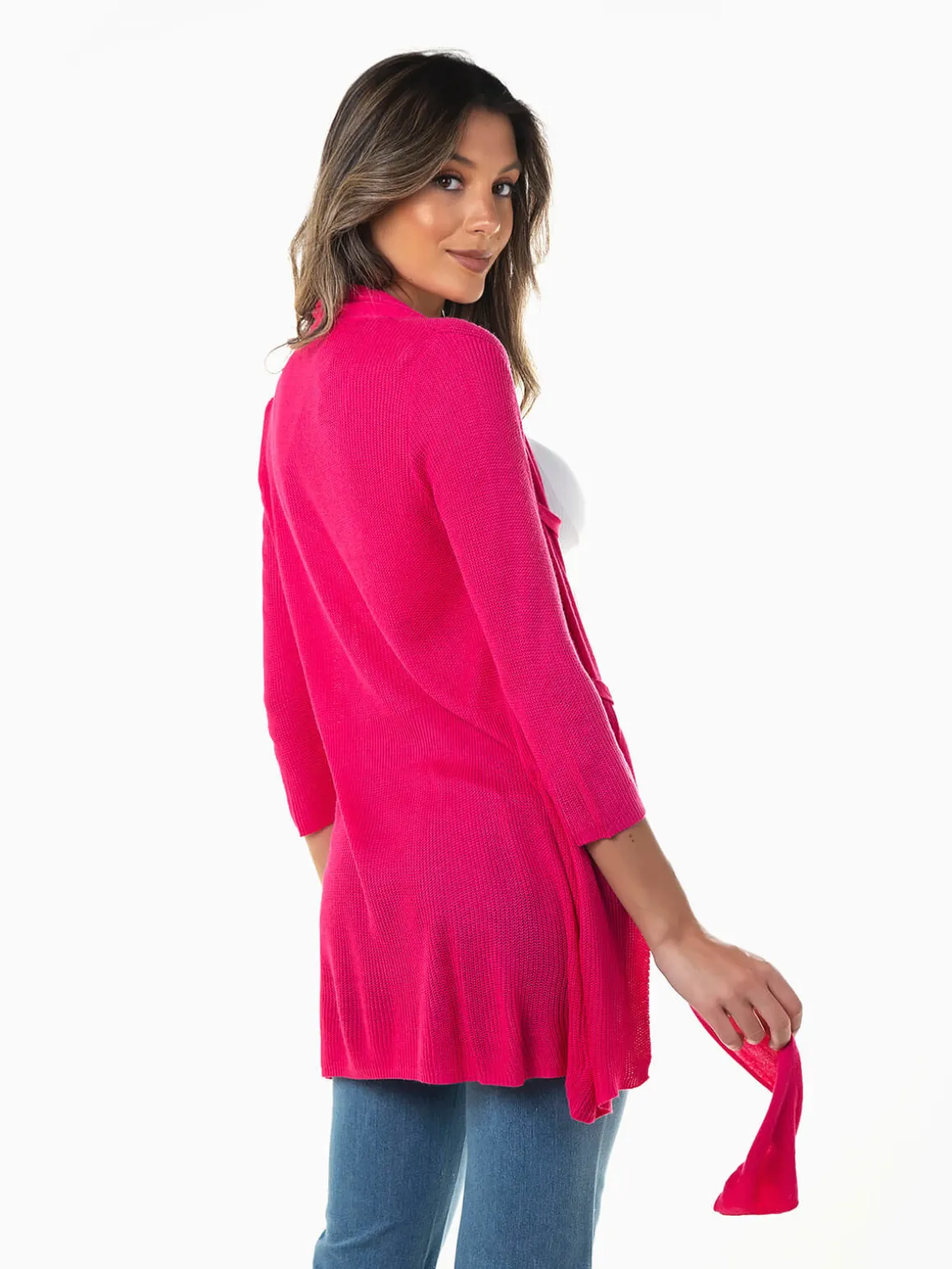 Casaco malha fina aberta com manga 3/4 para senhora. Casaco comprido aberto com parte frontal mais comprida e fivelas. Altura da Modelo: 175 cm | Tamanho: Tamanho Único