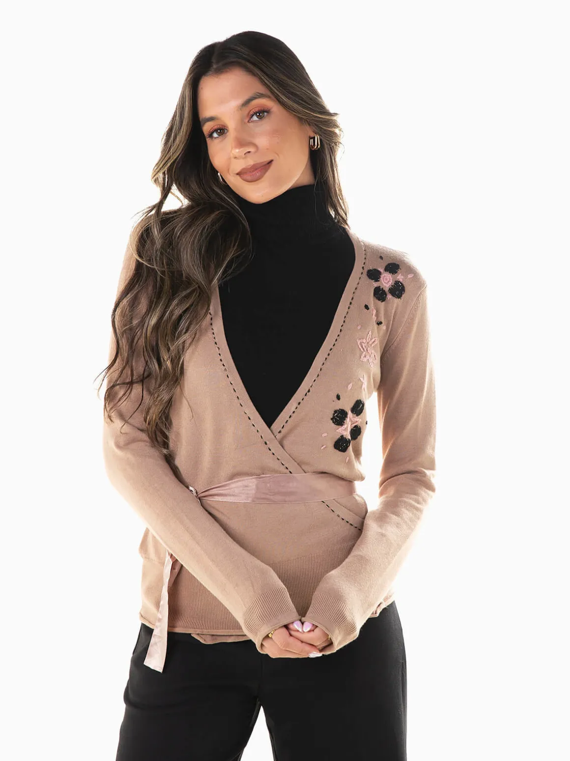 Casaco de malha com cinto acetinado para ajustar. Cardigan de trespasse com manga comprida e acabamentos rolling. Decote em V. Altura da Modelo: 175 cm | Tamanho: S/M