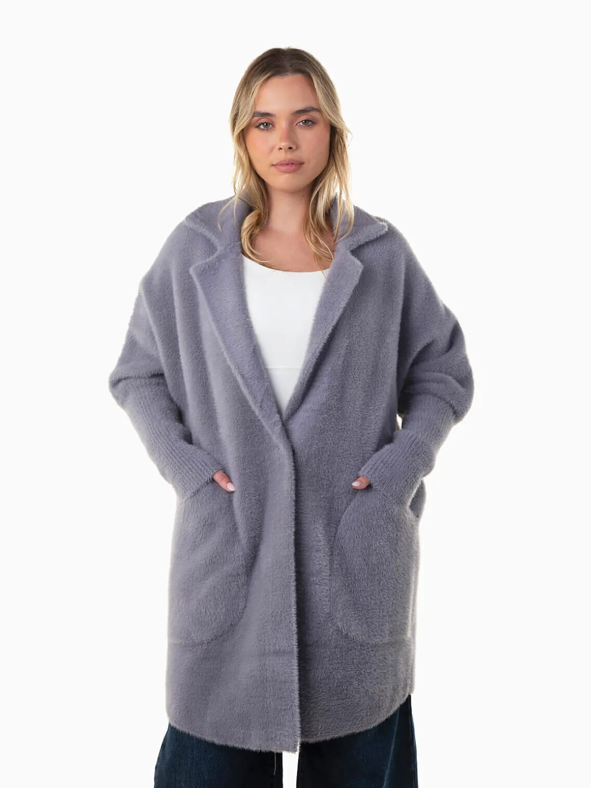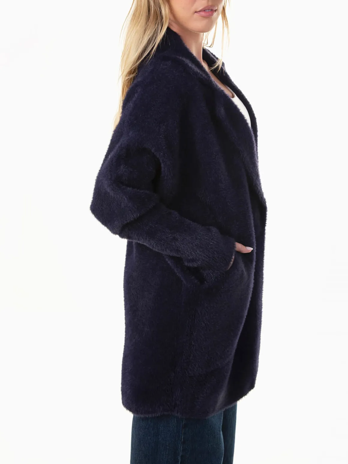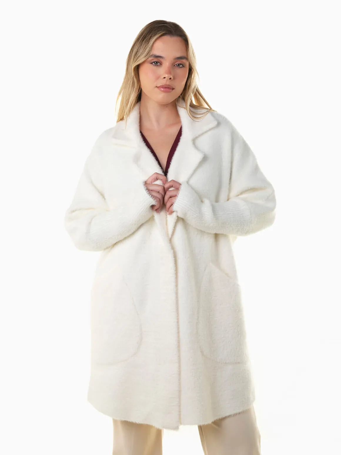 Casaco comprido efeito pelo para senhora. Casaco manga comprida com punho justo canelado. Gola abas e lapelas. 2 bolsos. Aperto botão de pressão.Altura da Modelo: 166 cm | Tamanho: Tamanho Único